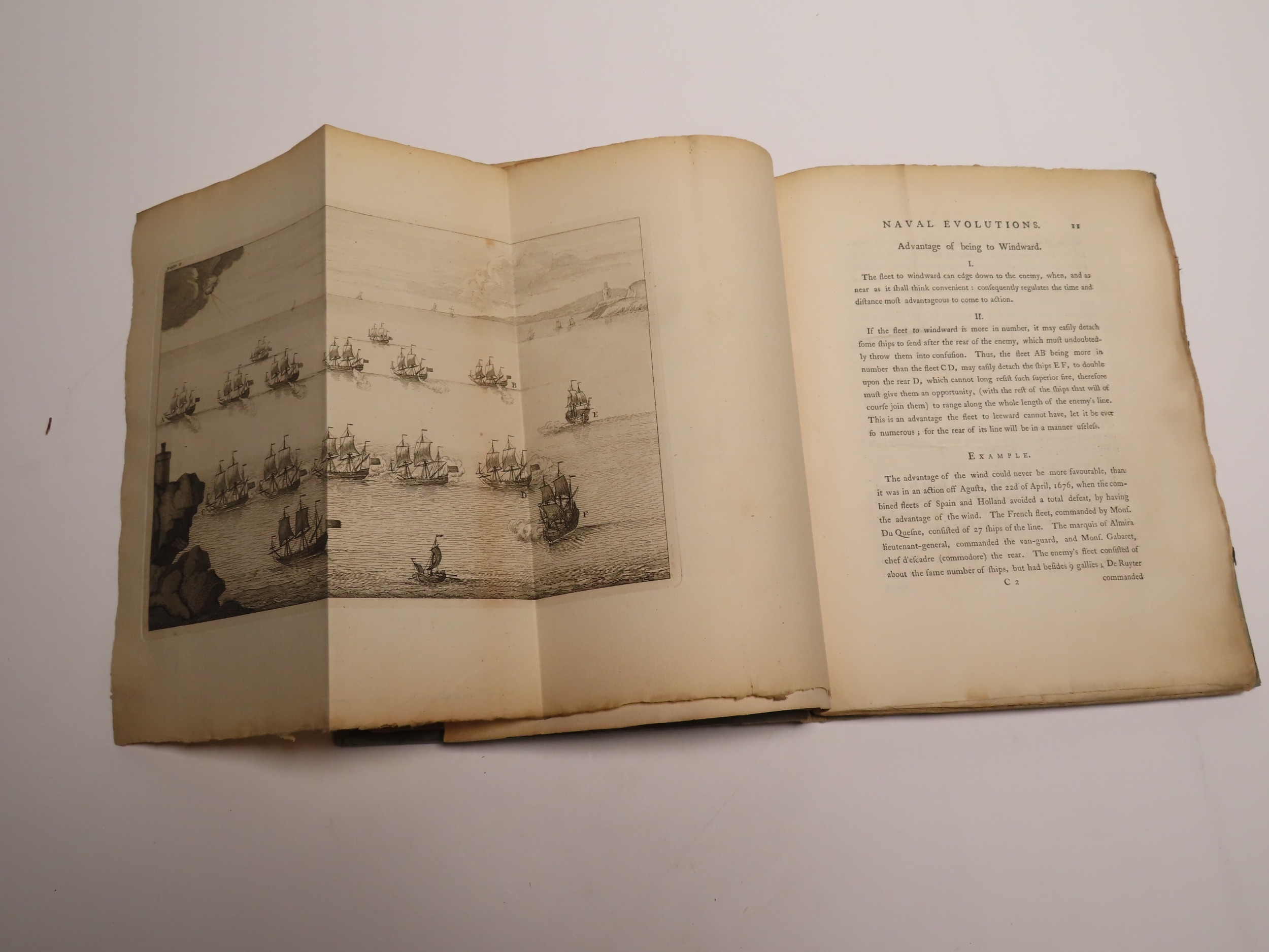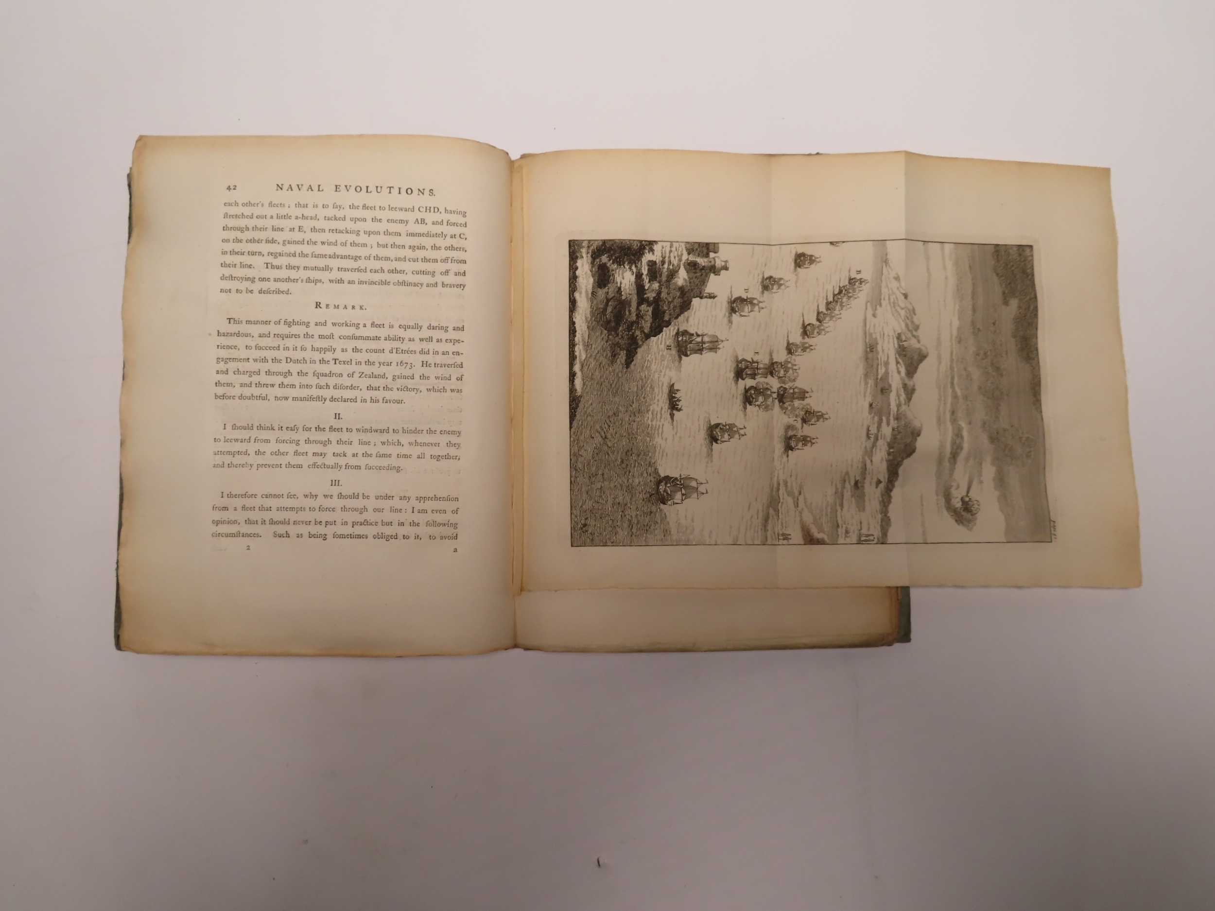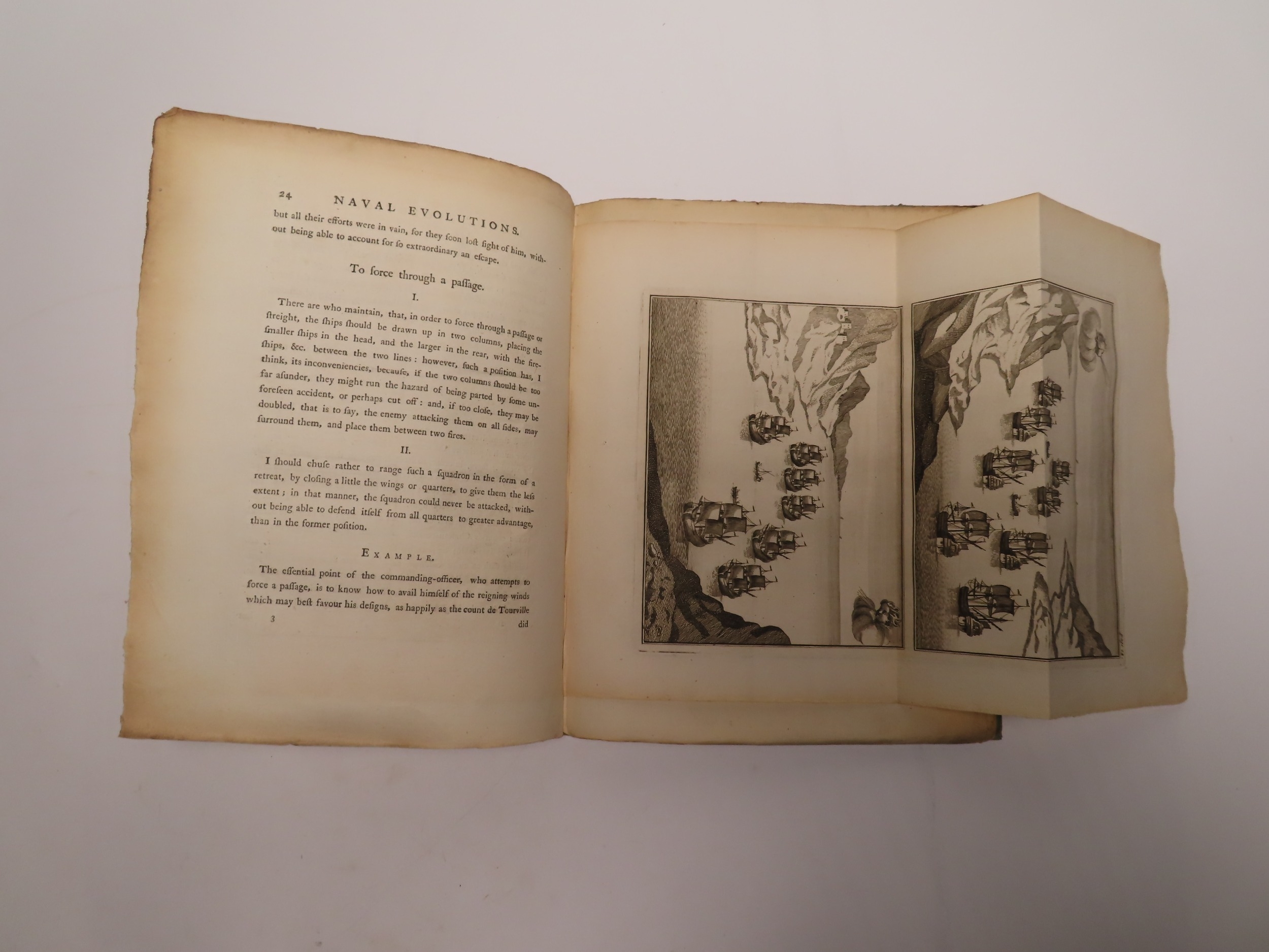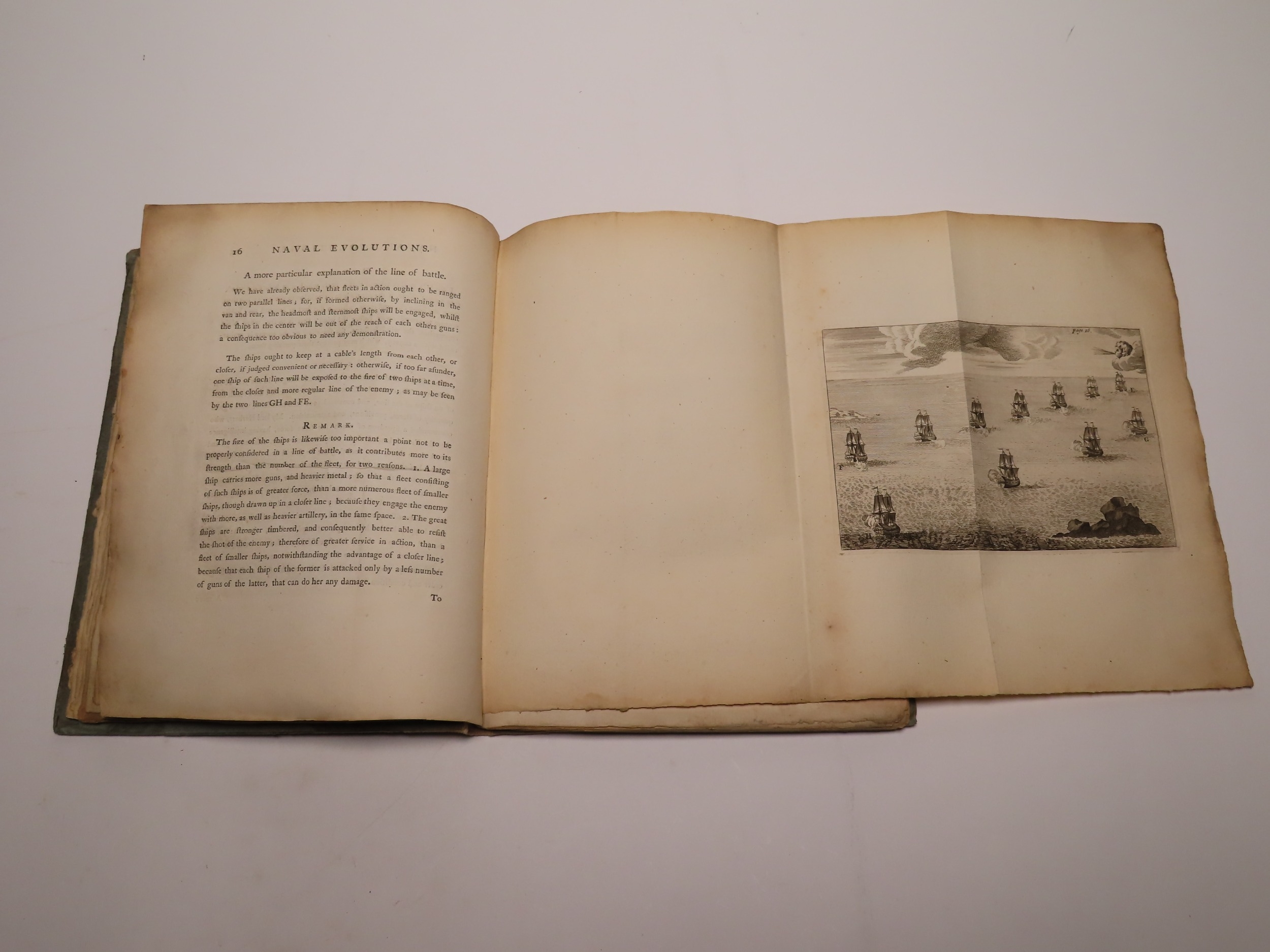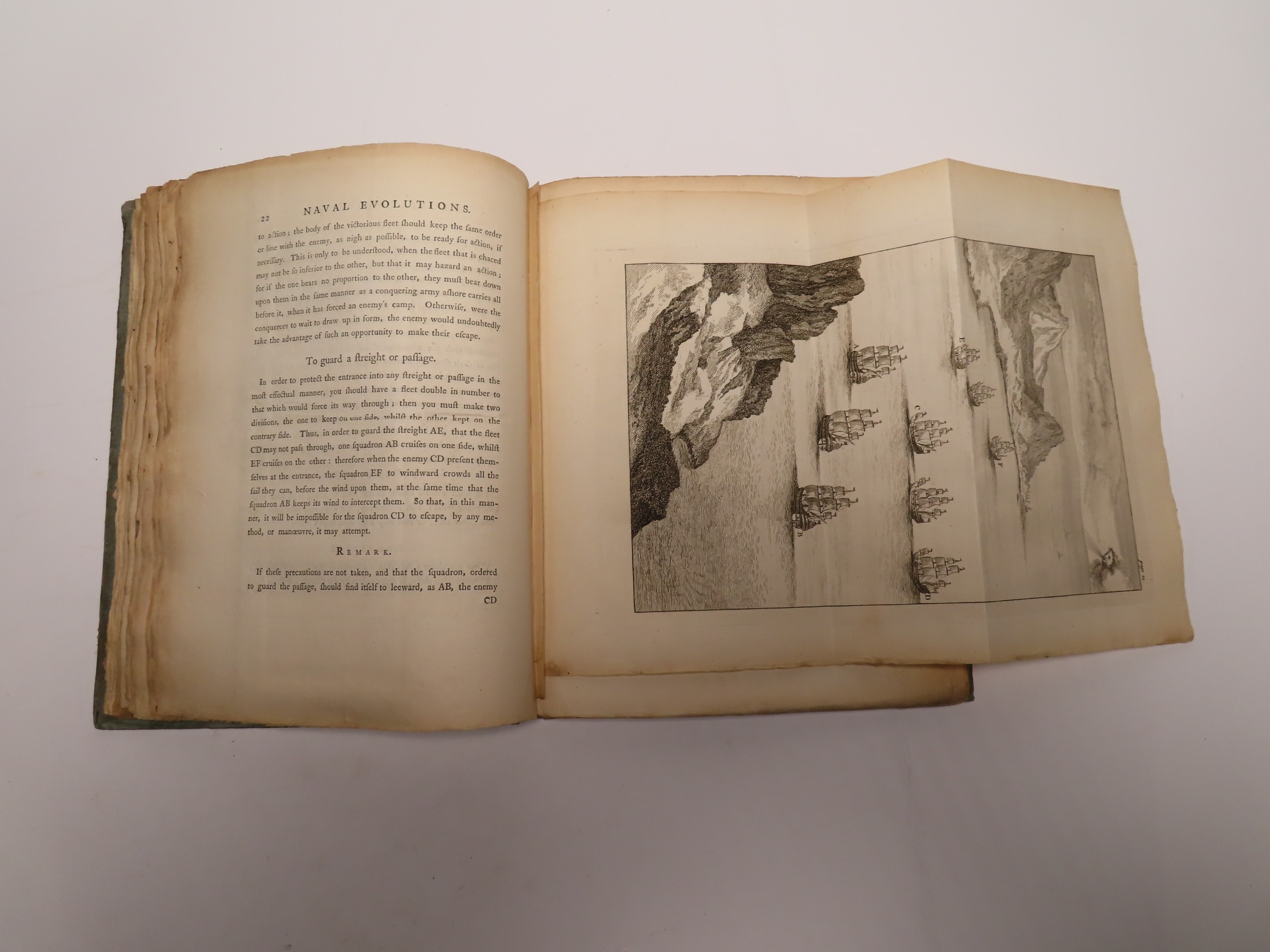 Naval Evolutions: or, a System of Sea-Discipline; extracted from the Celebrated Treatise of P. L'Hoste..., London, W. Johnston, 1762, 18 folding engraved plates, with the final leaf of ‘Ships lost by the English during the present war’ and errata, original boards with paper label on spine, lower fore-corner of front cover repaired, unopened, Sir Home Riggs Popham’s signature on front paste-down endpaper -- 9½ x 11½in. (24 x 29cm.)