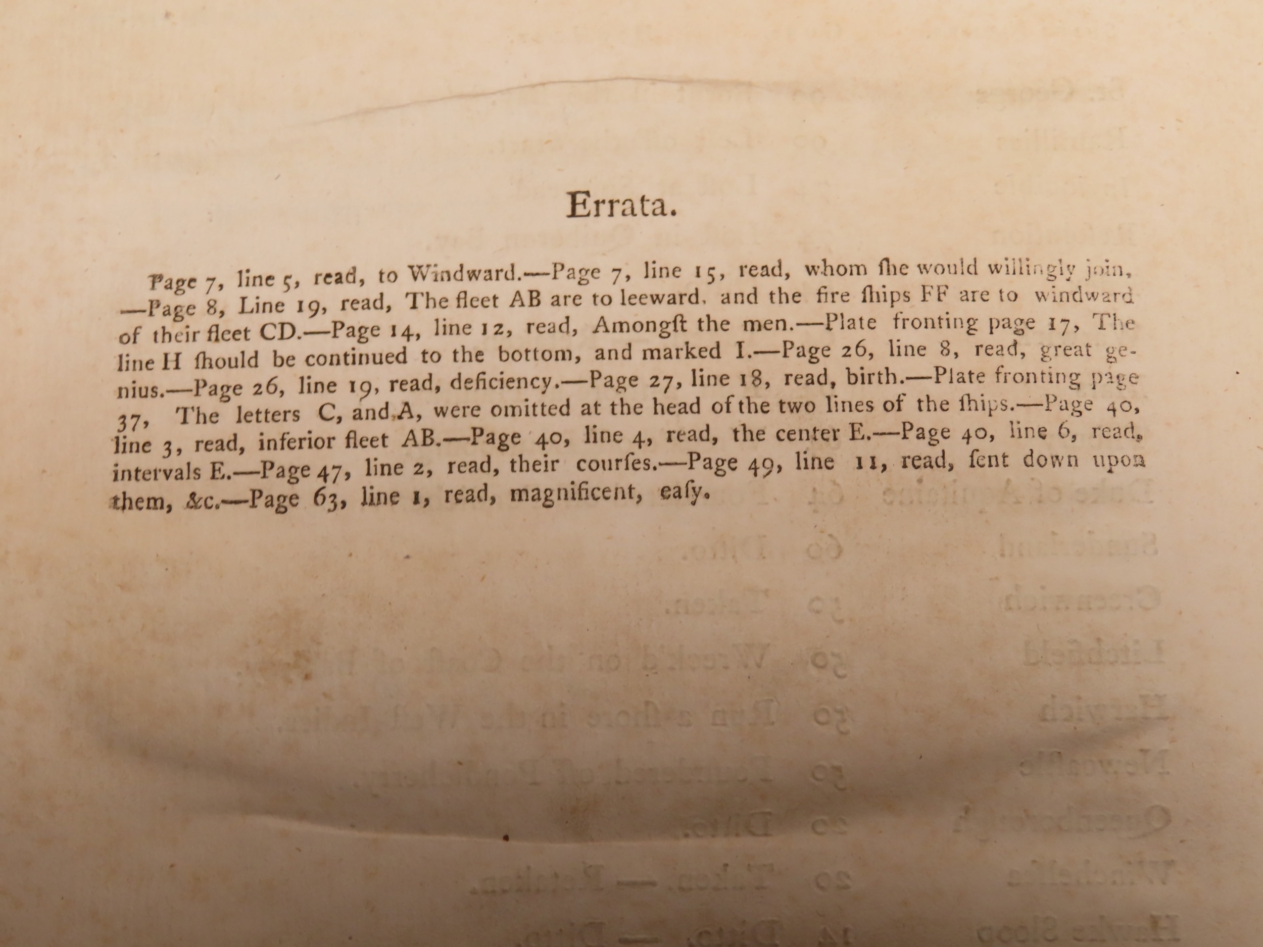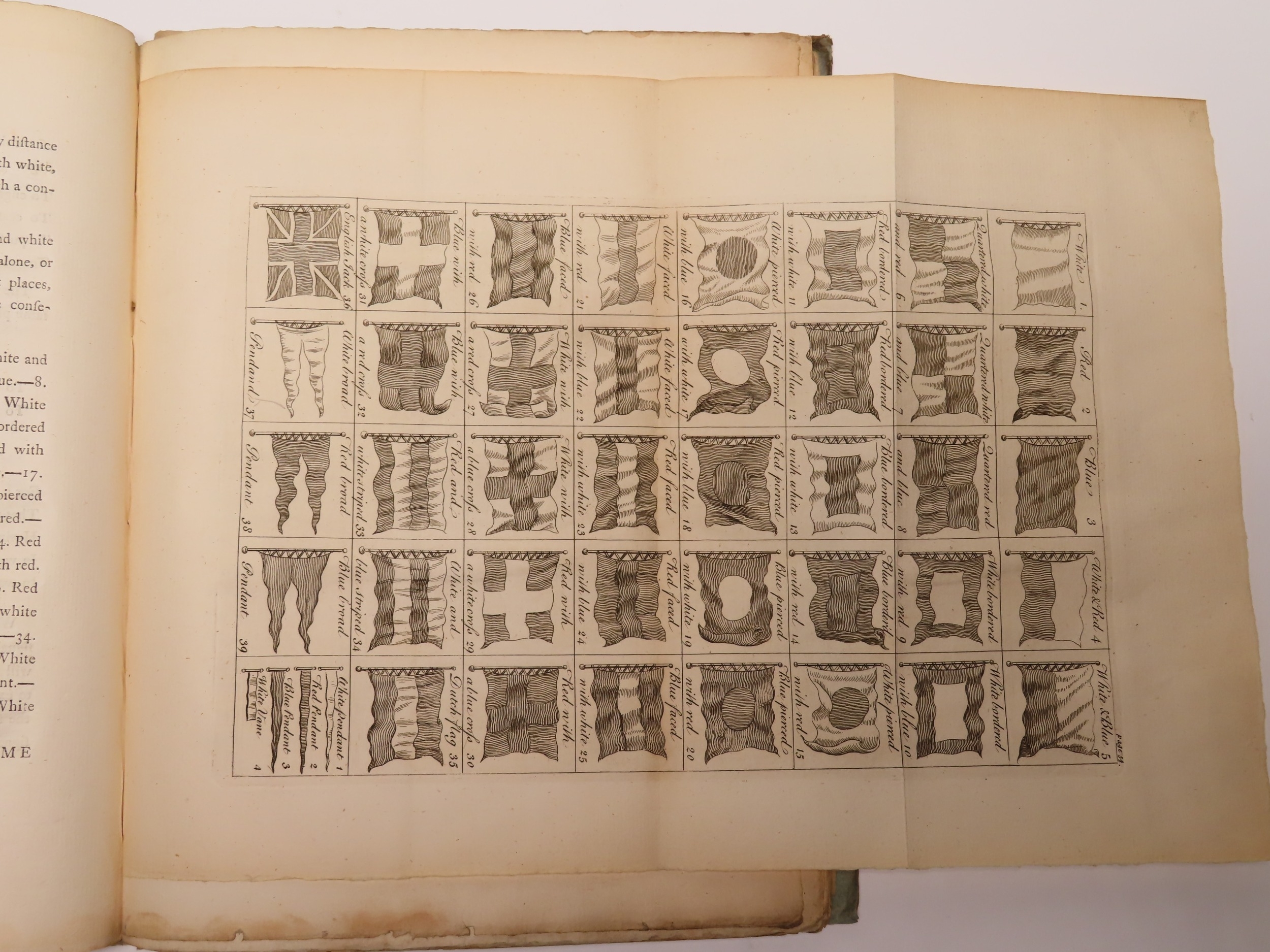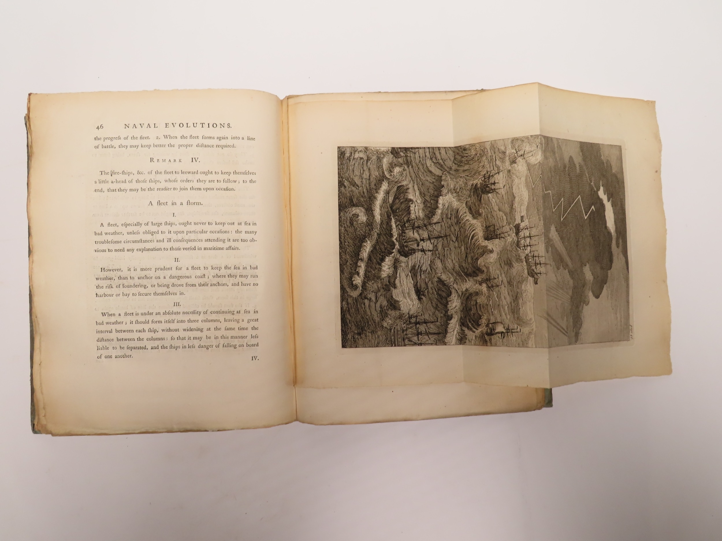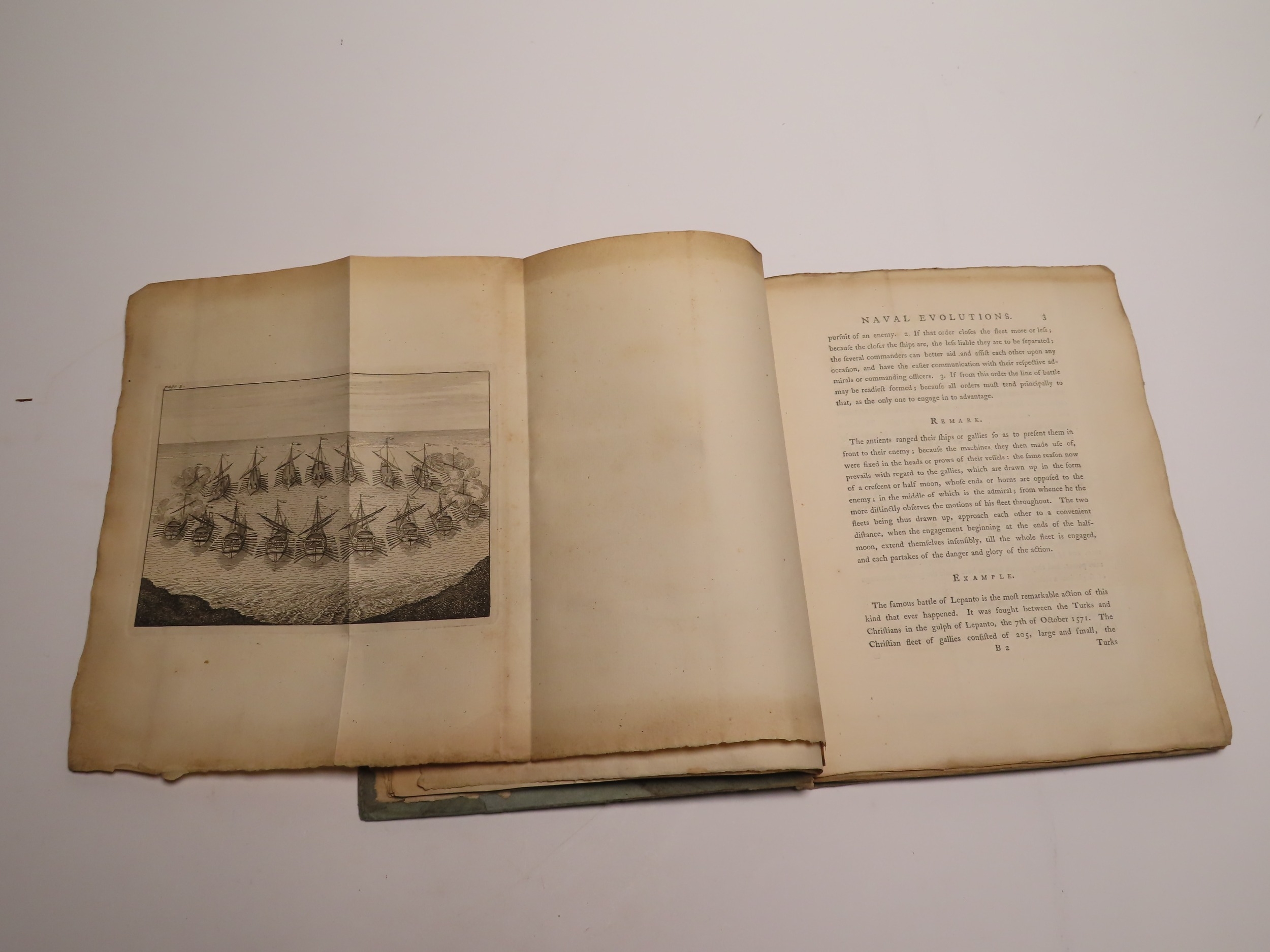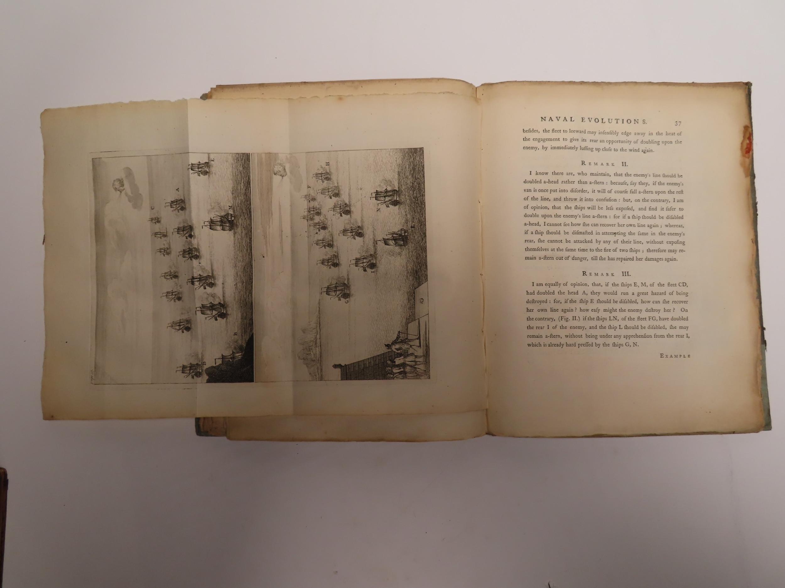Naval Evolutions: or, a System of Sea-Discipline; extracted from the Celebrated Treatise of P. L'Hoste..., London, W. Johnston, 1762, 18 folding engraved plates, with the final leaf of ‘Ships lost by the English during the present war’ and errata, original boards with paper label on spine, lower fore-corner of front cover repaired, unopened, Sir Home Riggs Popham’s signature on front paste-down endpaper -- 9½ x 11½in. (24 x 29cm.)