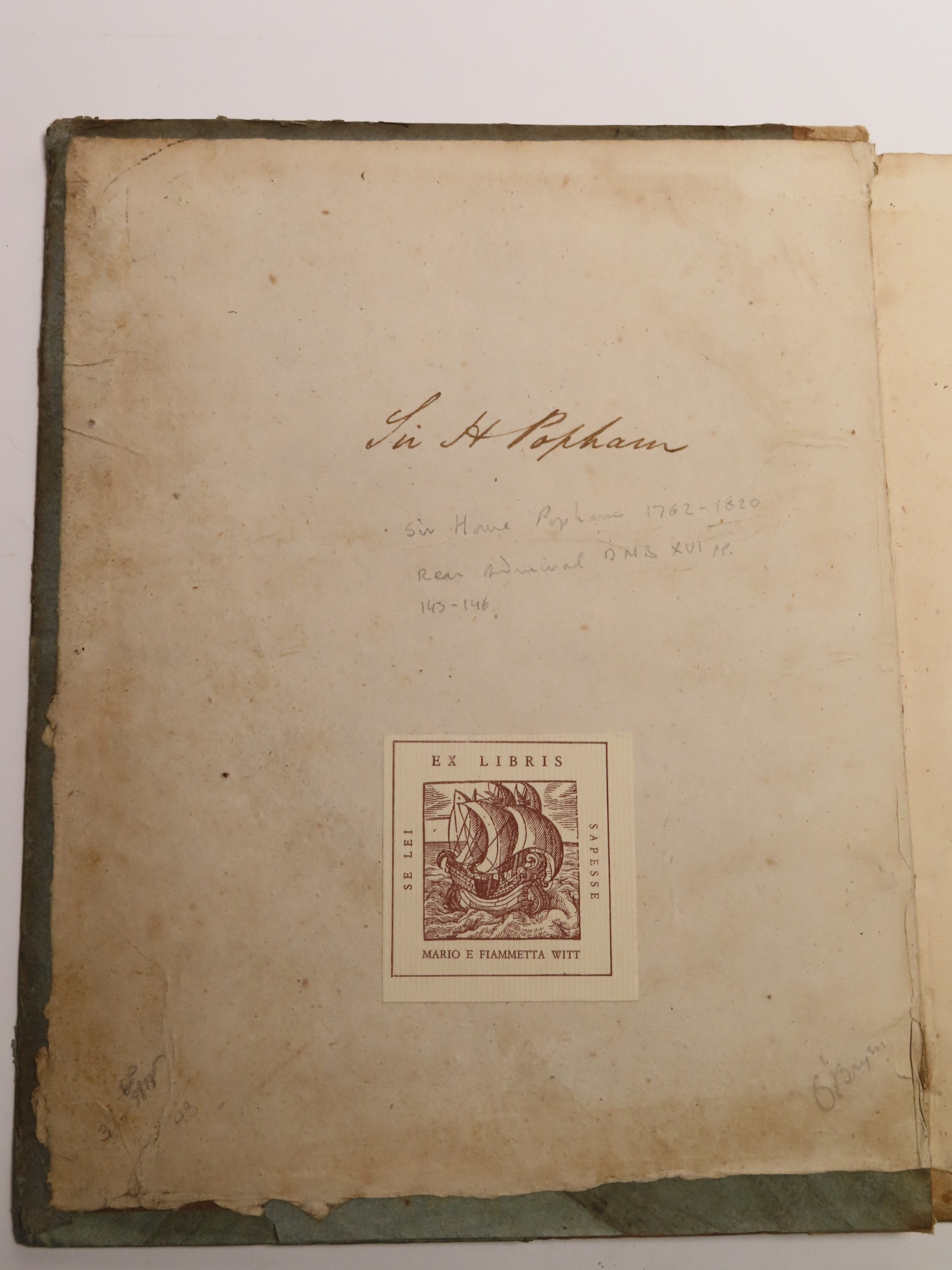 Popham’s invention of his telegraphic code was used (and greatly admired) by Nelson in the West Indies and at Trafalgar; book-label of the booksellers Mario and Fiammetta Witt. Hoste’s magisterial L’art des armées navales was first published in 1697.