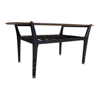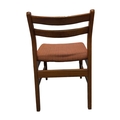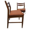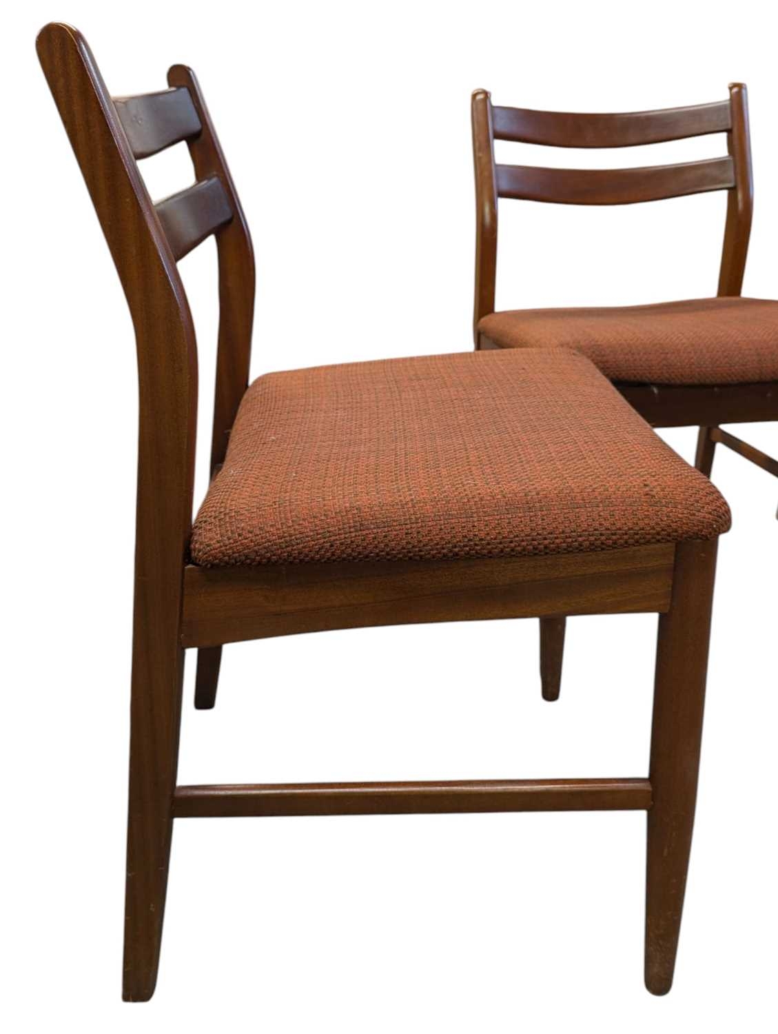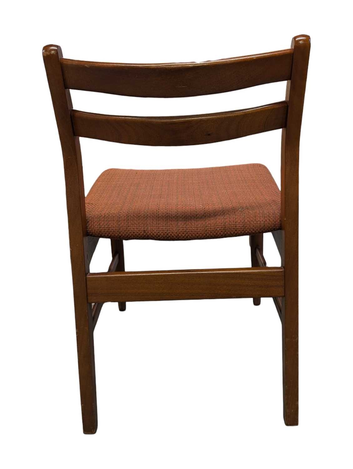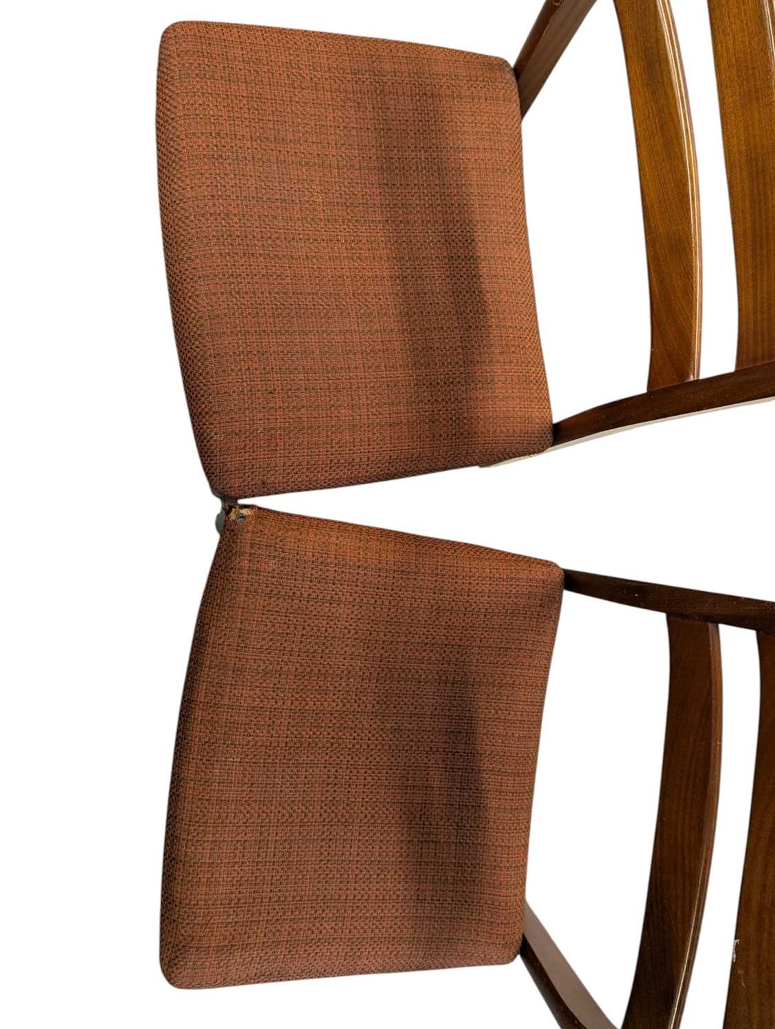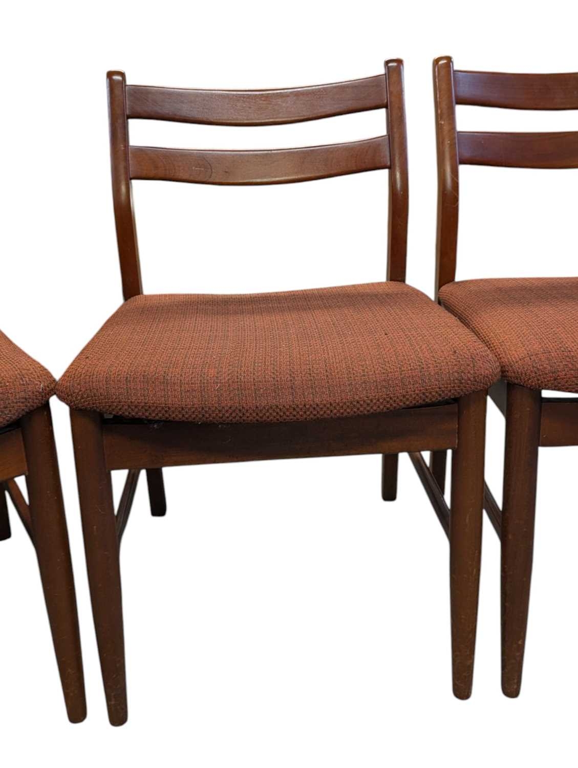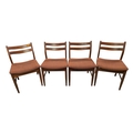 British Modern Design - Set of four mid century teak dining chairs. Angled back splats with padded seat on tapering legs. Measuring approx 77cm x 43cm x 48cm.