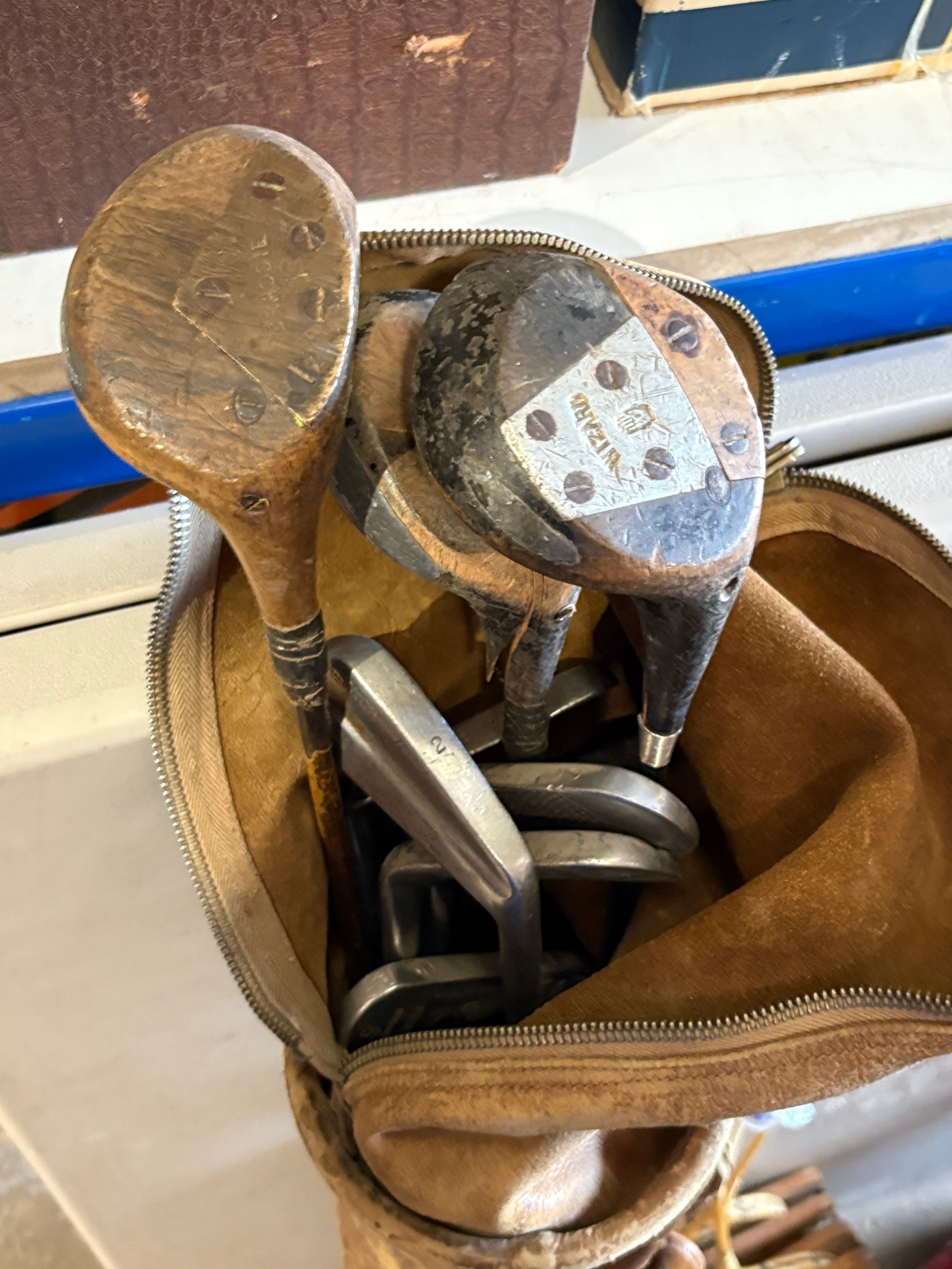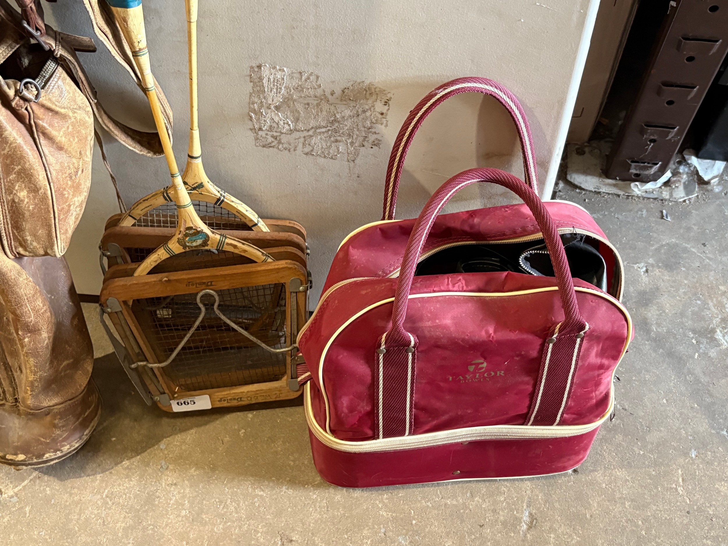 Vintage/antique set of golf clubs, a set of bowls and two vintage tennis rackets