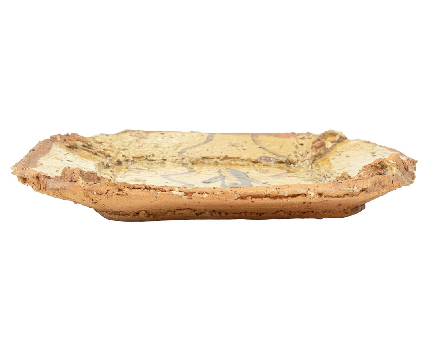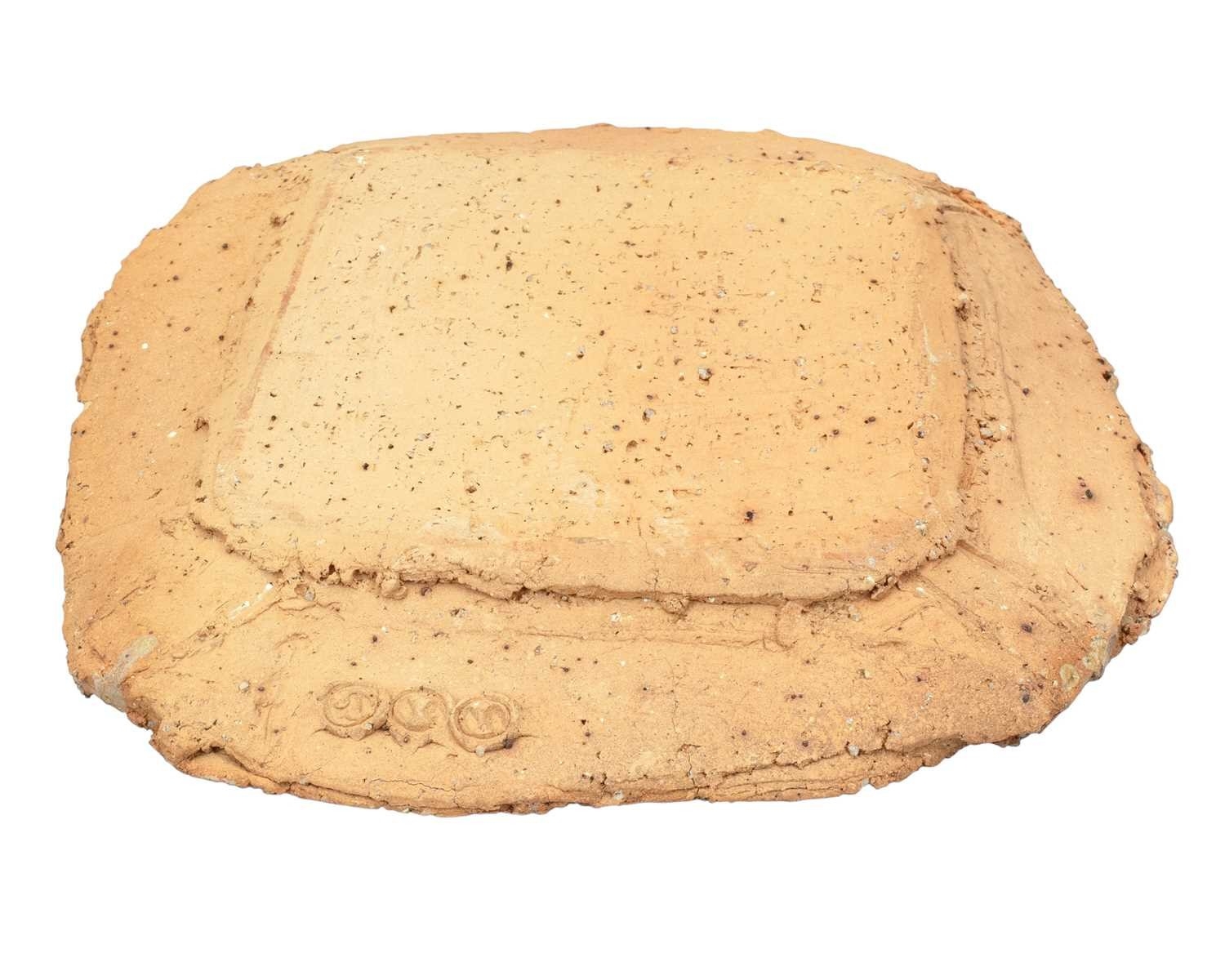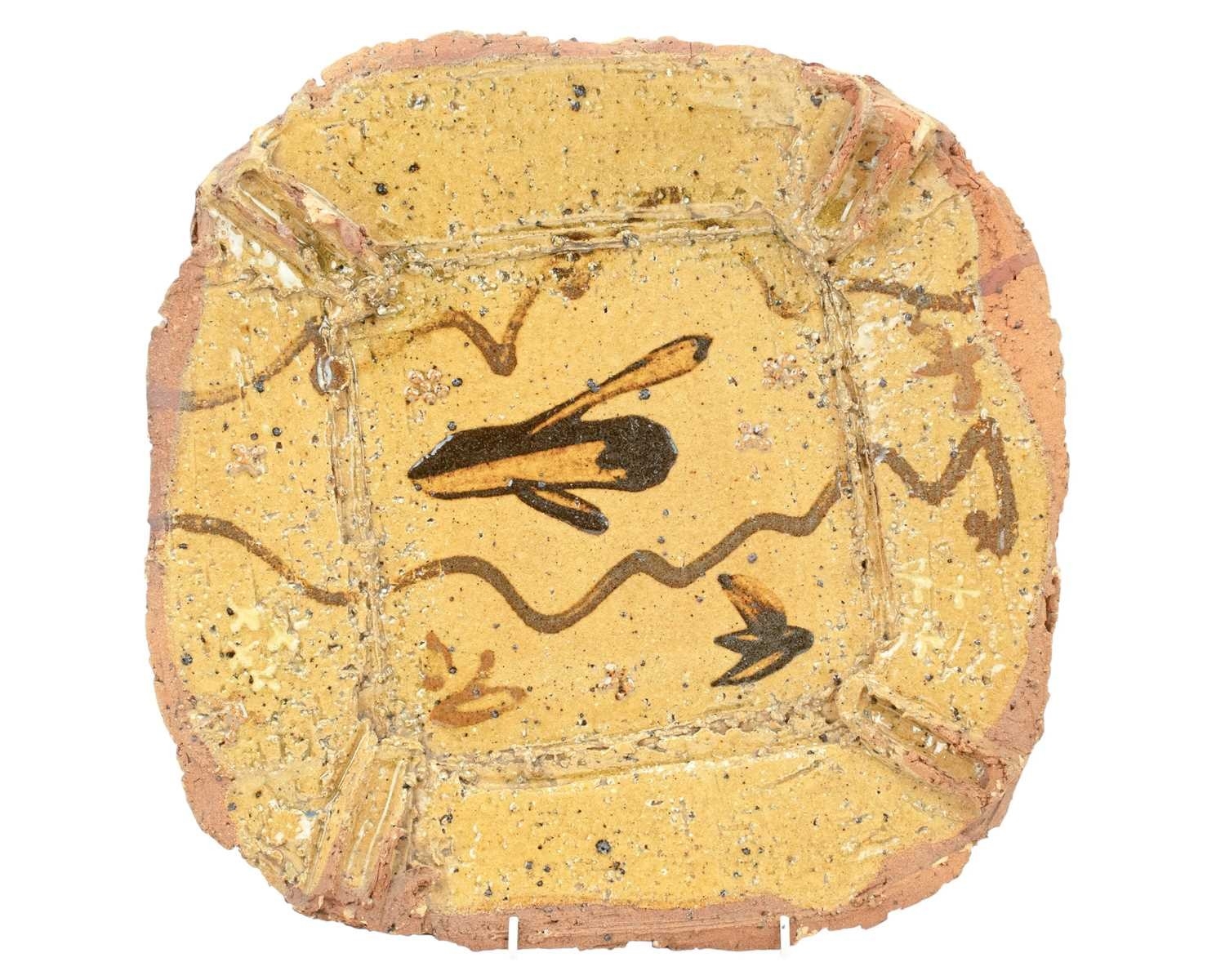 Peter SMITH (1941-2025), a square slip decorated pottery dish. With applied decoration, multiple seal marks, 35cm square, approximately. The collection of the late potter Peter Smith of Bojewyan Pottery in West Cornwall. Fellow of the Craftsman Potters Association, member of Newlyn Society of Artists and later chairman of Newlyn Gallery. Peter was also an influential teacher of ceramics at Falmouth University, where he encouraged a spontaneous and improvised approach based on developing technique and an understanding of the medium of clay as an expressive and practical form. Peter originally started as a research chemist before turning to pottery after attending evening classes. He started his own pottery at Bojewyan in West Cornwall in 1974. As well as being a renowned and experimental potter and tutor, he was also a keen collector of medieval and later pottery from the UK and further afield. His Guardian obituary can be read here:https://www.theguardian.com/artanddesign/2025/aug/13/peter-smith-obituary