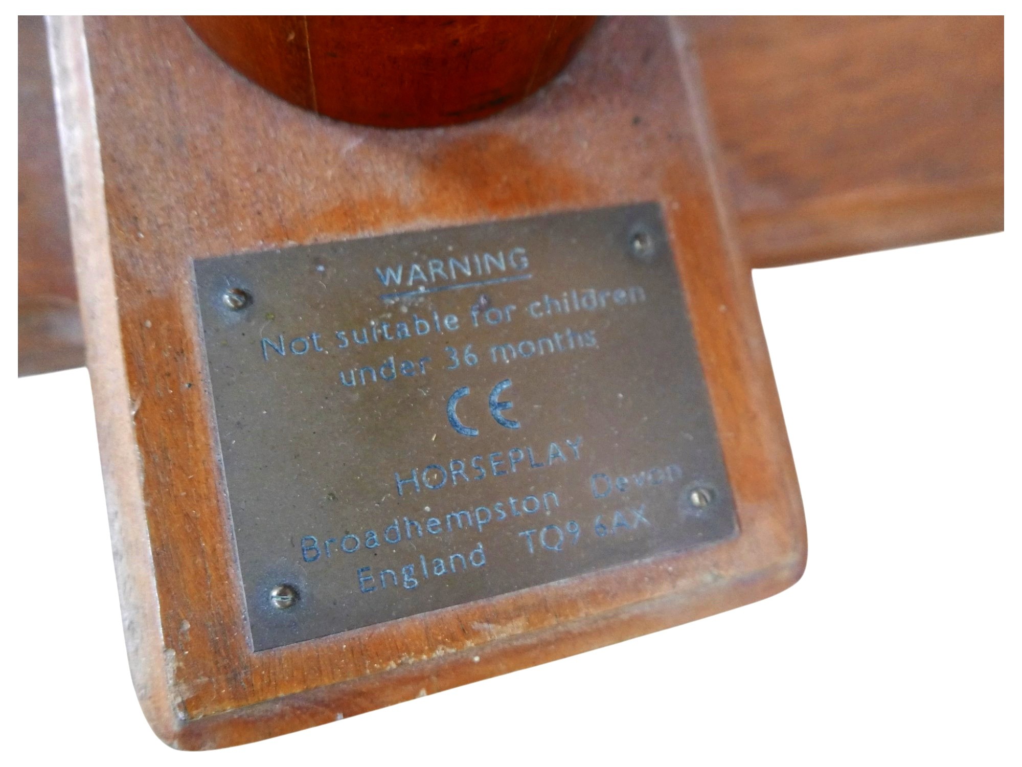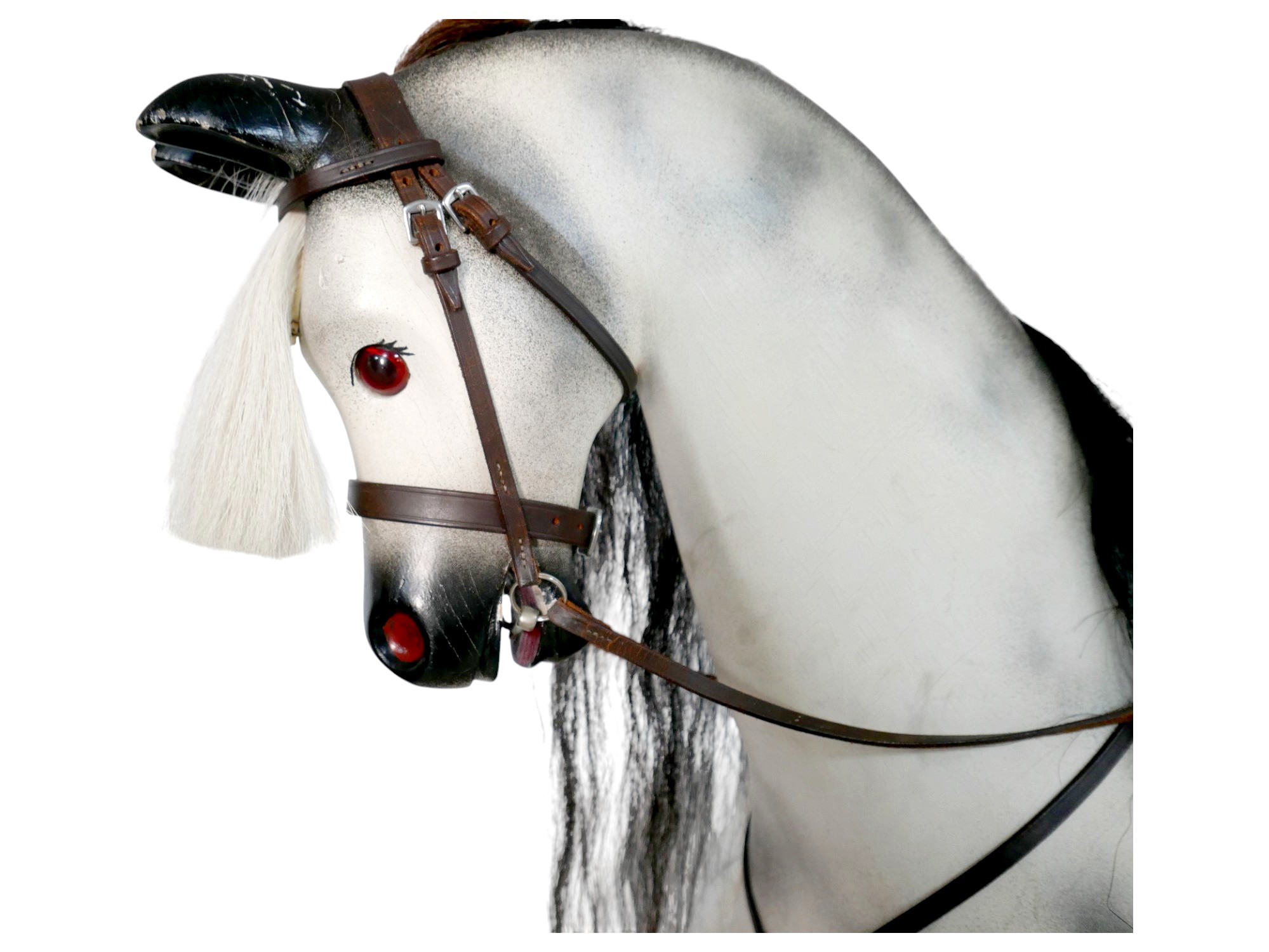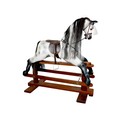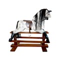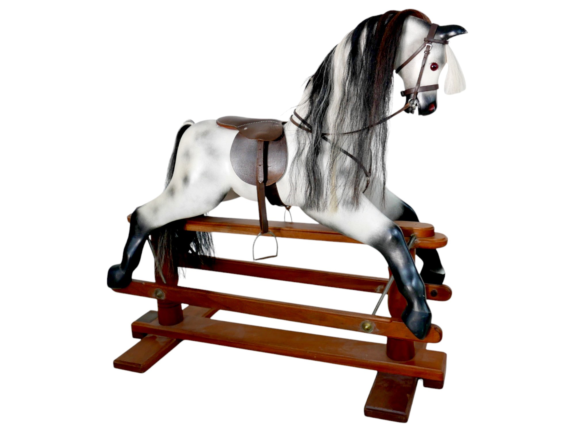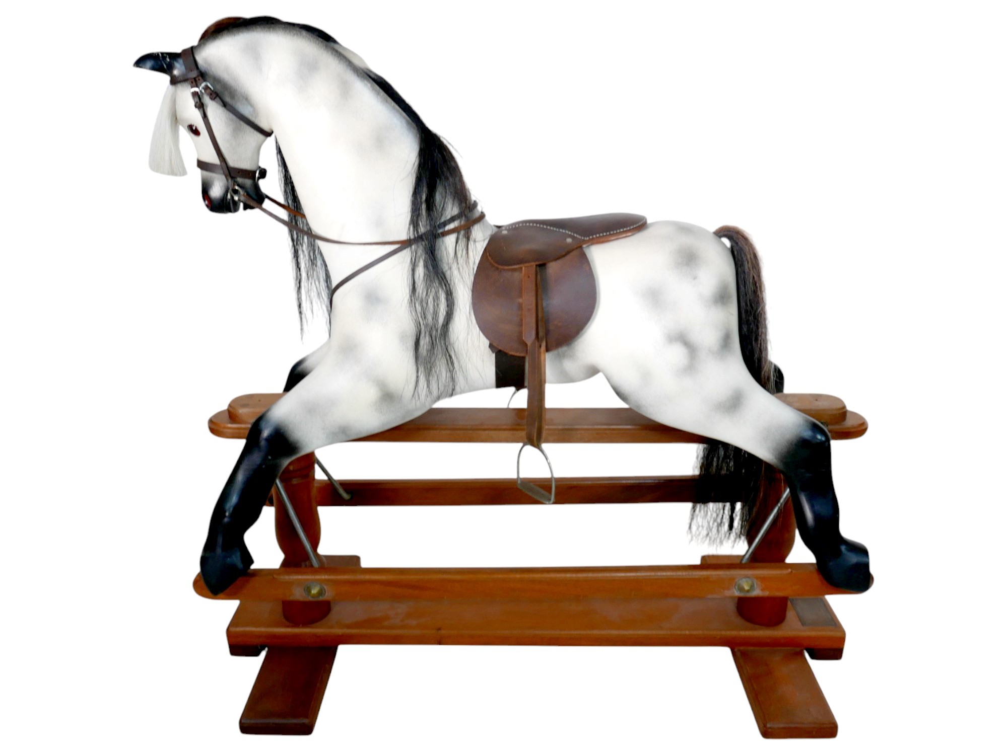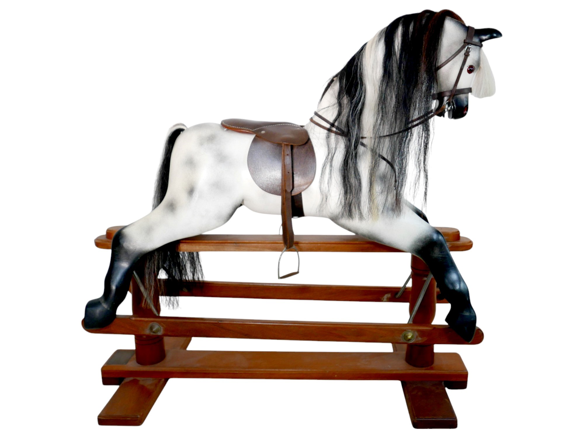 A piebald wooden rocking horse by Horseplay with leather saddle and tack, 127 by 45 by 120cm high.
