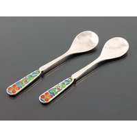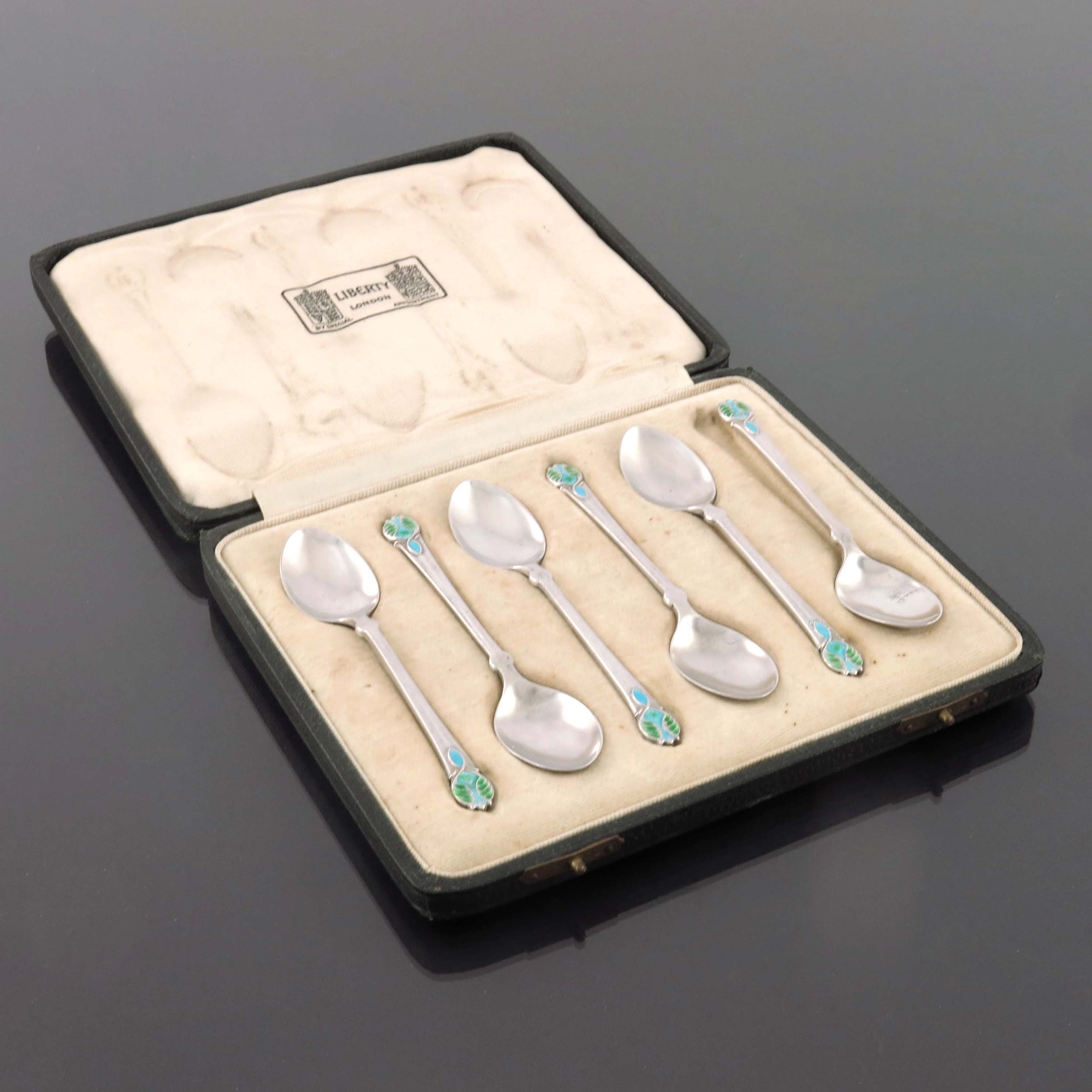 Liberty and Co., a set of six silver and enamelled coffee spoons, Birmingham 1921, cast fluted form with foliate terminals in pale blue and green enamel, in fitted Liberty box, 9.5cm long, 1.49ozt (6)