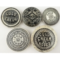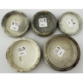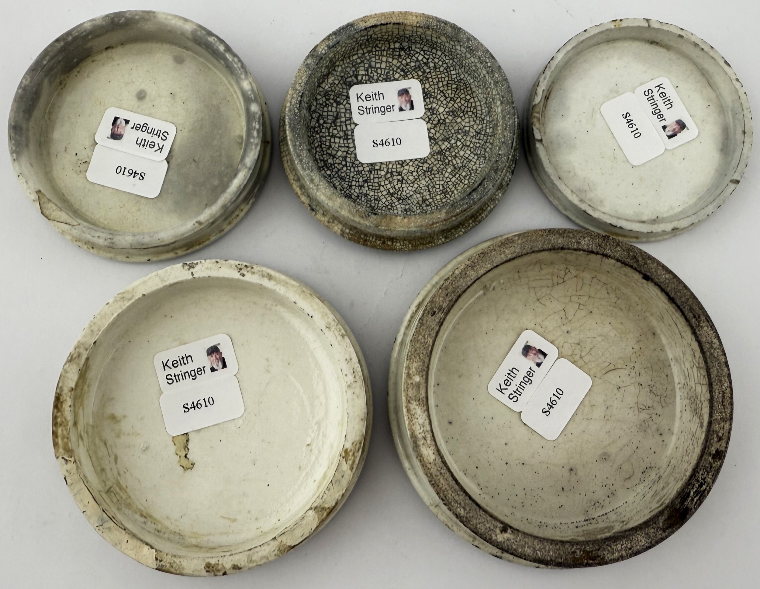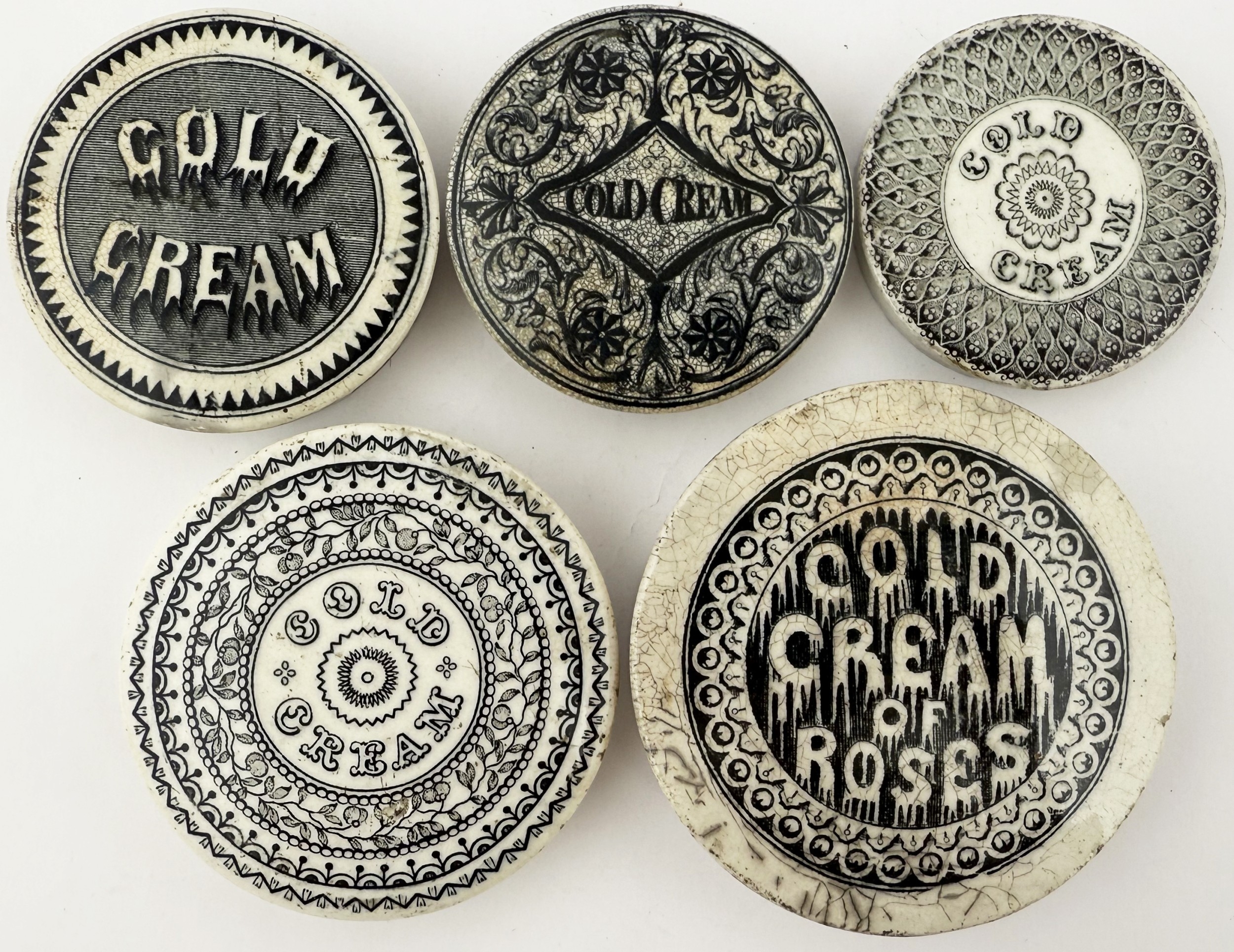 COLD CREAM POT LID GROUP. Largest 3.25ins. Black transfer. Various designs. Chips, repairs & discolouration. (5)