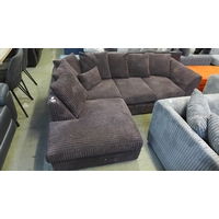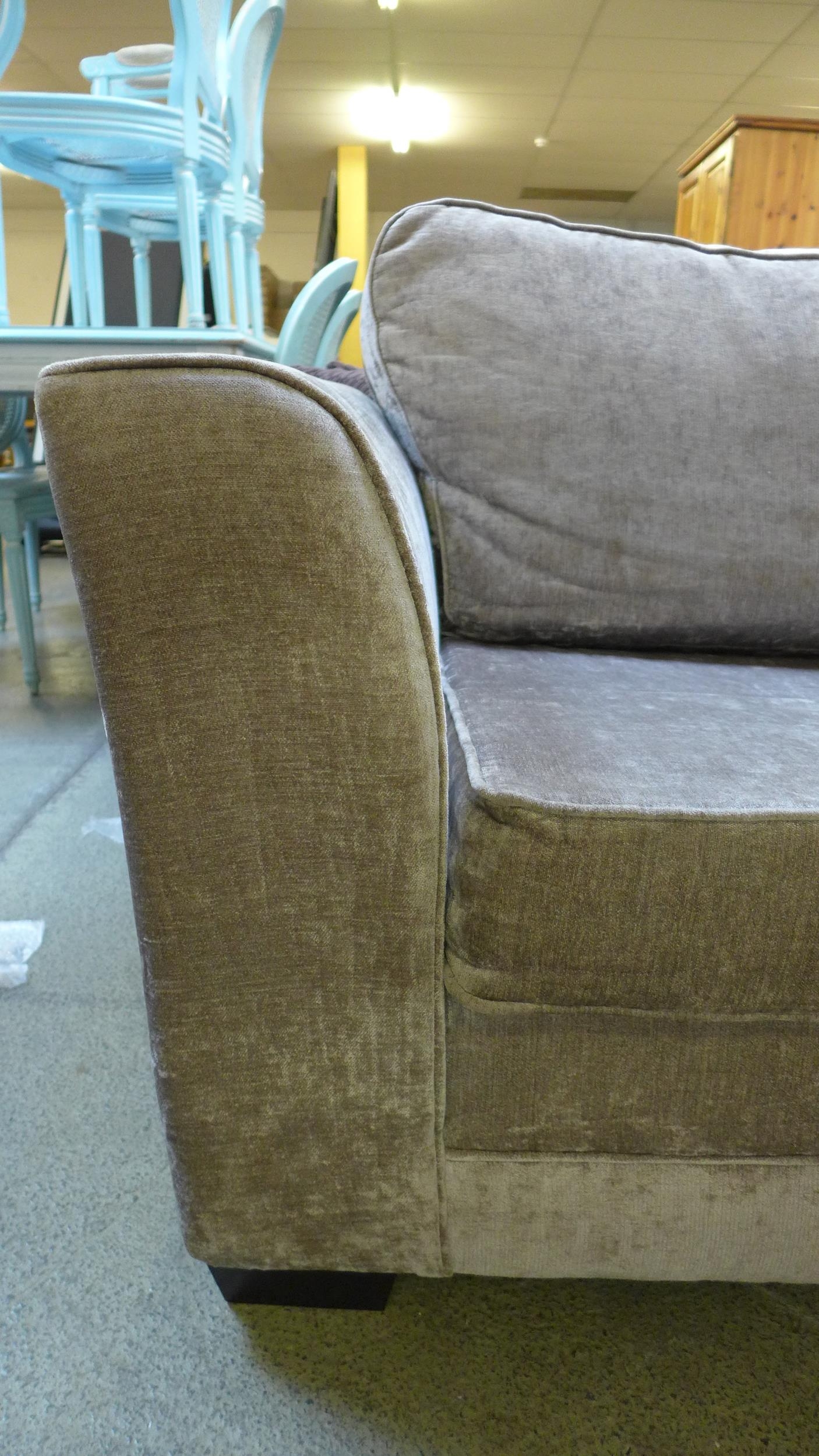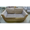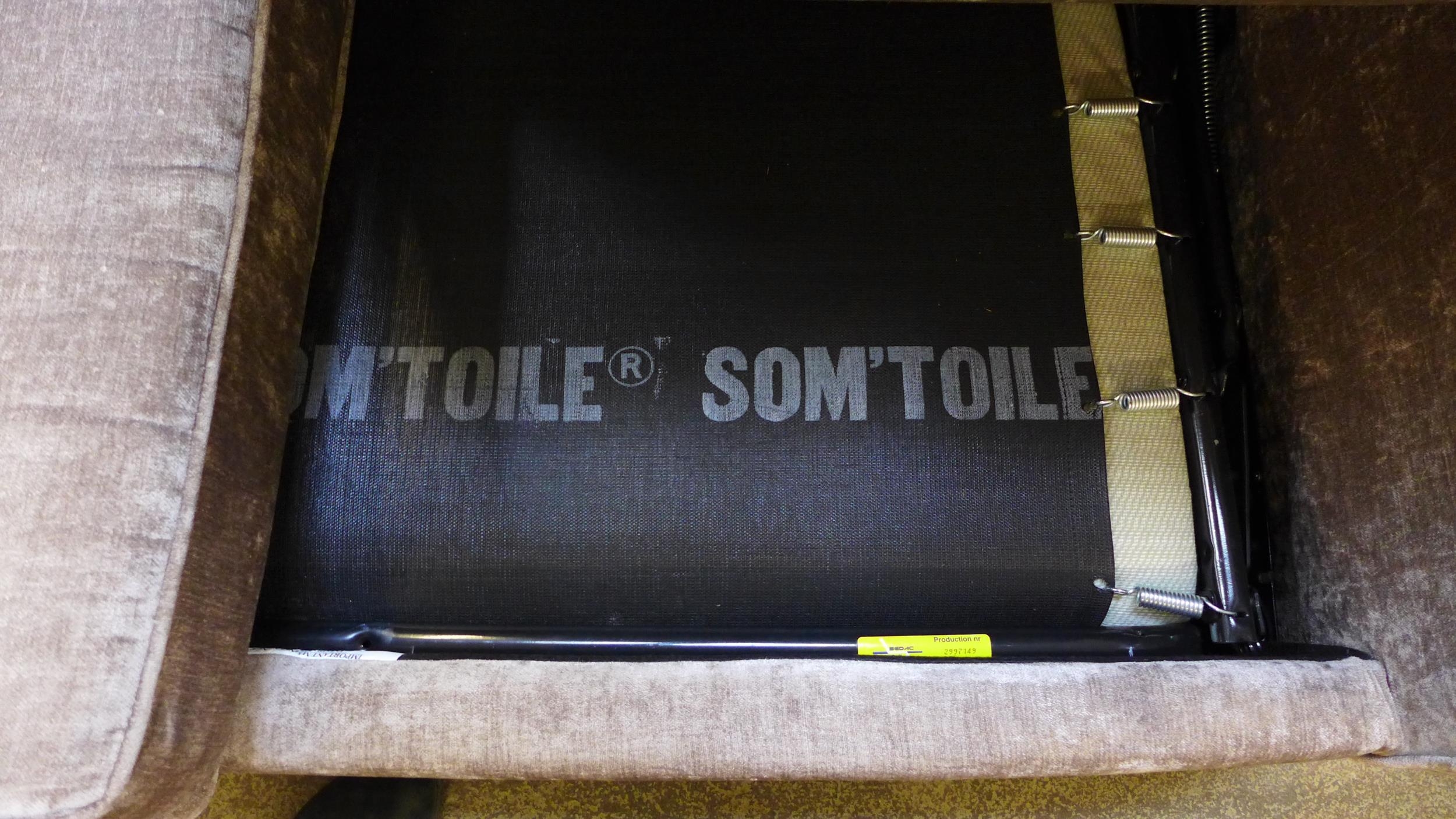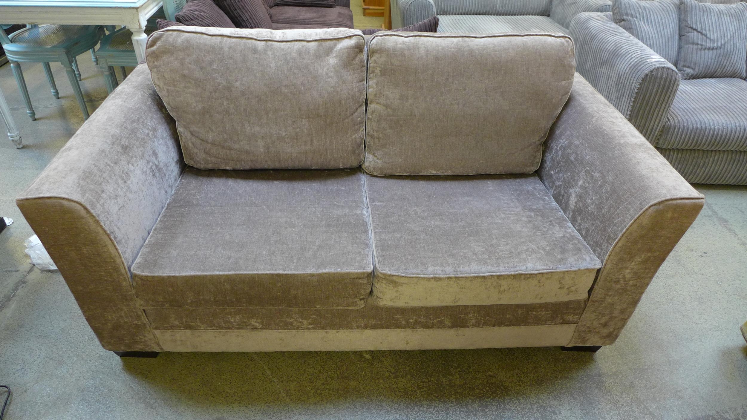 A grey/mink velvet upholstered two seater metal action sofa bed