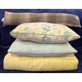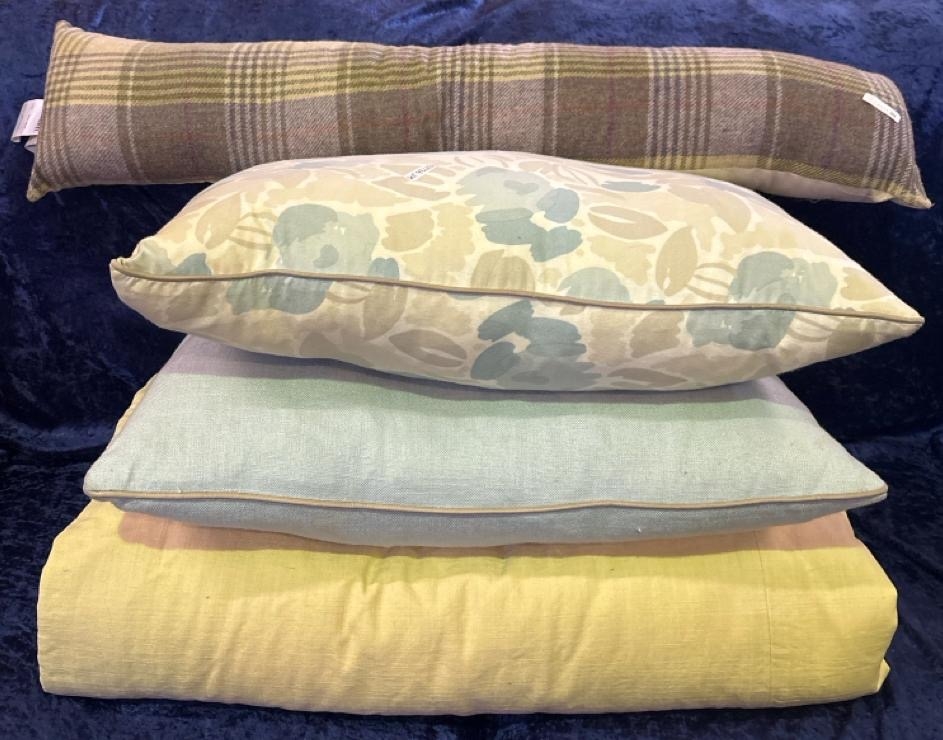 Pair of cream curtains, two cushions and a draught excluder.