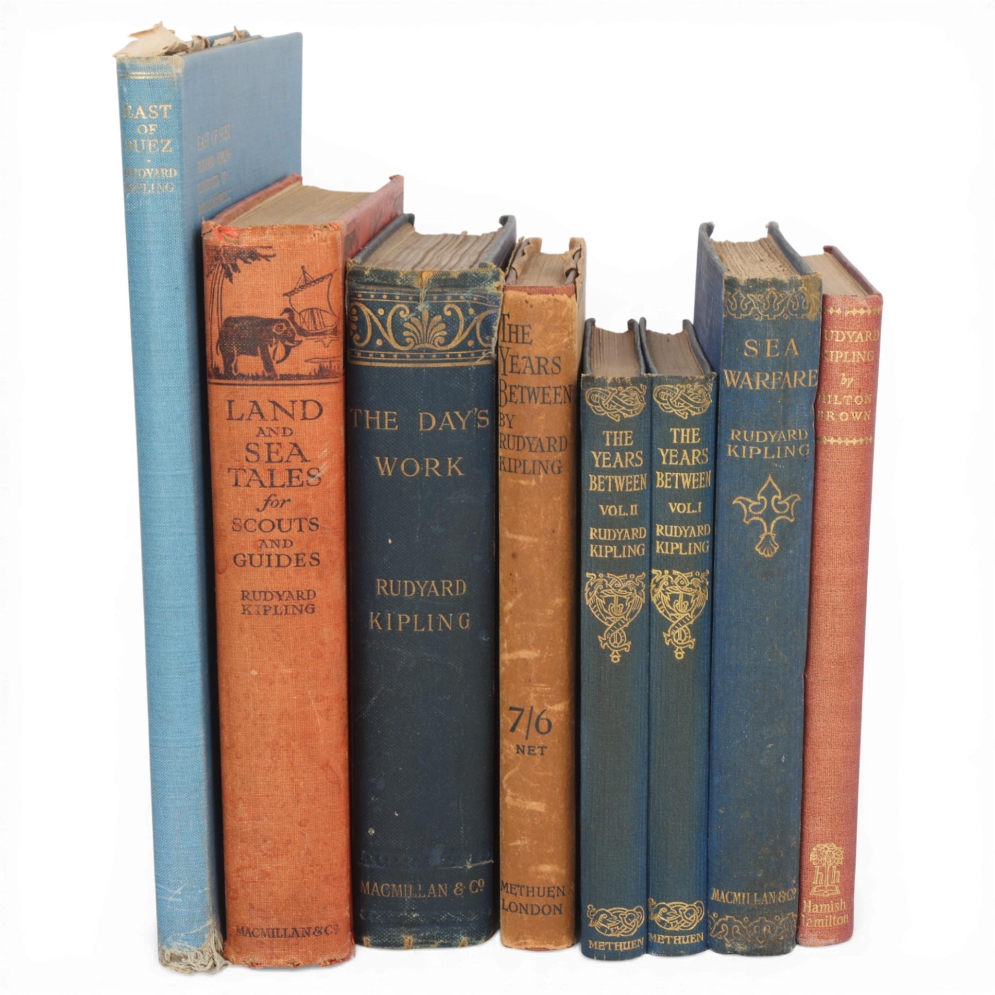 Rudyard Kipling, 8 books including The Years Between Vol I & II Service Edition, Methuen & Co London, 1919 and another 1919 edition with original dust cover, East of Suez, MacMillan 1931, LAnd and Sea Tales for Scouts and Guides, MacMillan 1923, The Days Work, MacMillan 1898, Sea Warfare, MacMillan 1916 and Rudyard Kipling A New Appreciation by Hilton Brown, 1946