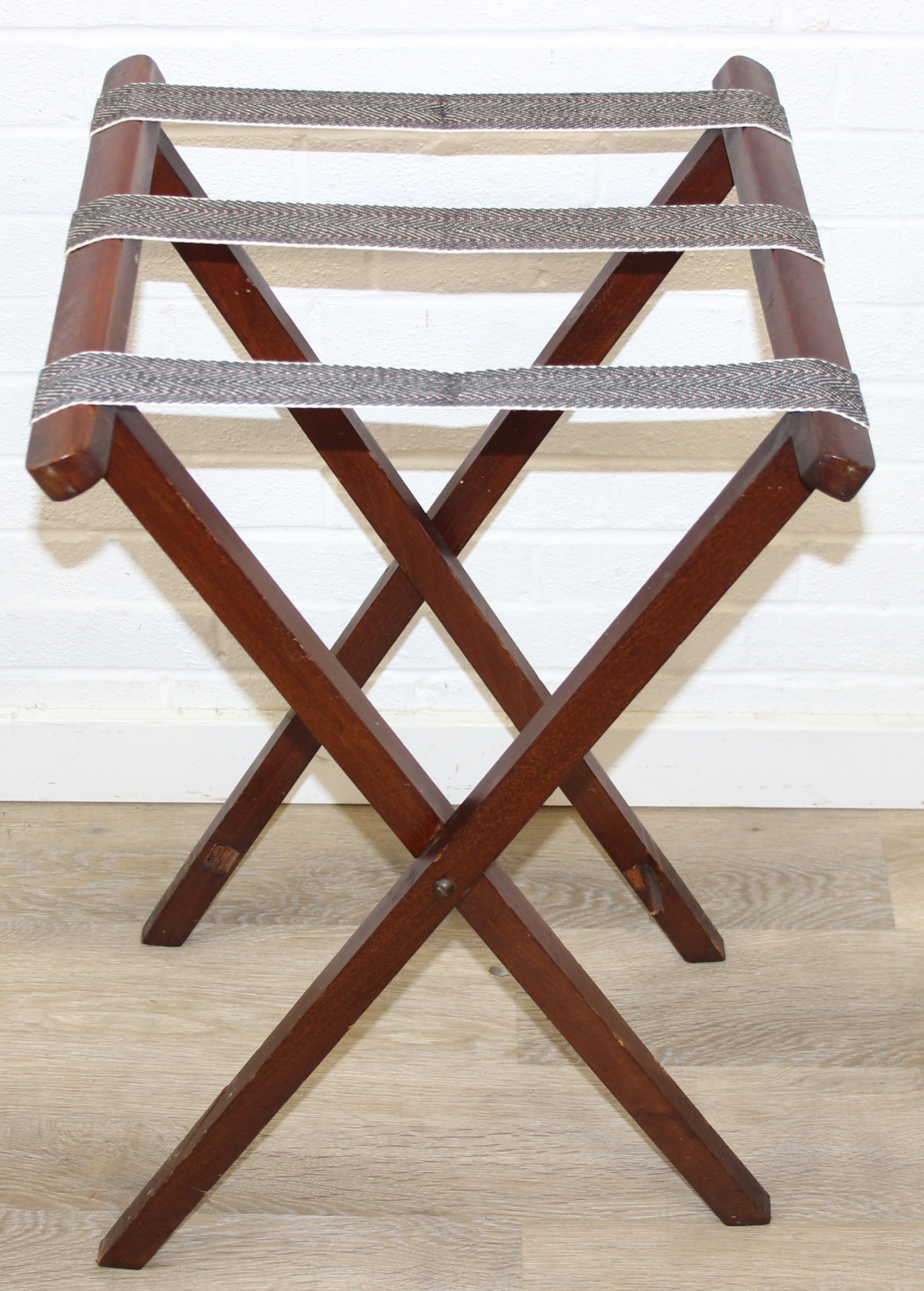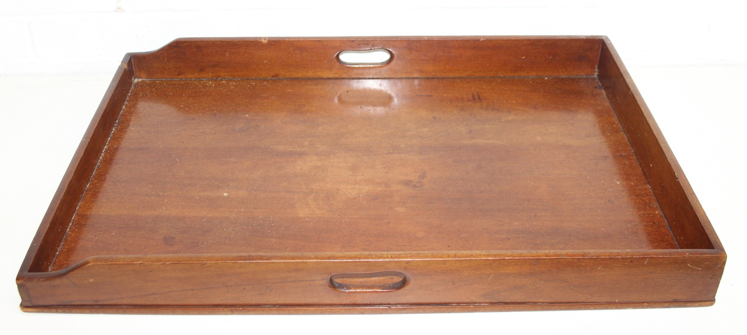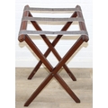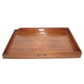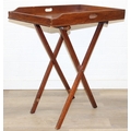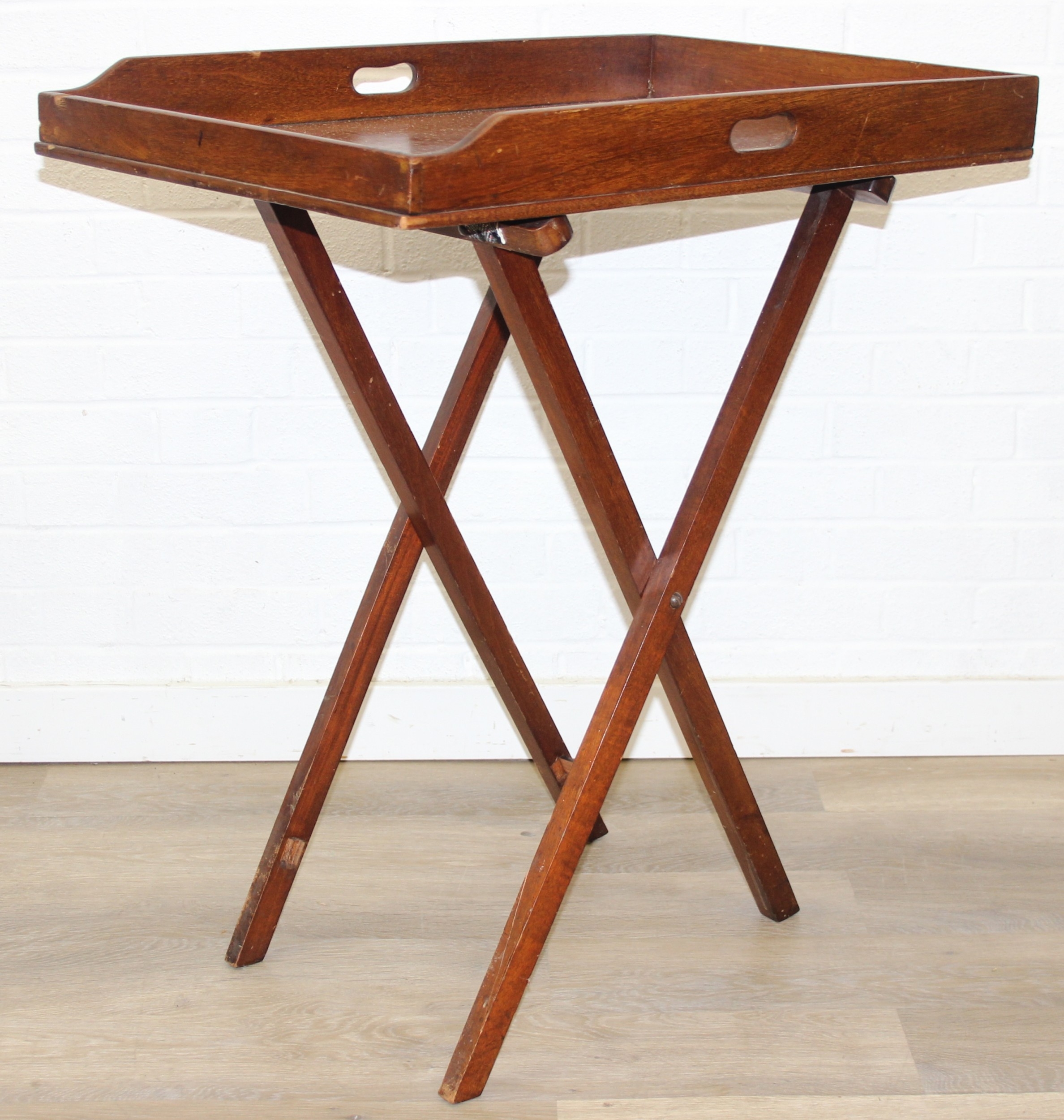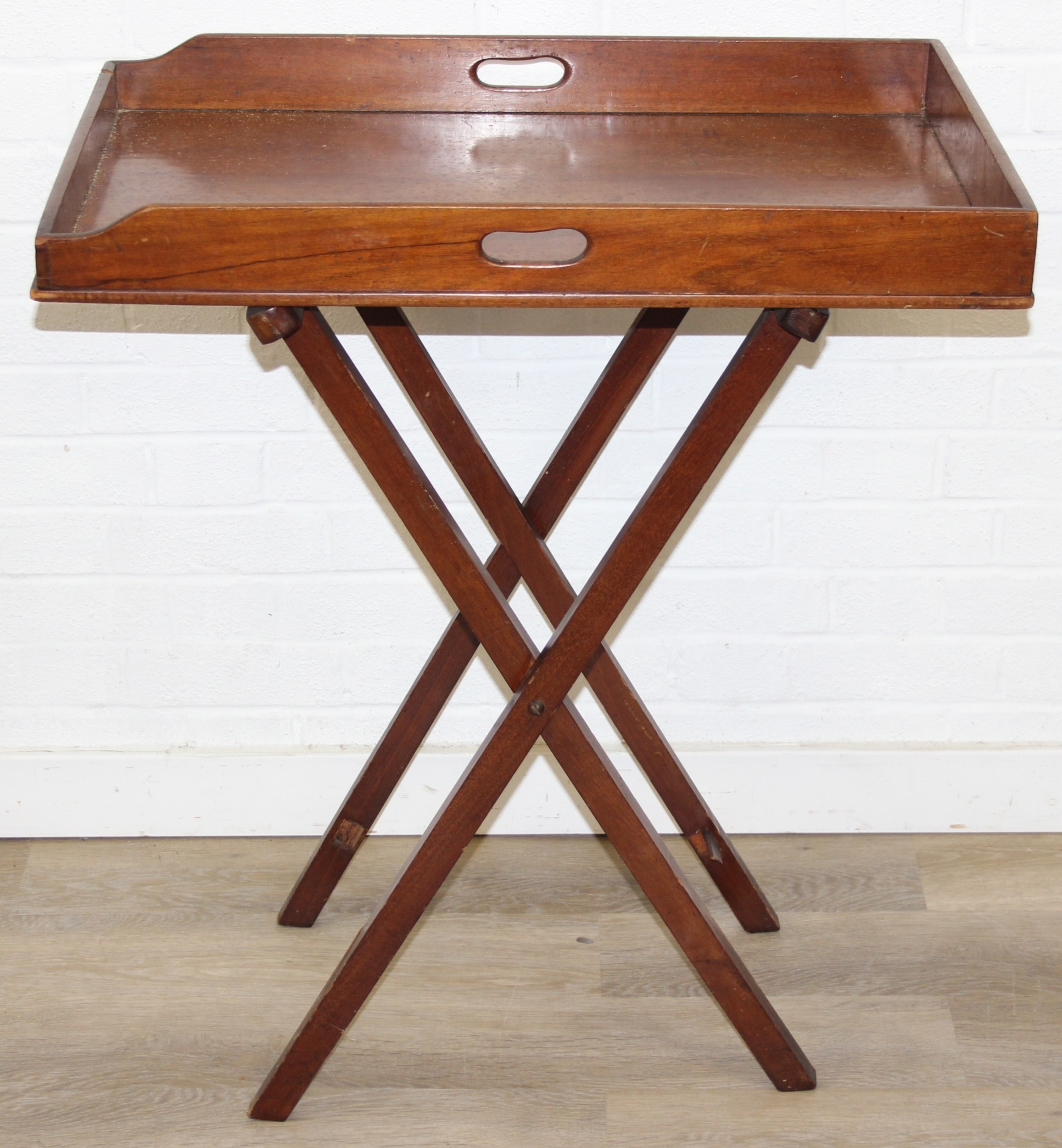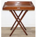 A vintage mahogany butler's serving tray on folding stand, 75cm x 49cm x 86cm