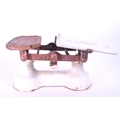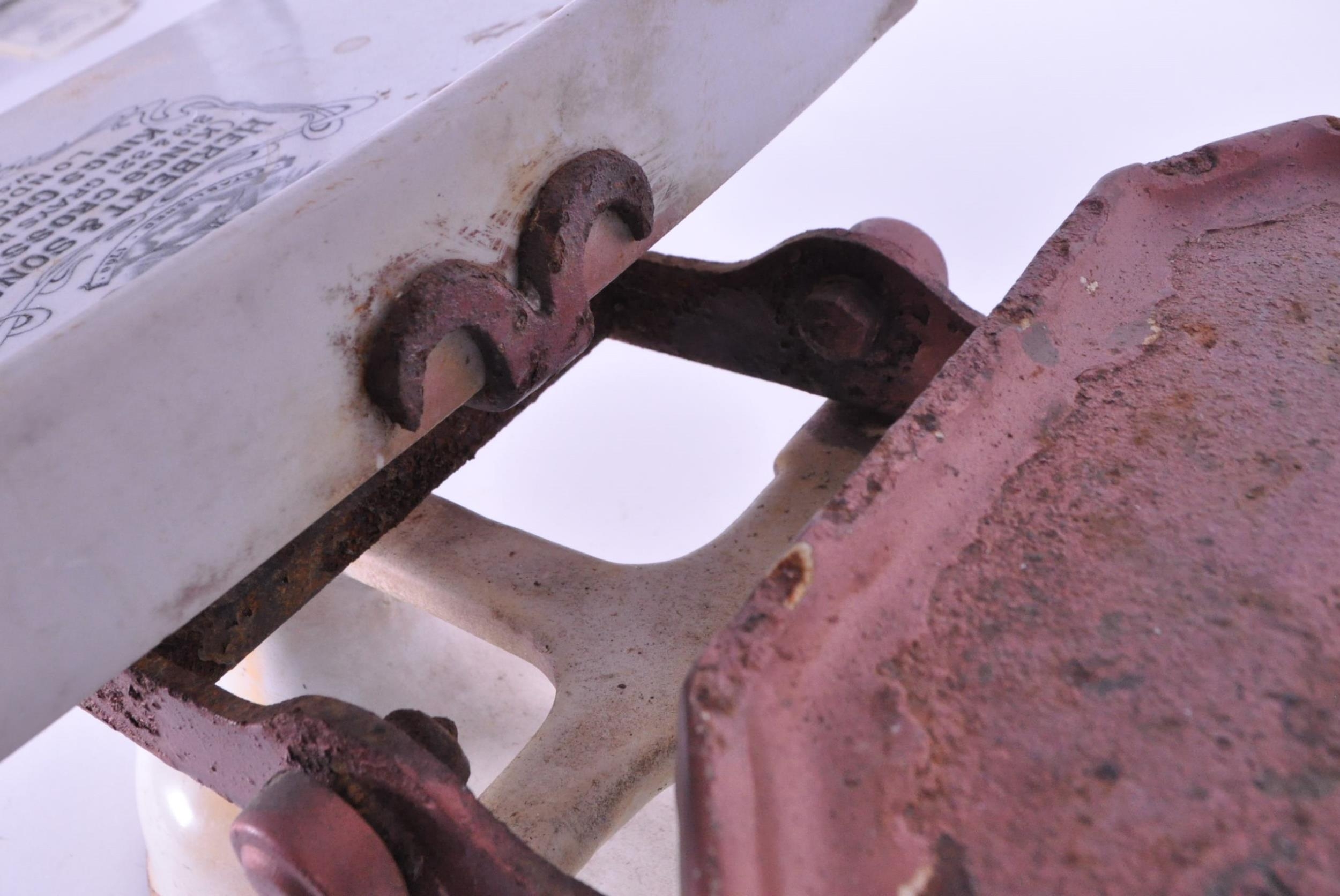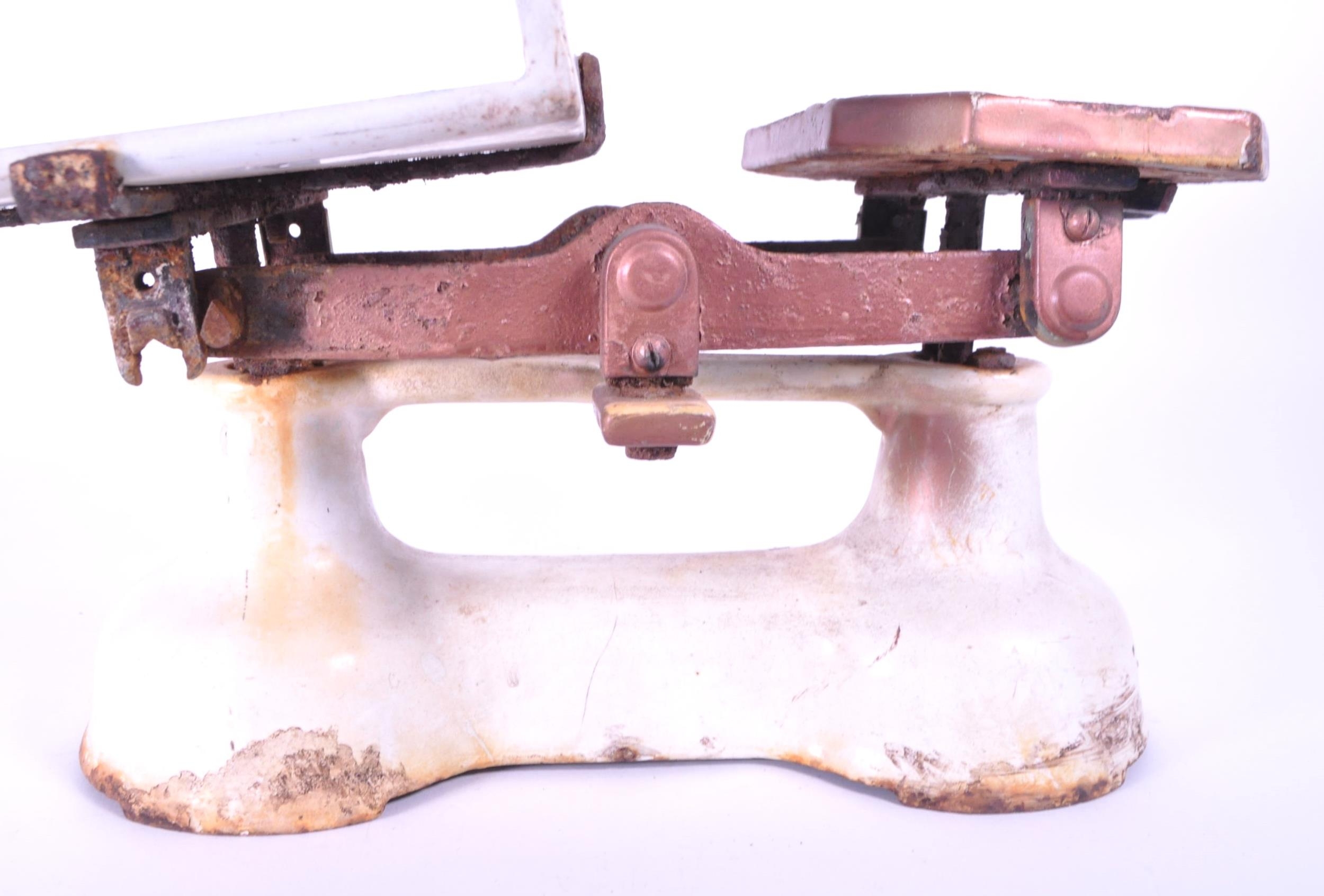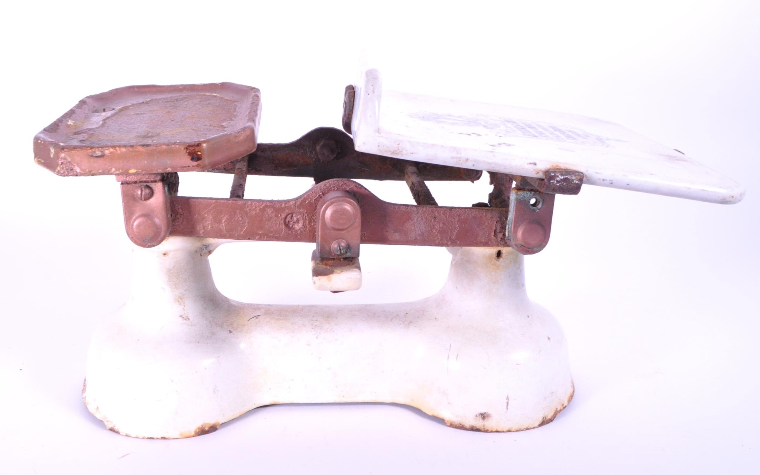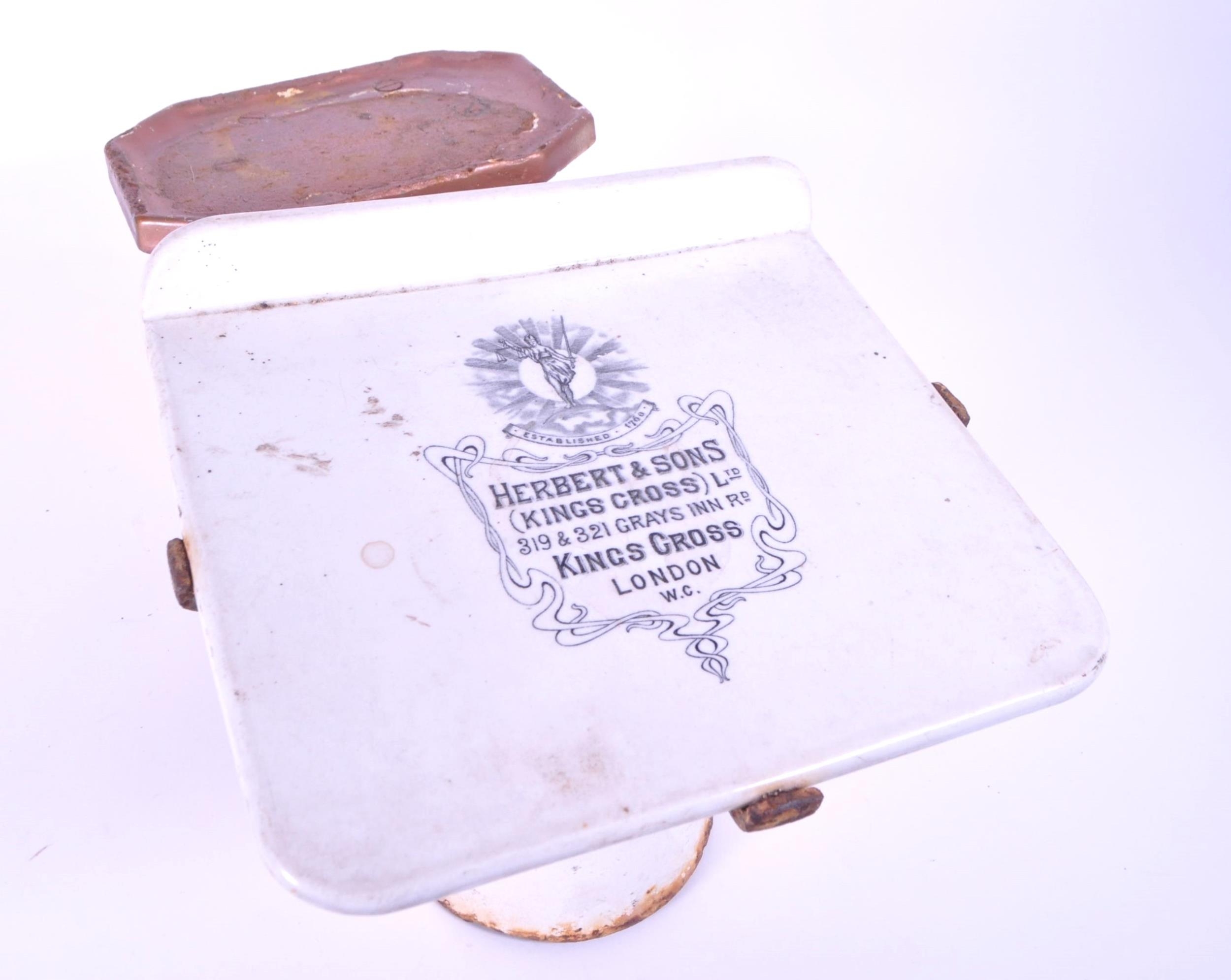 Herbert & Sons - Early 20th century cast iron Kings Cross Ltd weighing scales. Painted in white to the main body, and with a ceramic / ironstone plate for weighing. Makers mark on the ceramic plate. Measuring approx. 22cm x 35.5cm x 24cm.