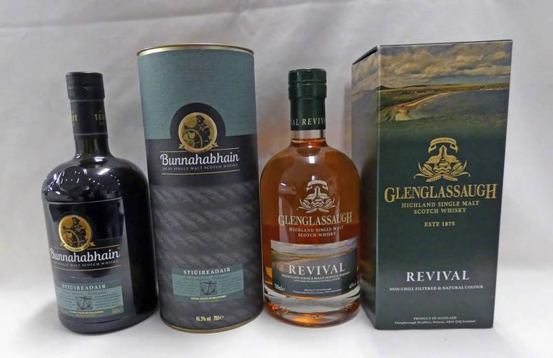 2 BOTTLES SINGLE MALT WHISKY : BUNNAHABHAIN STIUREADAIR - 70CL, 6.3% VOL IN TUBE & GLENGLASSAUGH REVIVAL - 700ML, 46% VOL . BOXED