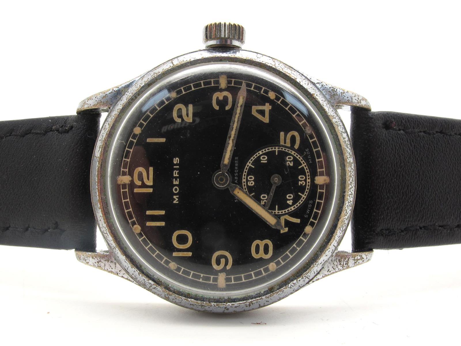 Moeris; A Military Style Wristwatch, the signed black dial with Arabic numerals and seconds subsidiary dial, the movement stamped "Moeris", the screw down case back (32mm case) numbered "D2590303H", on a modern strap.