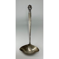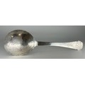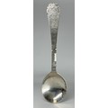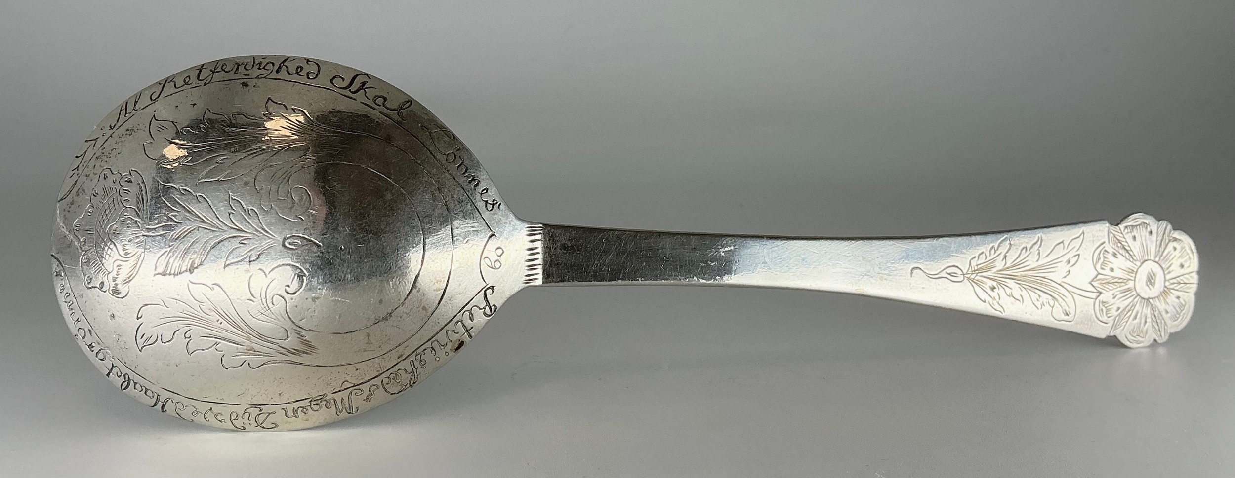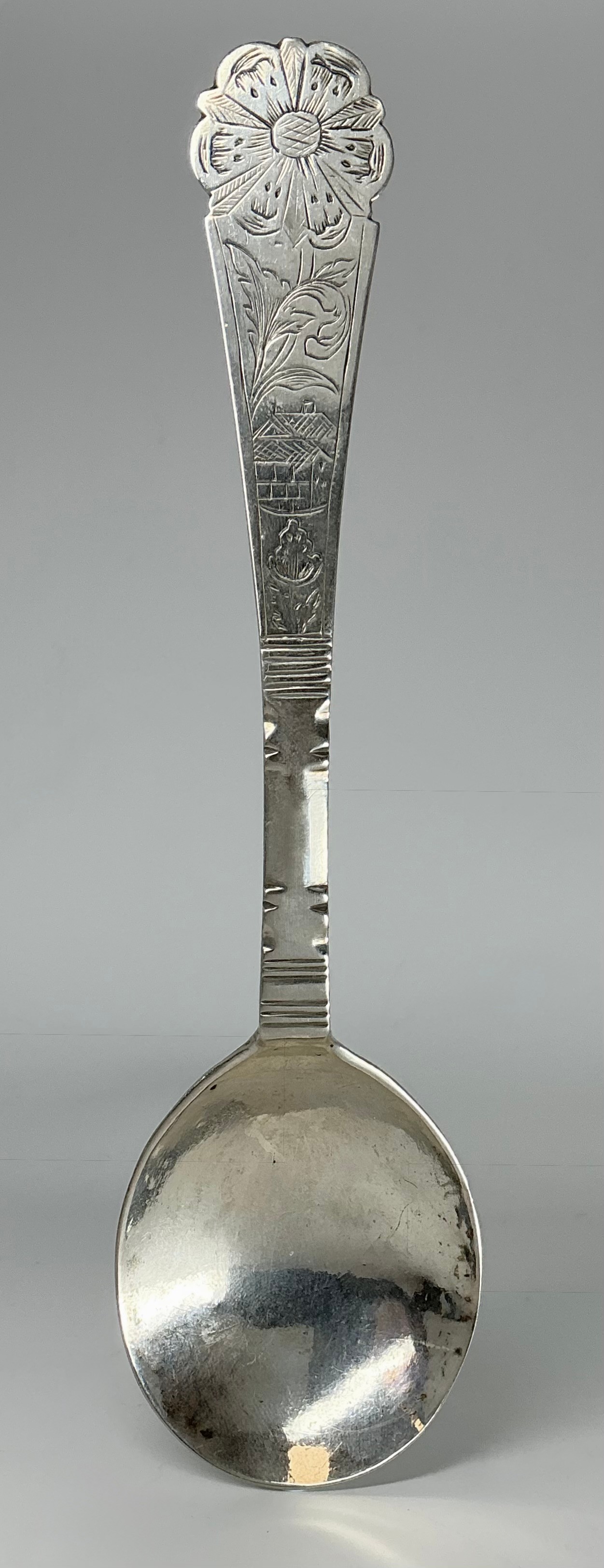 An 18th century Scandinavian spoon, probably Danish or Norwegian, the shaped terminal engraved with a flowerhead and an architectural vignette, the bowl inscribed to verso and engraved with a further flower, 20.5cm long, apparently unmarked