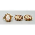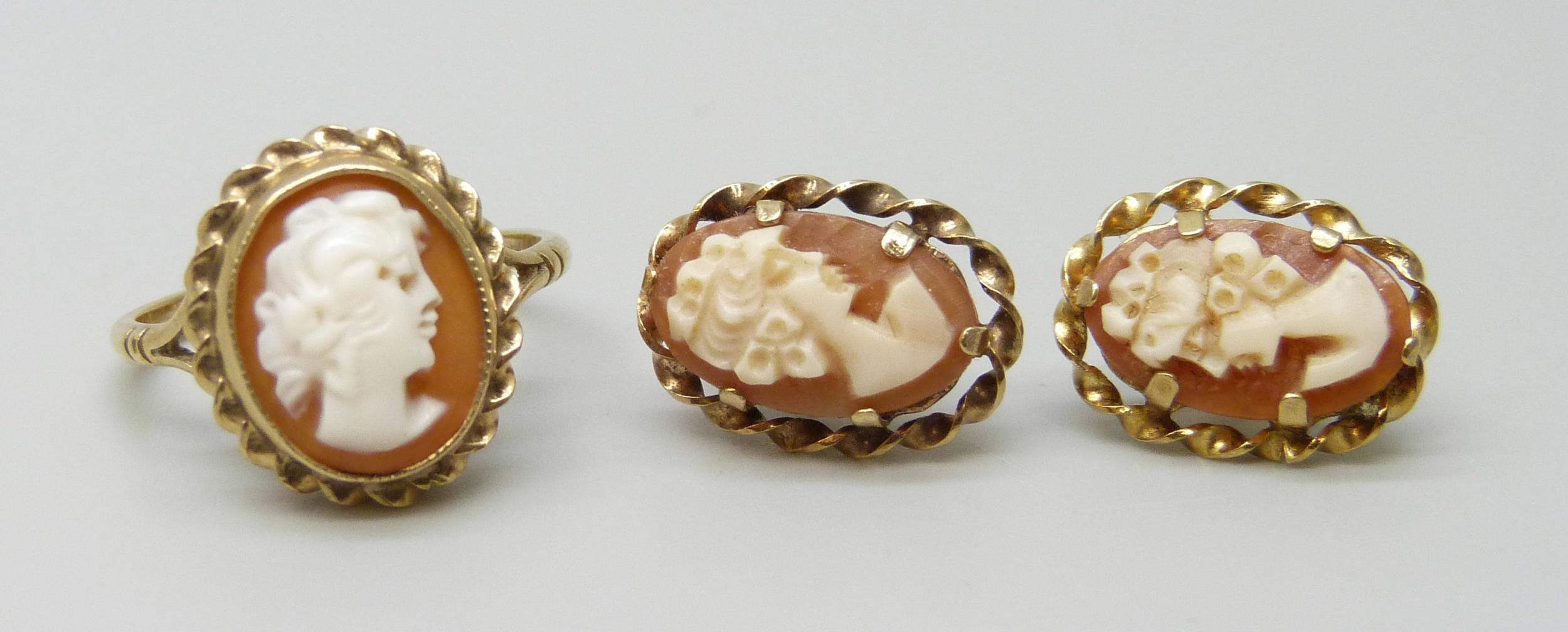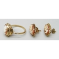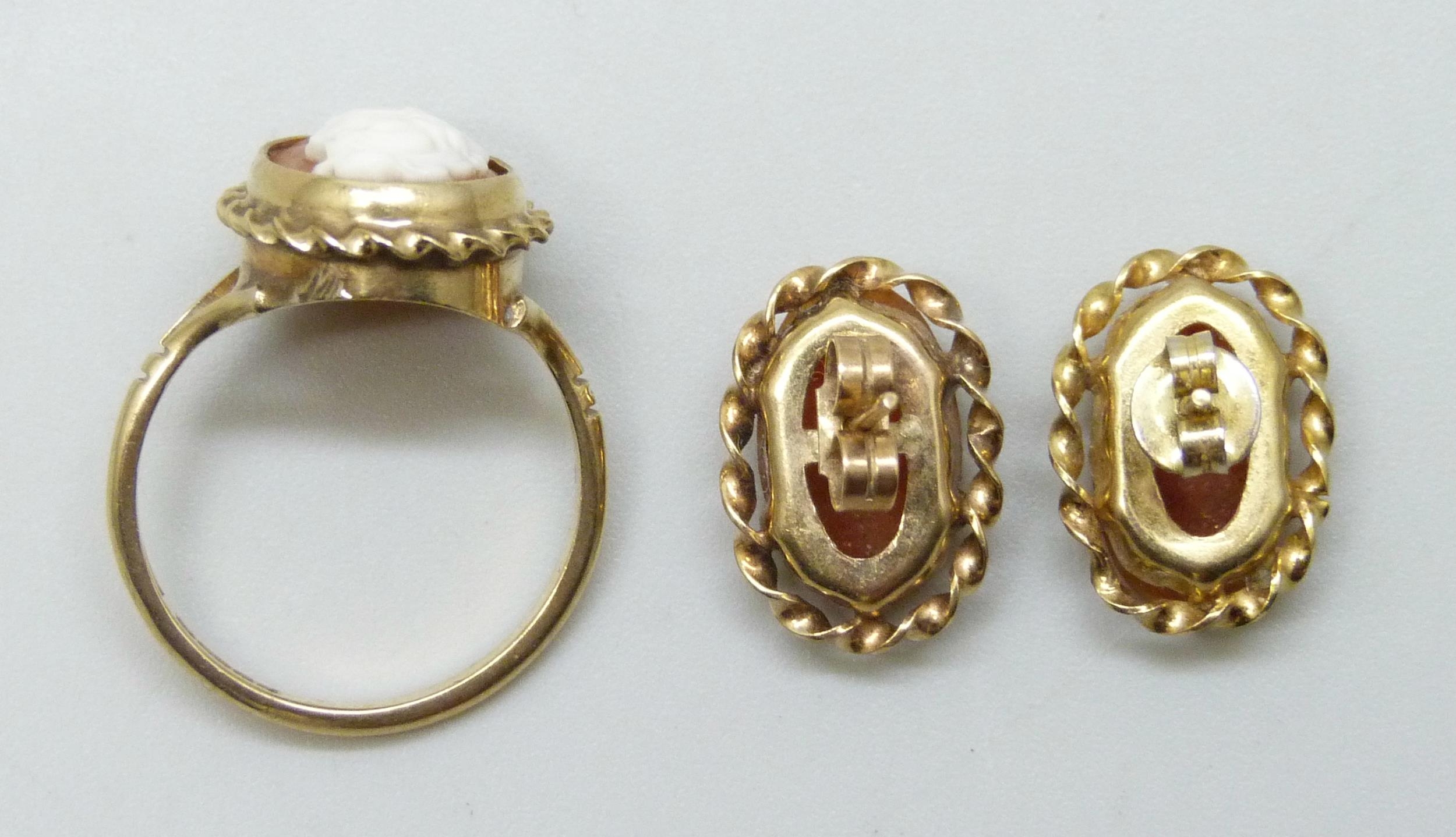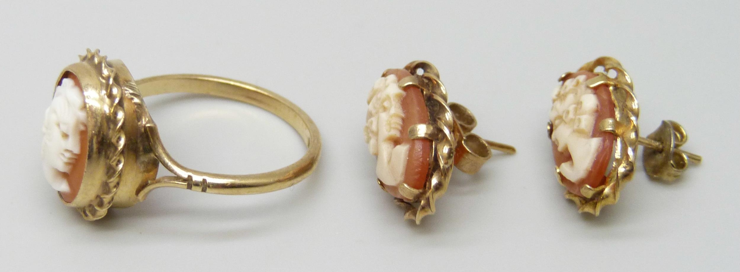 A 9ct gold cameo ring, N, and a pair of similar 9ct gold earrings, 5.1g total