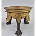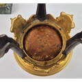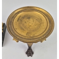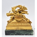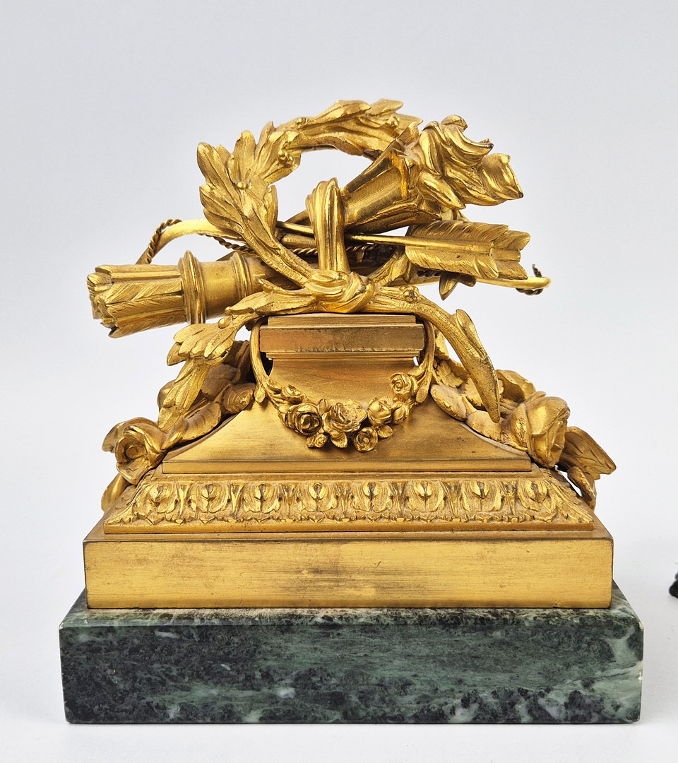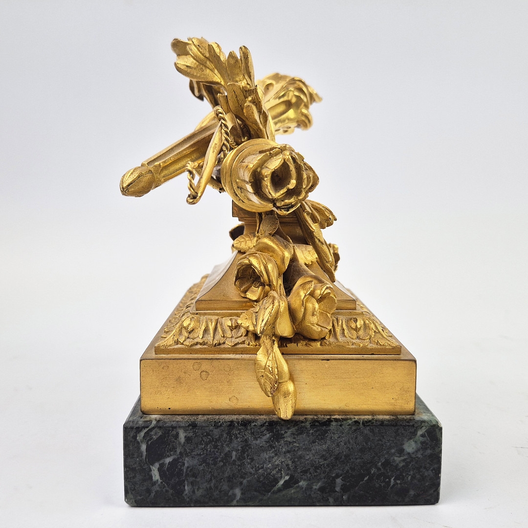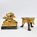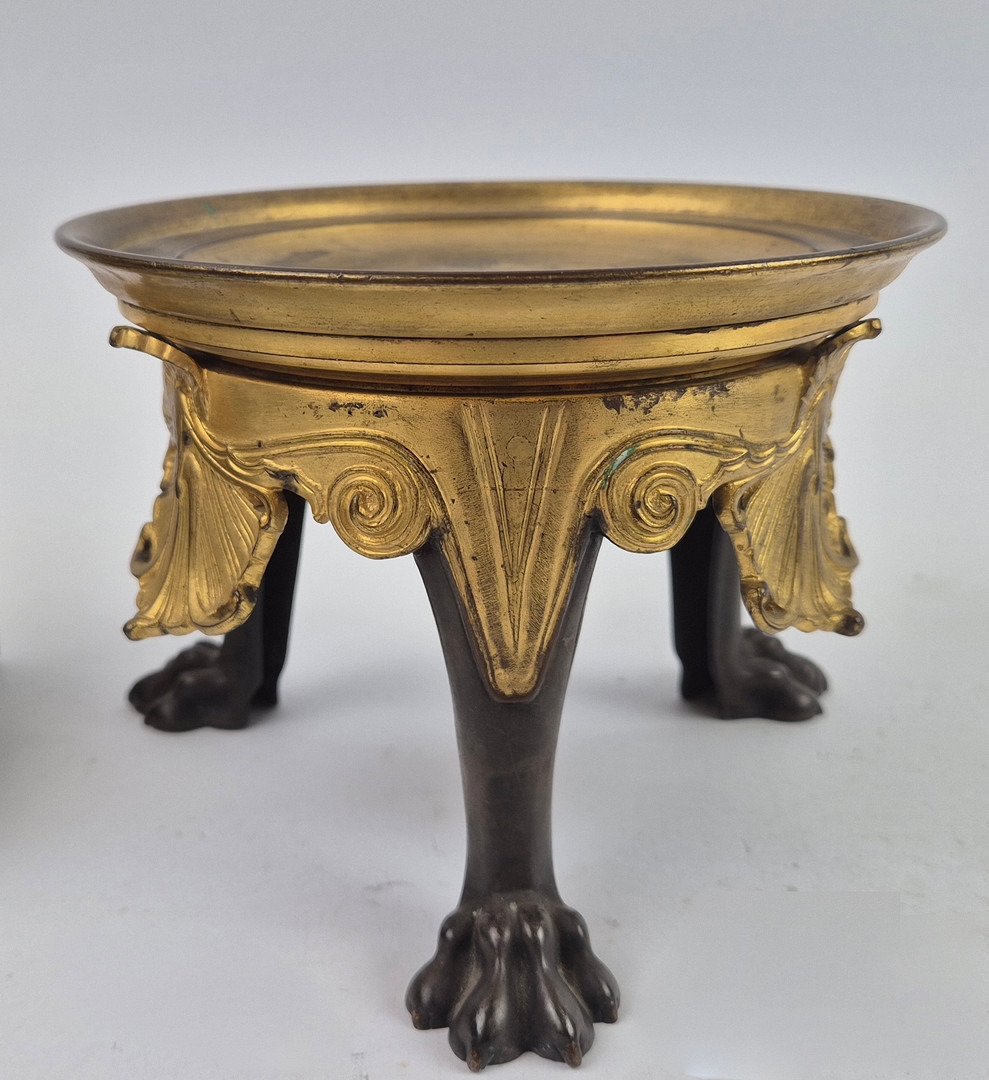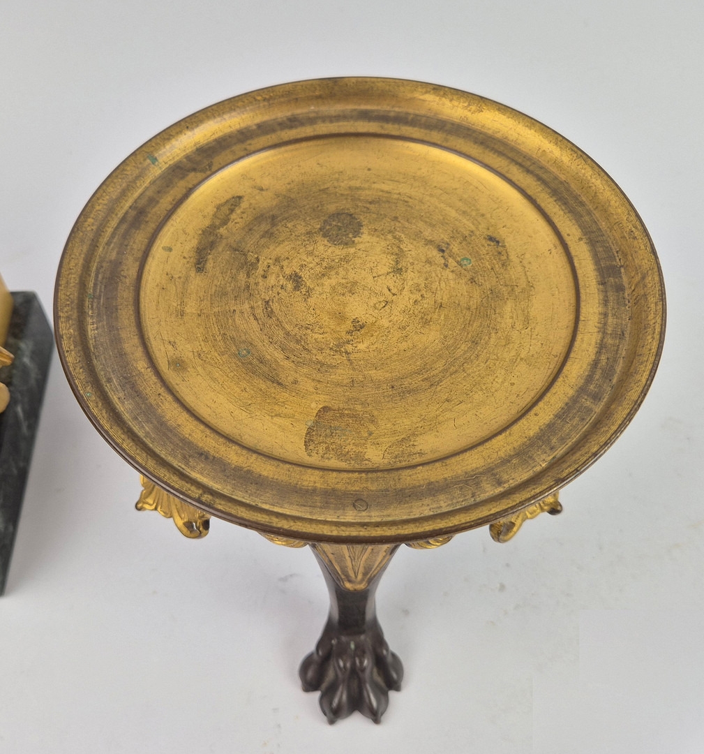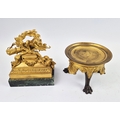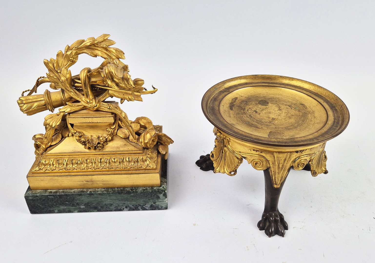 F. BARBEDIENNE. A 19TH CENTURY FRENCH EMPIRE REVIVAL BRONZE ORMOLU STAND AND LOUIS XVI STYLE CENTER PIECE. (2). the stand signed F. Barbedienne with paw feet the centerpiece modelled as a floral, torch and wreath ensemble on marble base. stand 12cm H x 20cm W. 18cm x 20cm x 11cm W.