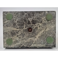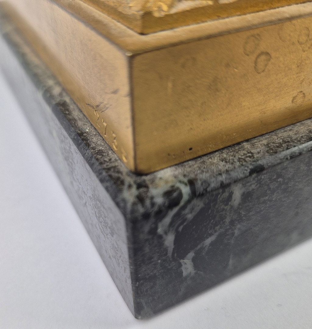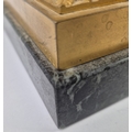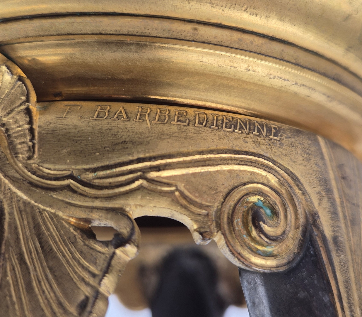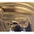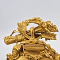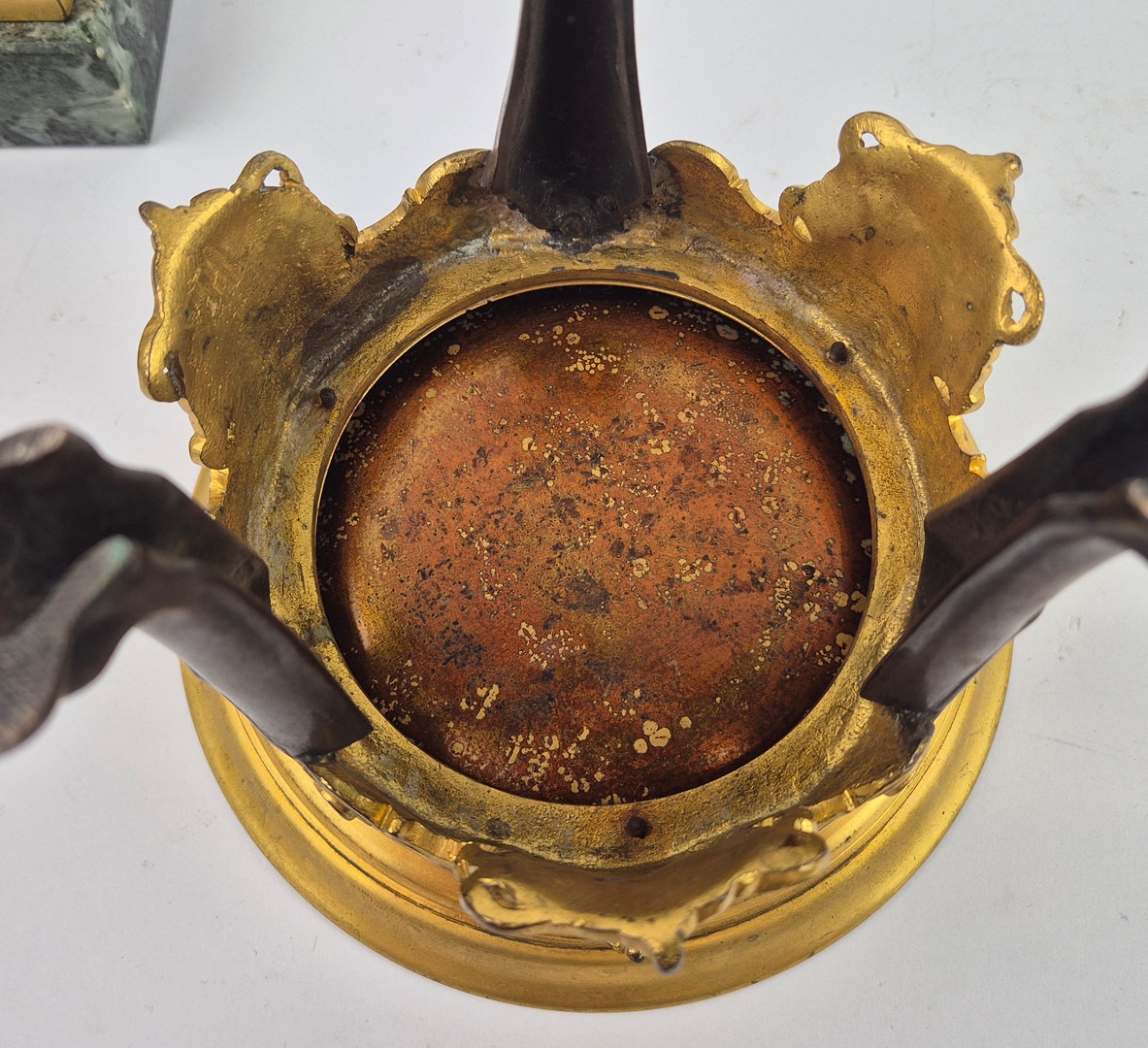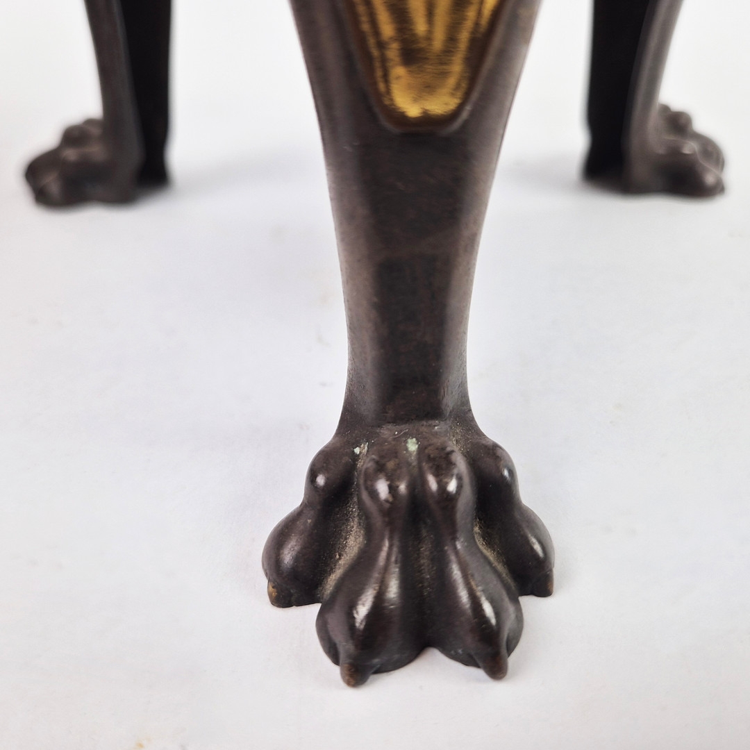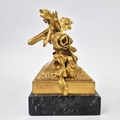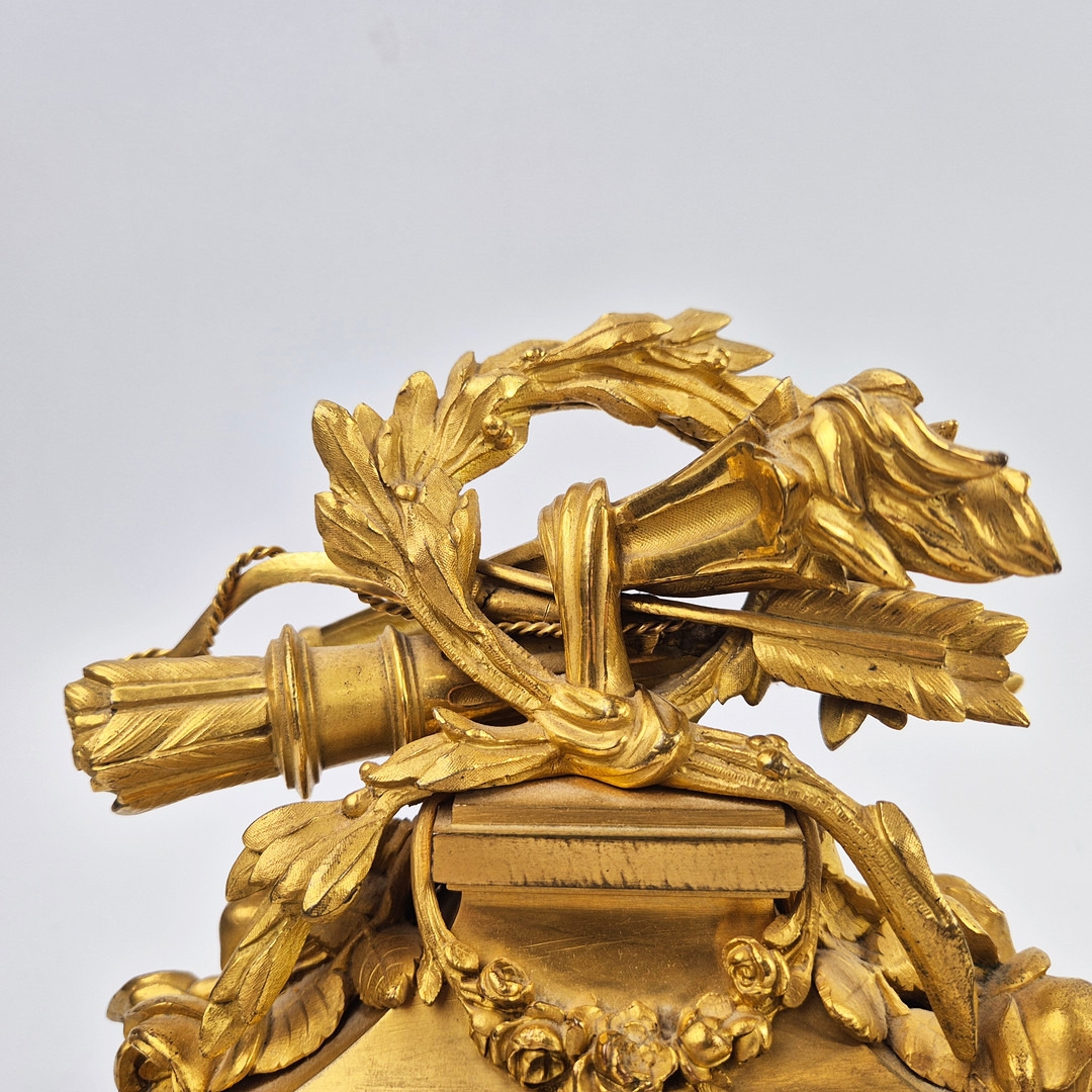 F. BARBEDIENNE. A 19TH CENTURY FRENCH EMPIRE REVIVAL BRONZE ORMOLU STAND AND LOUIS XVI STYLE CENTER PIECE. (2). the stand signed F. Barbedienne with paw feet the centerpiece modelled as a floral, torch and wreath ensemble on marble base. stand 12cm H x 20cm W. 18cm x 20cm x 11cm W.