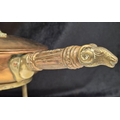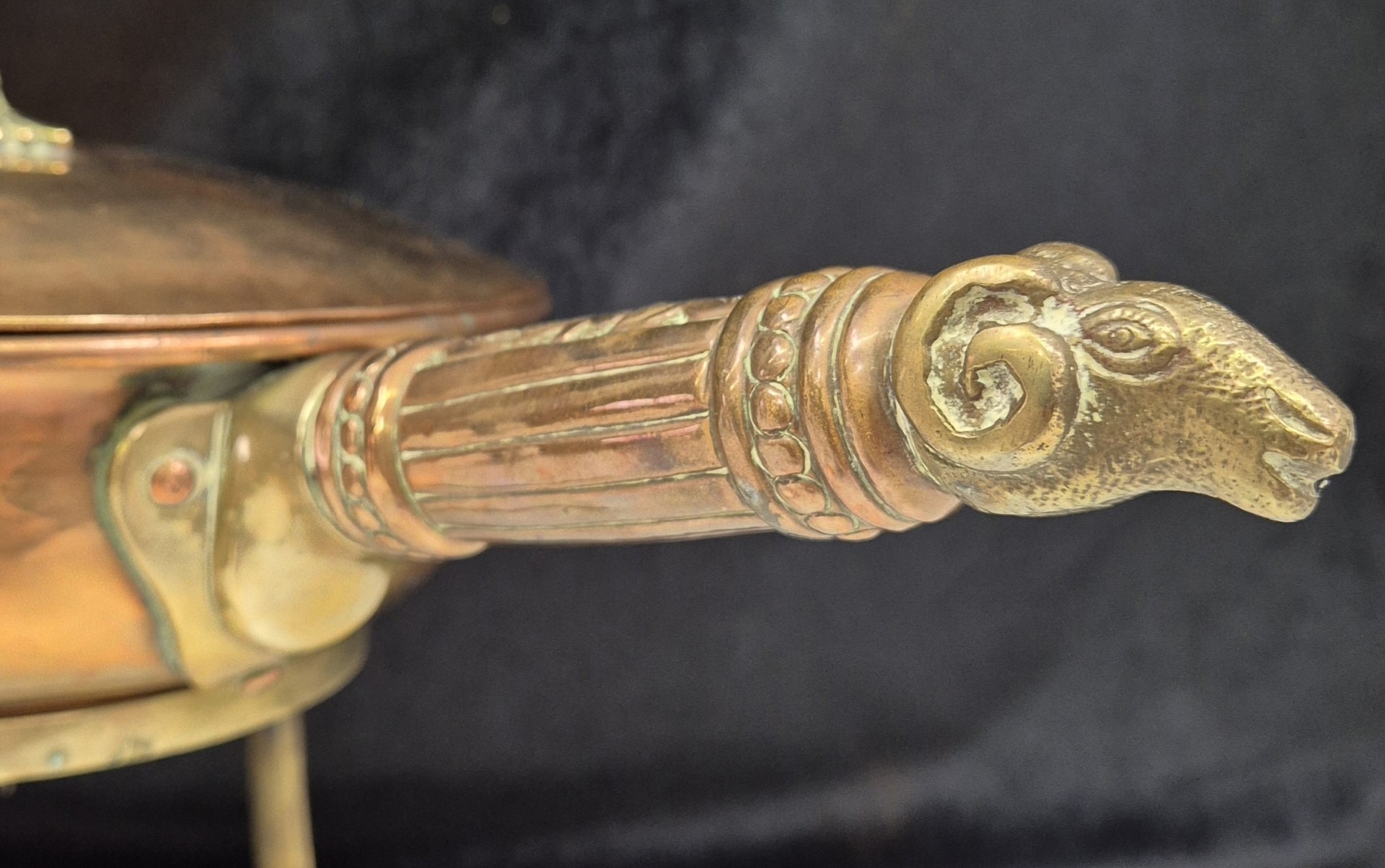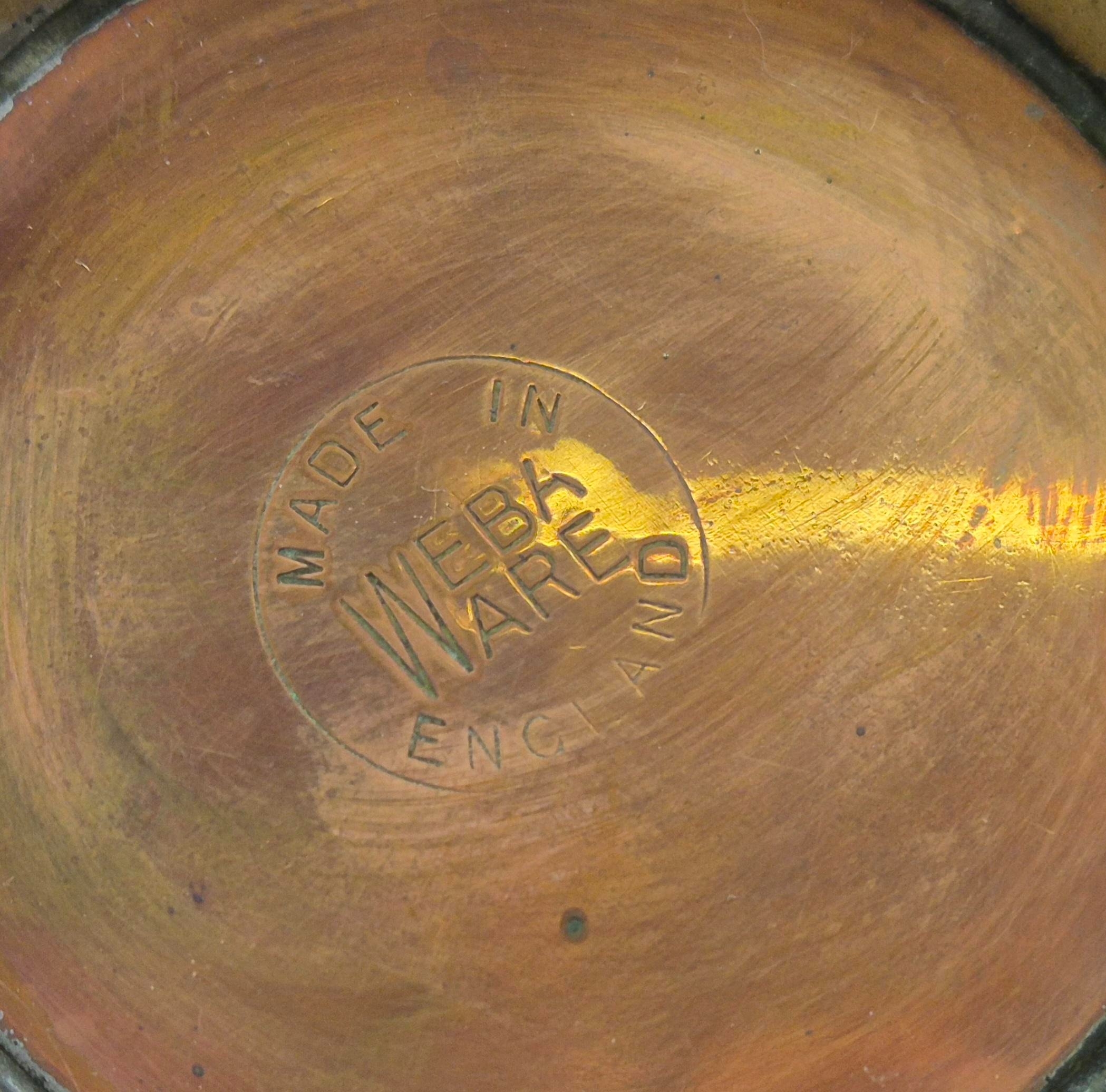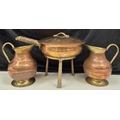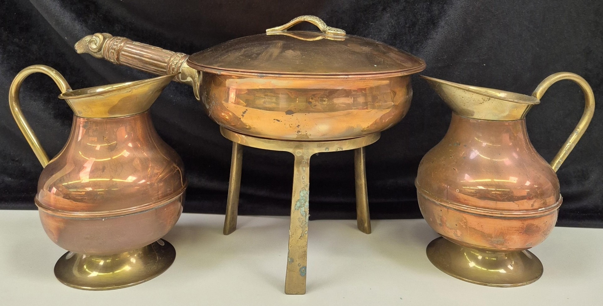 Pair of copper & brass jugs by Weba Ware, together with a copper & brass pan with stand. Respective dimensions(cm) H16, W16, D12 & H21, W33, D21.