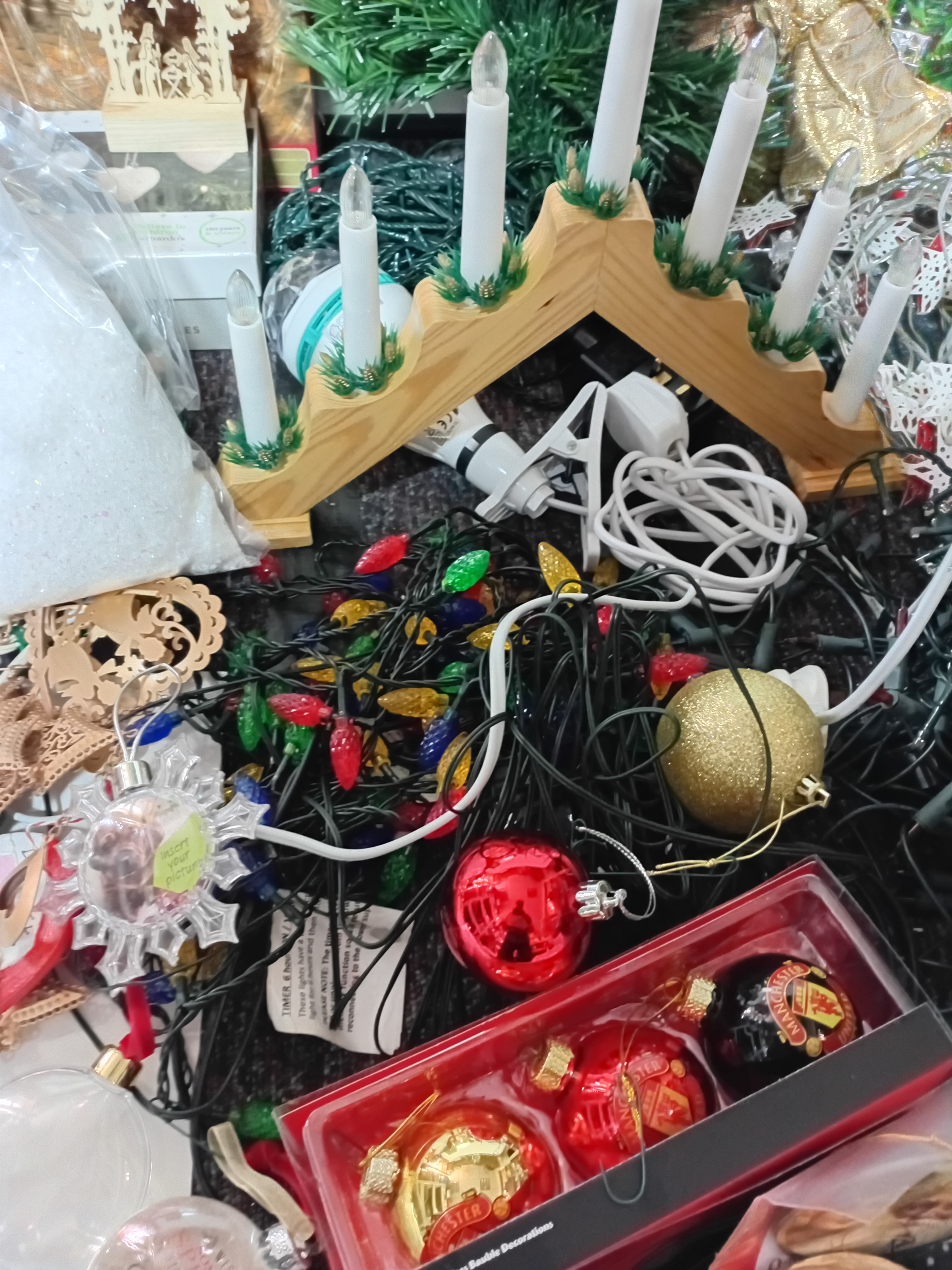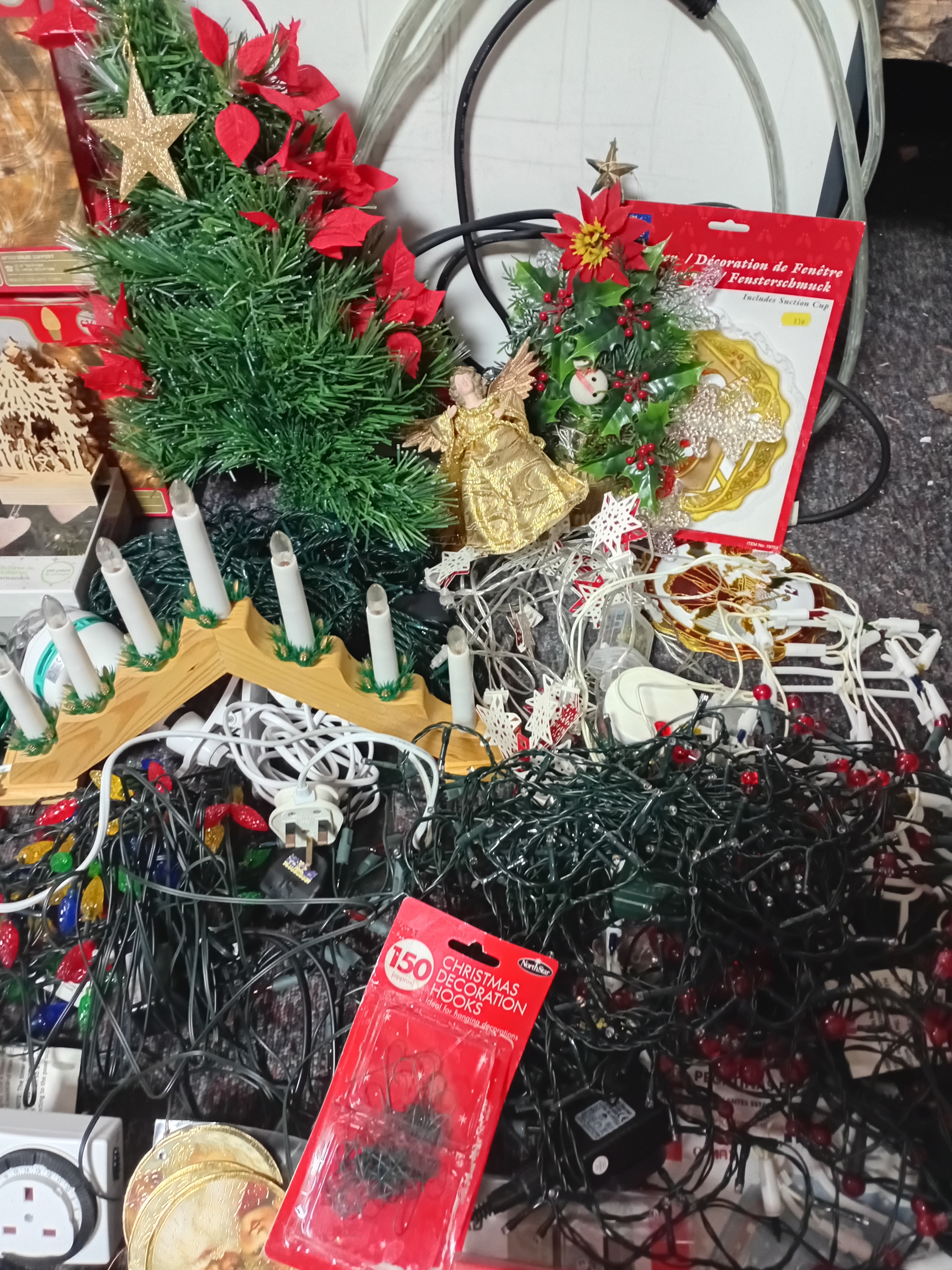 A job lot of Christmas decorations. Featuring, lights, tree decorations, window stickers, an LED Waving Santa, extension leads, a 24 h plug timer and more