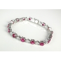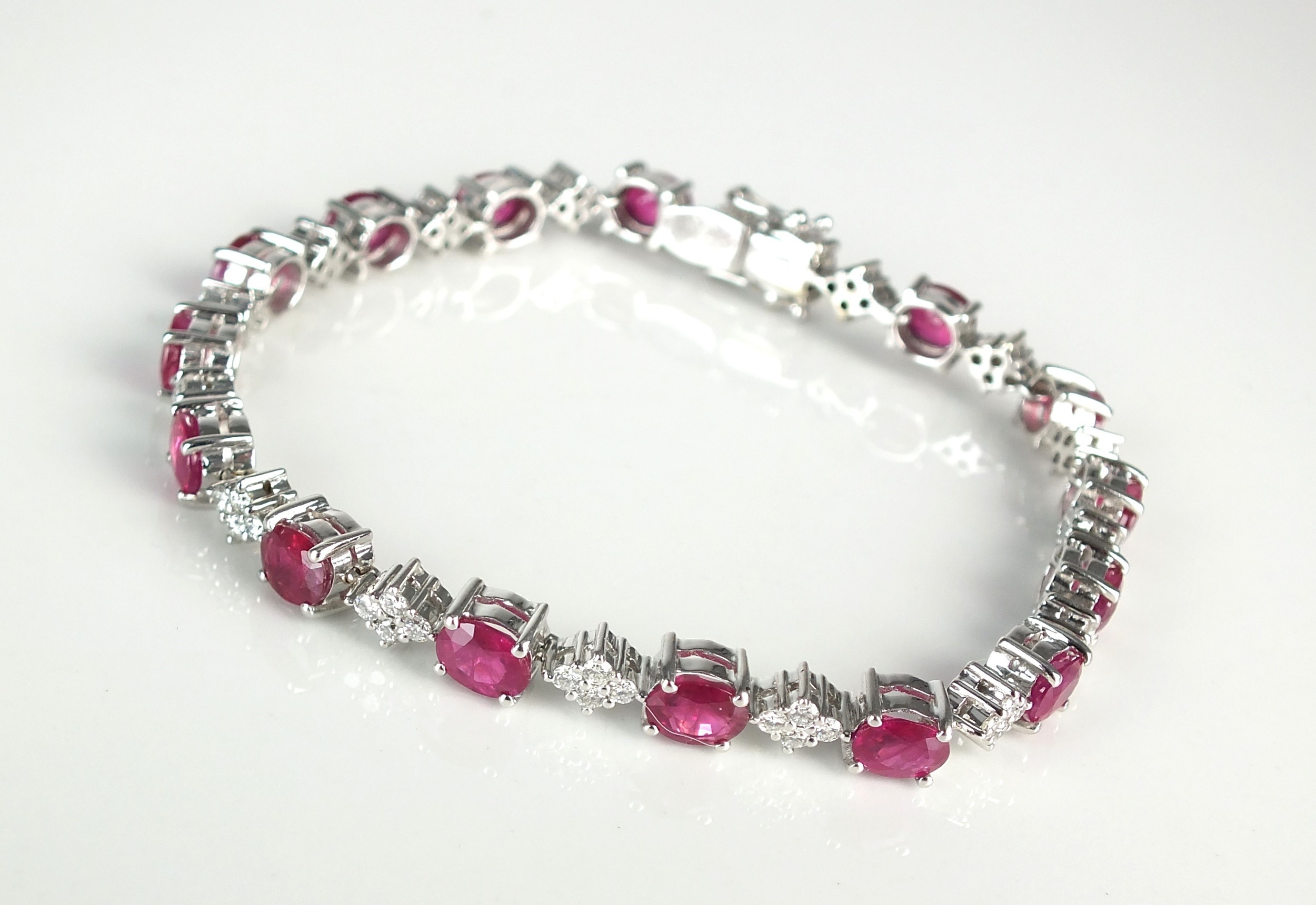 An 18ct white gold ruby and diamond bracelet, designed as sixteen oval mixed cut rubies each interspersed with a diamond shaped cluster of four brilliant cut diamonds, the integral push clasp with two safety catches, 16.5cm long, weight approx 13.3g