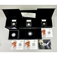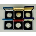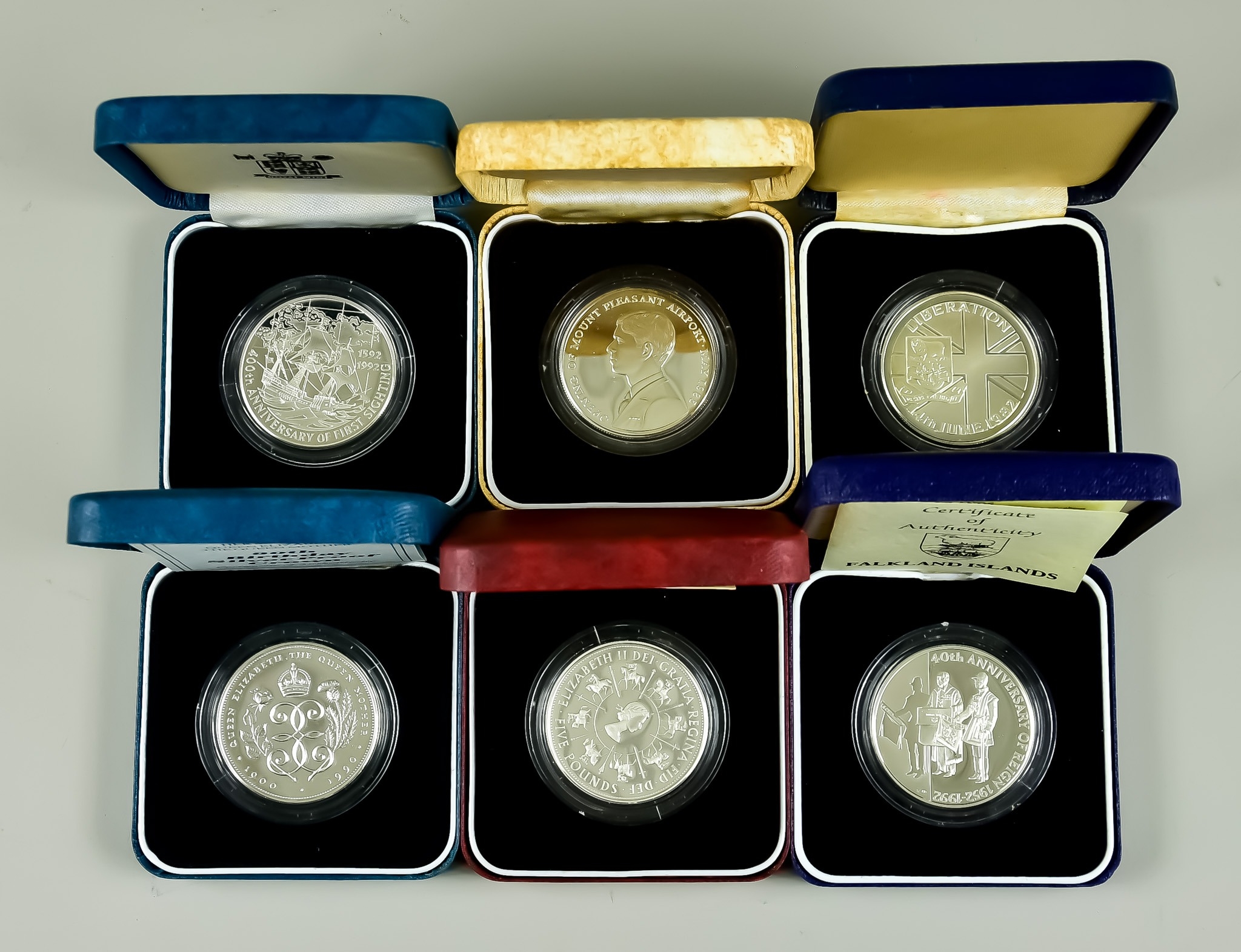 Six Elizabeth II Silver Proof £5 Coins, 1990 - 1993, Comprising, 4 x Falkland Island, Queen Mother 90th Birthday and 40th Coronation Anniversary, all in Royal Mint presentation cases with certificates of authenticity