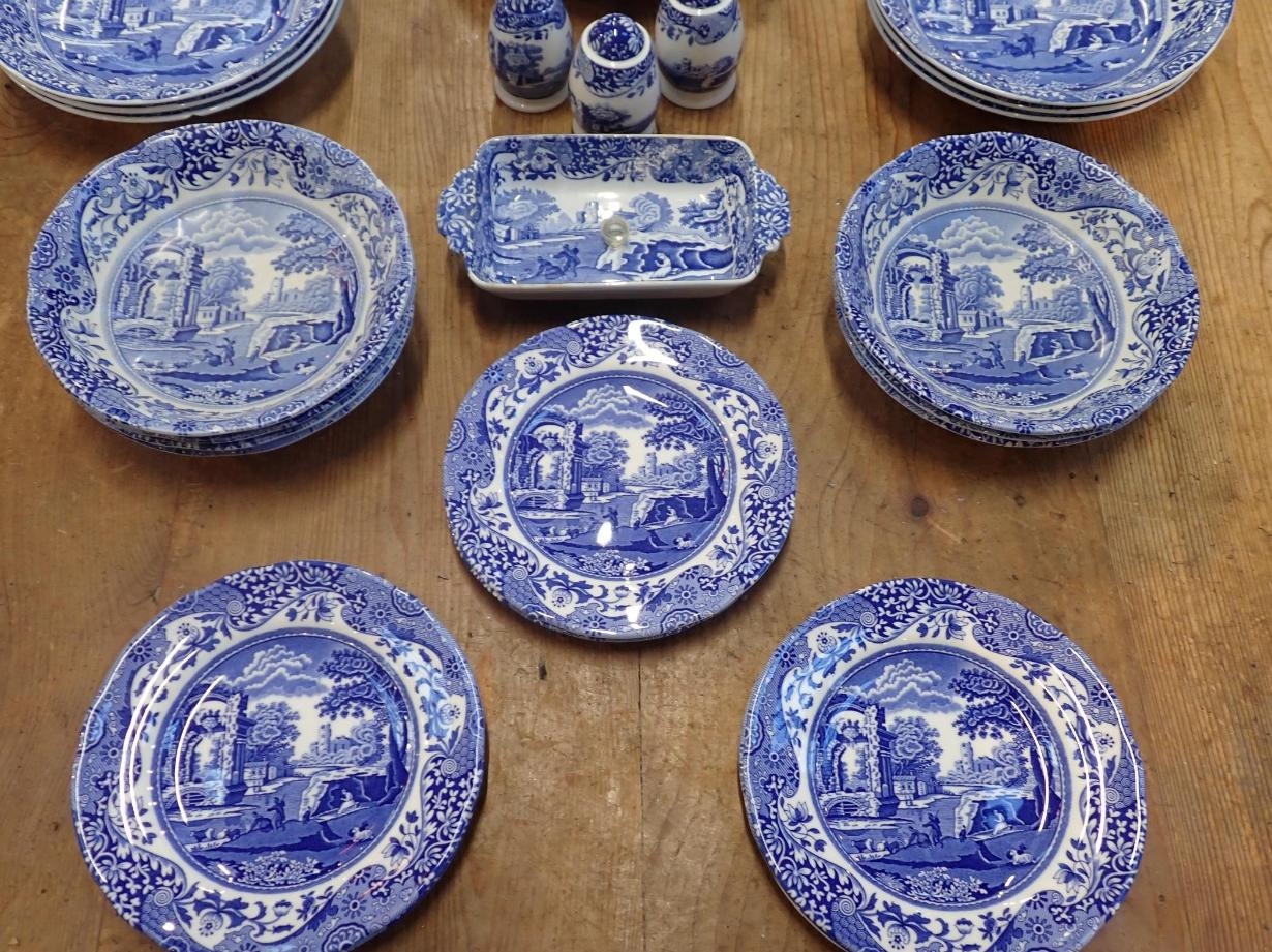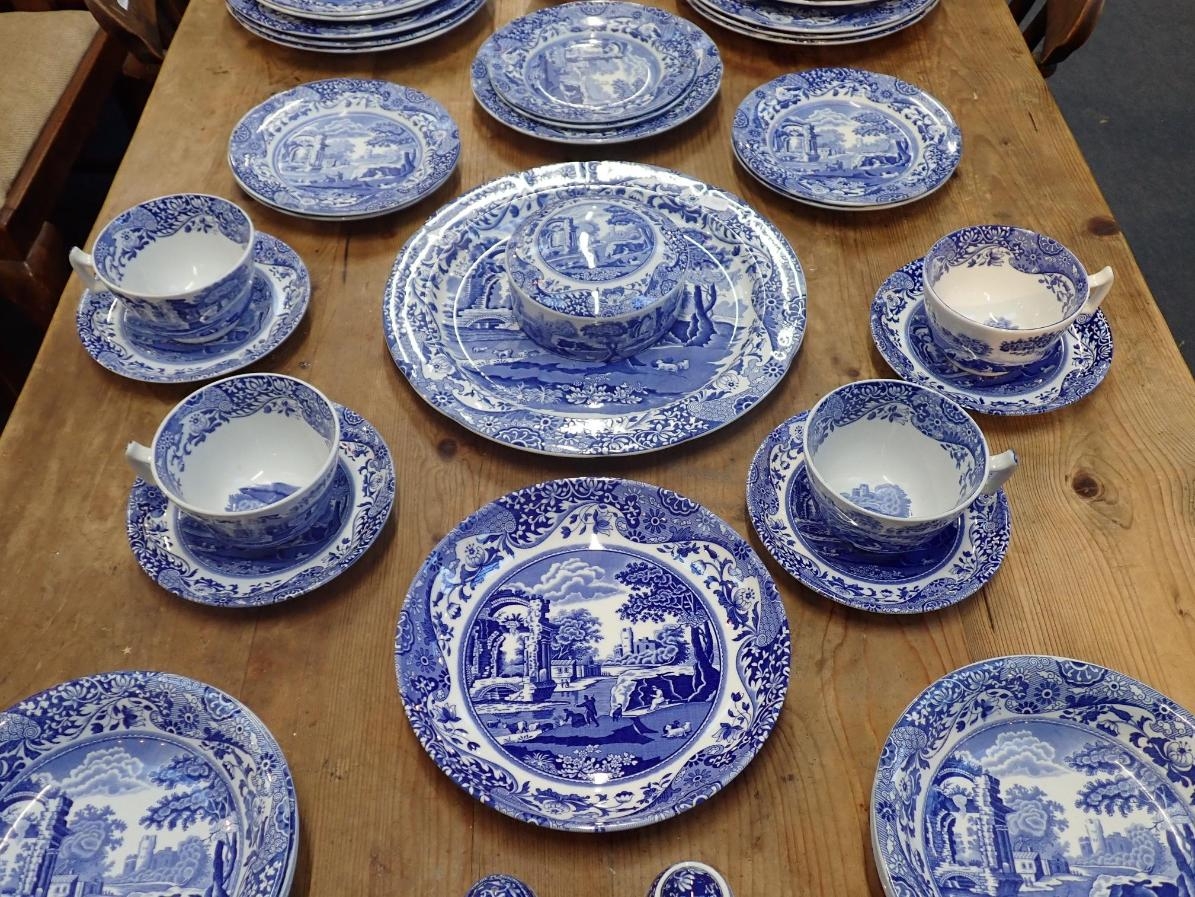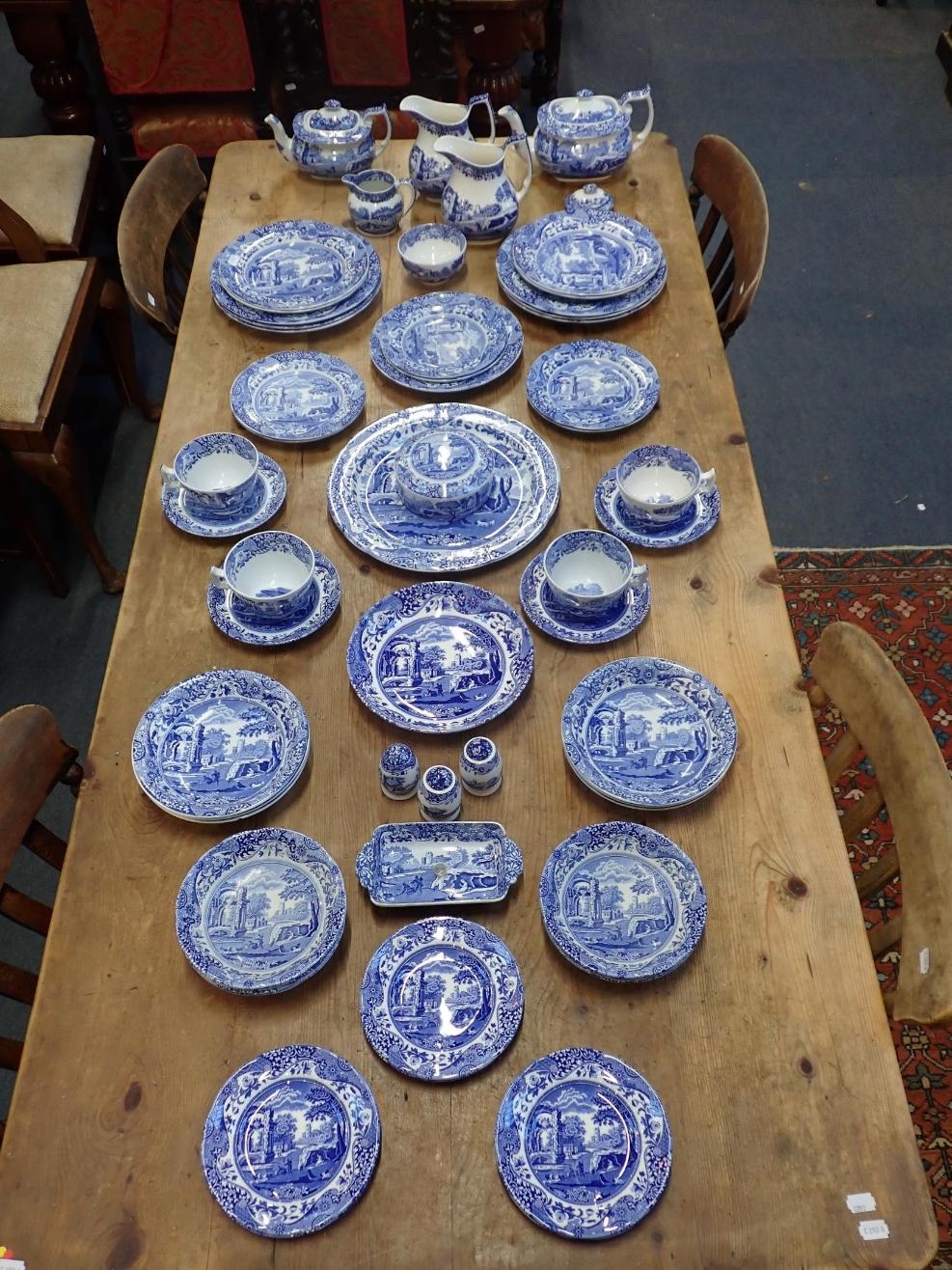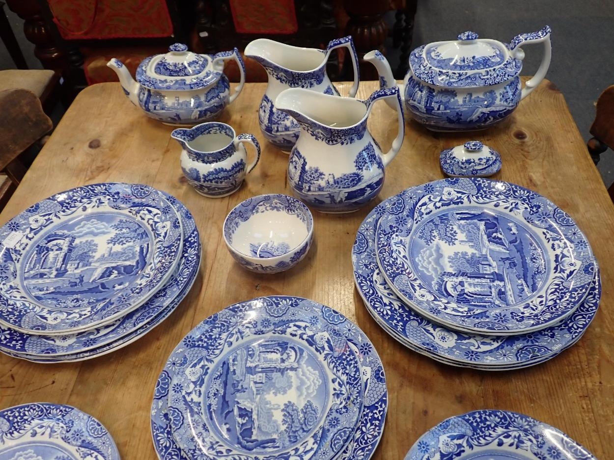 A QUANTITY OF SPODE 'ITALIAN' DINNER AND TEA WAREsix settings, including teapots, jugs, etc (mixture of modern pieces and older with oval mark; a few pieces with damage)
