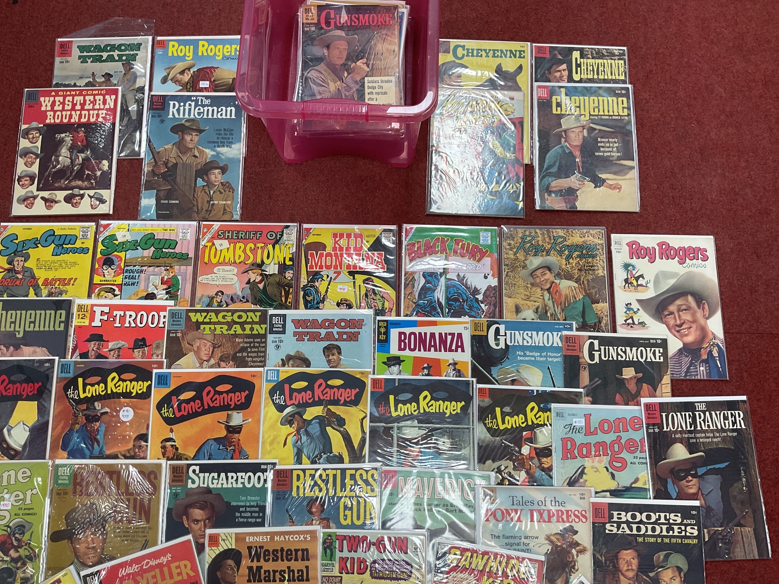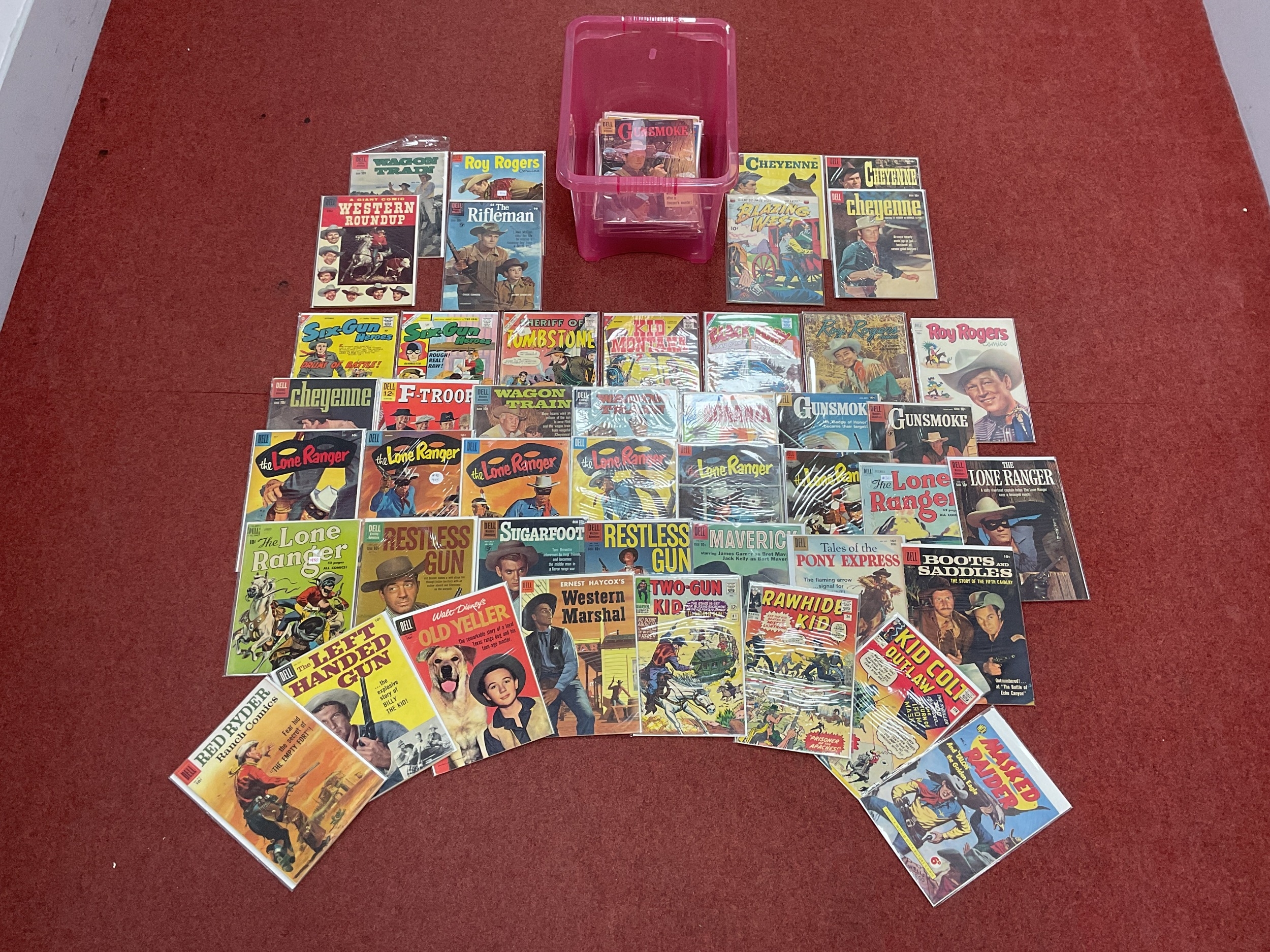 Approximately Sixty Golden and Silver Age comics all with a Western theme by Marvel, Dell, Charlton, Gold Key and others. Including Kid Colt Outlaw #114, Rawhide Kid #34, Two-Gun Kid #81, Four Color Comics #613, #916, #919, #942, #1098, Masked Raider #1, The Lone Ranger #26, #30, #83 (Freitag collection with certificate, unverified), Western Roundup #16, The Rifleman #4, Blazing West #12, Six-Gun Heroes #53, #66, Kid Montana #14, Roy Rogers #32, #56, Cheyenne #8, #9, Gunsmoke #10, #20, Wagon Train #5, #6, #7, F Troop #5. Conditions vary. Faults noted.