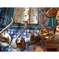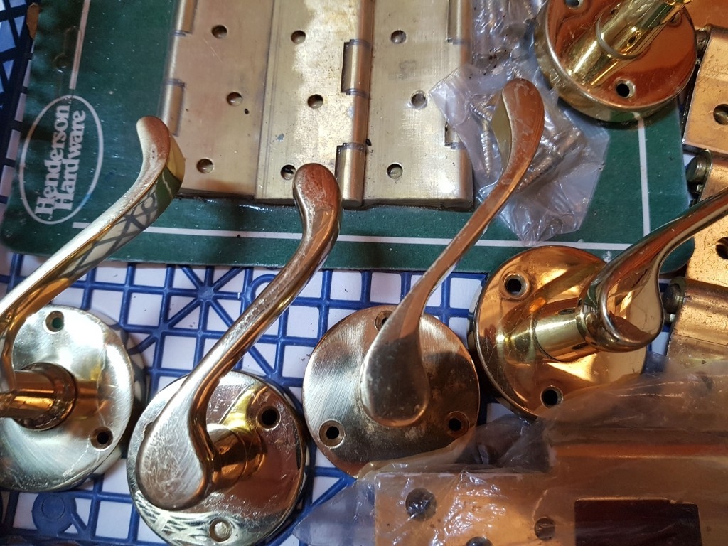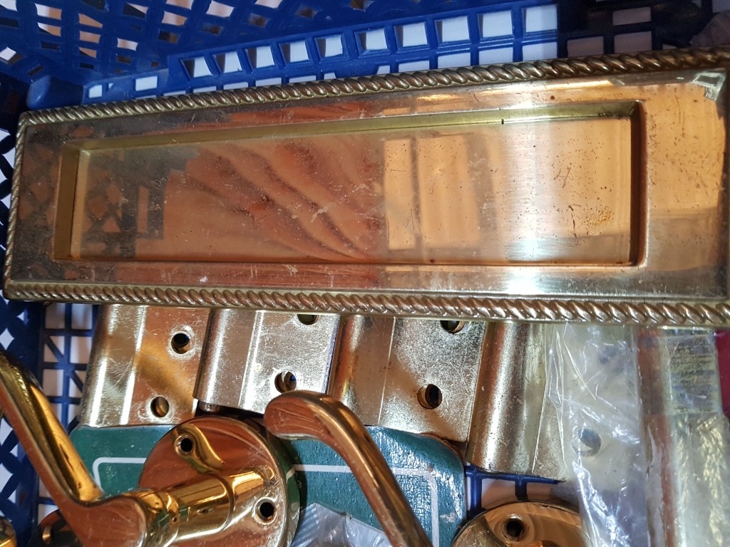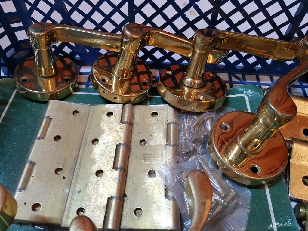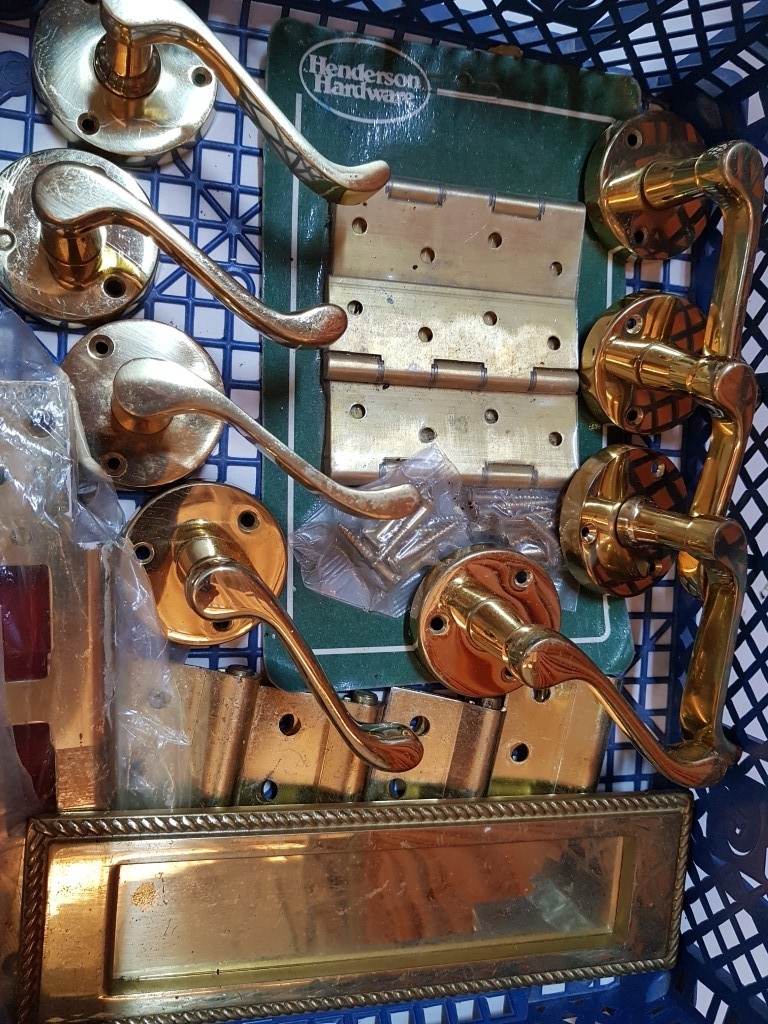 Assortment of brass door furniture, handles, letter box, hinges etc. 15 pcs