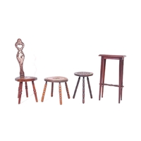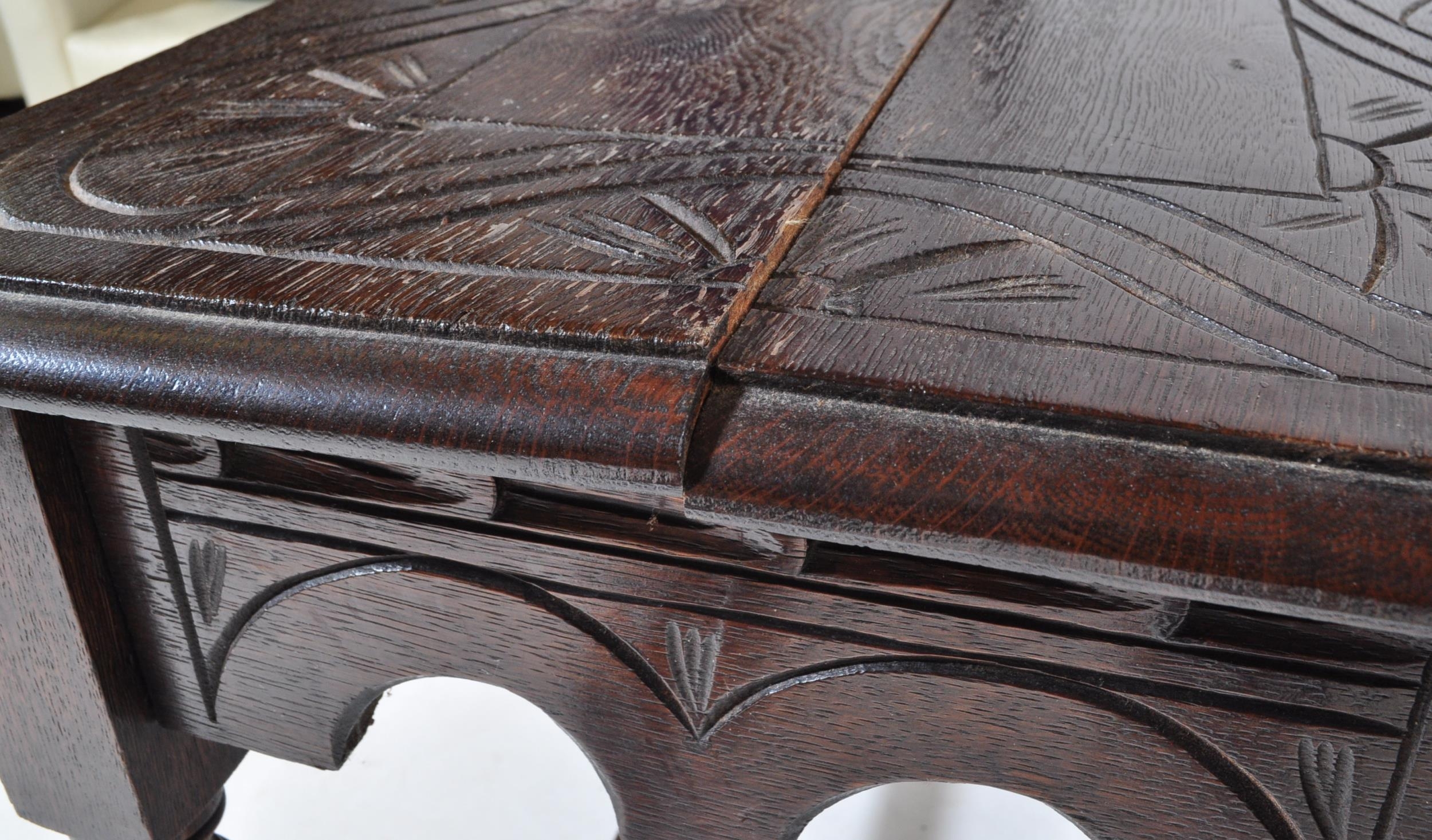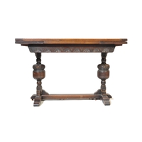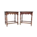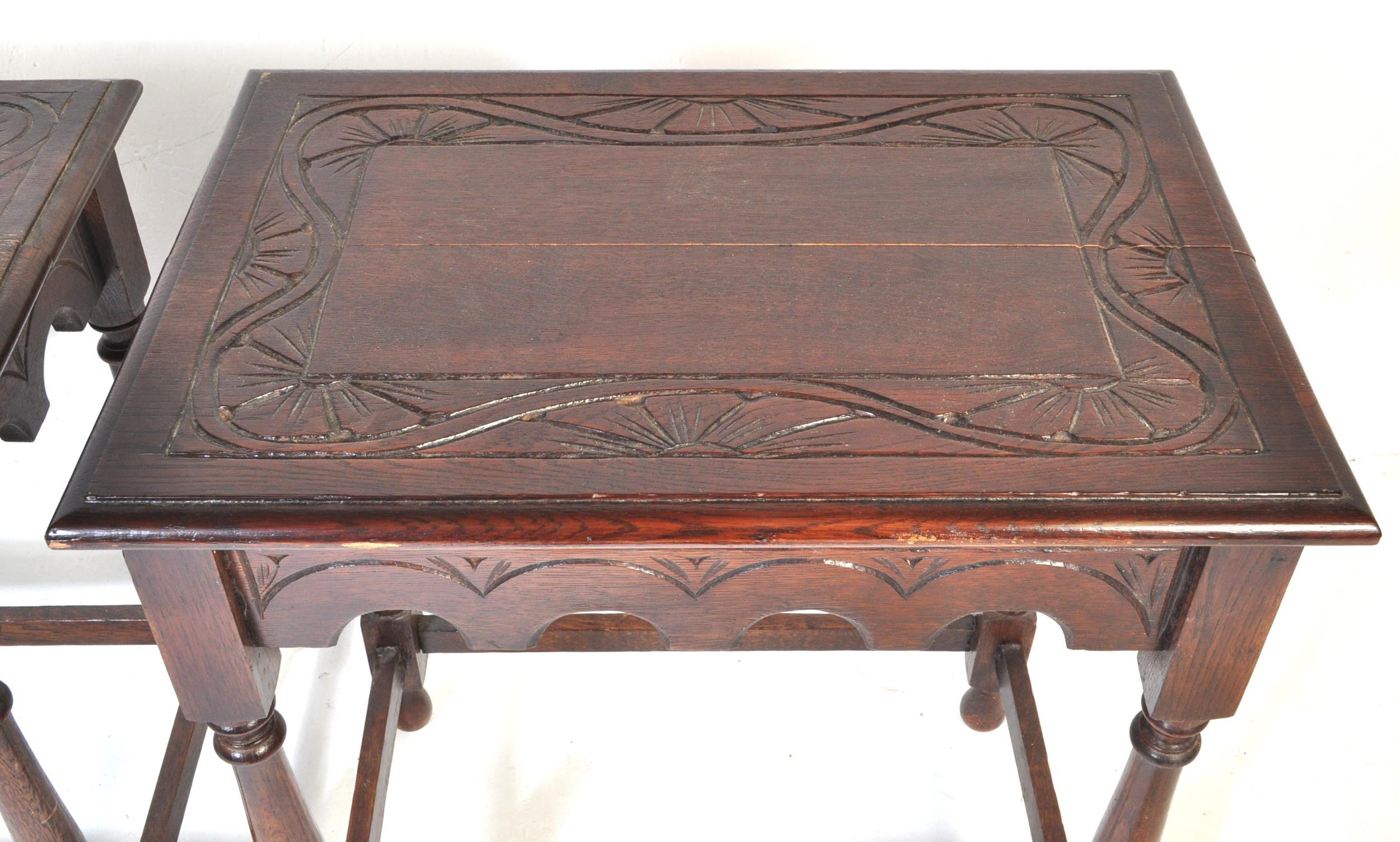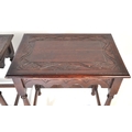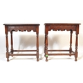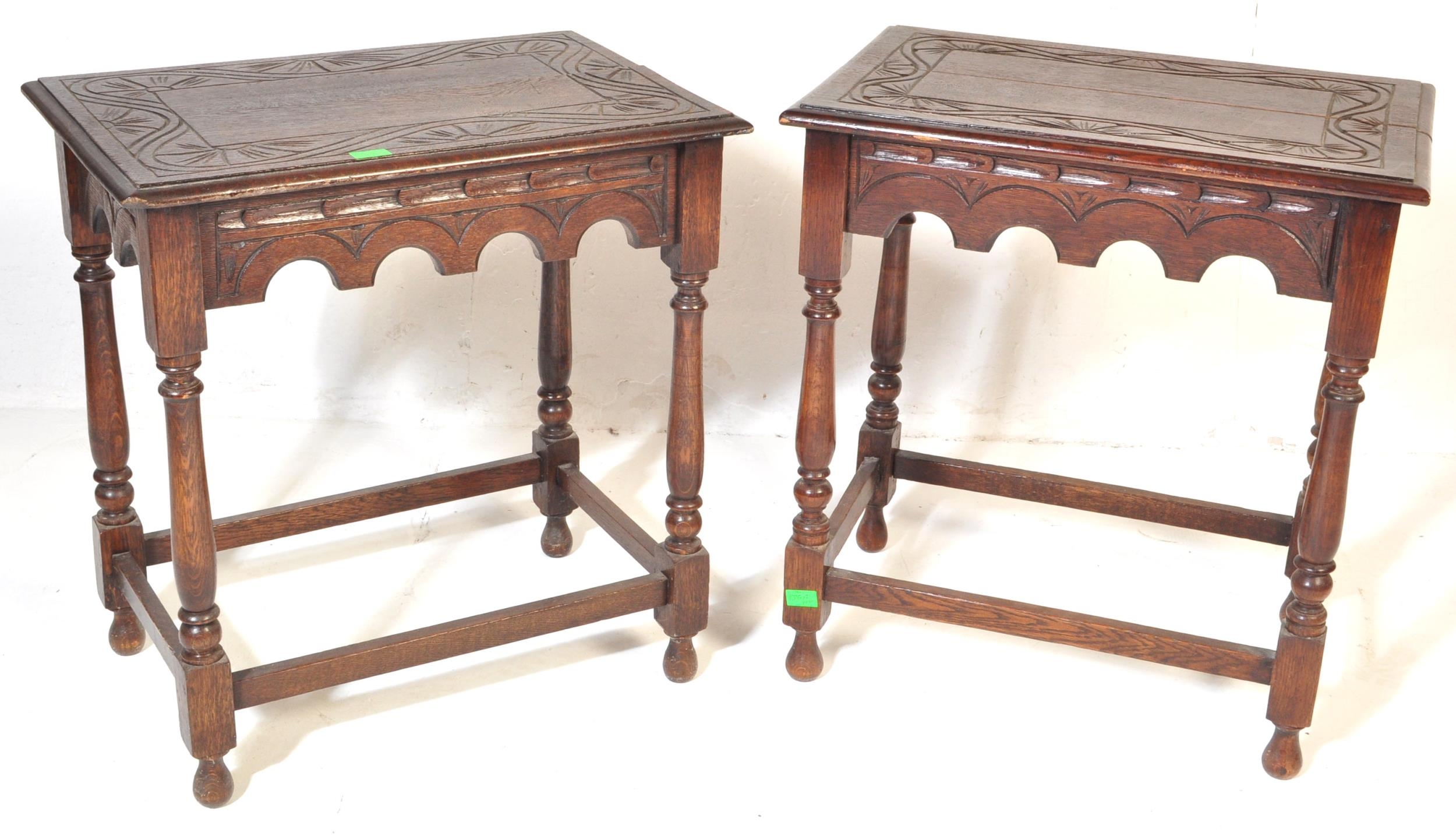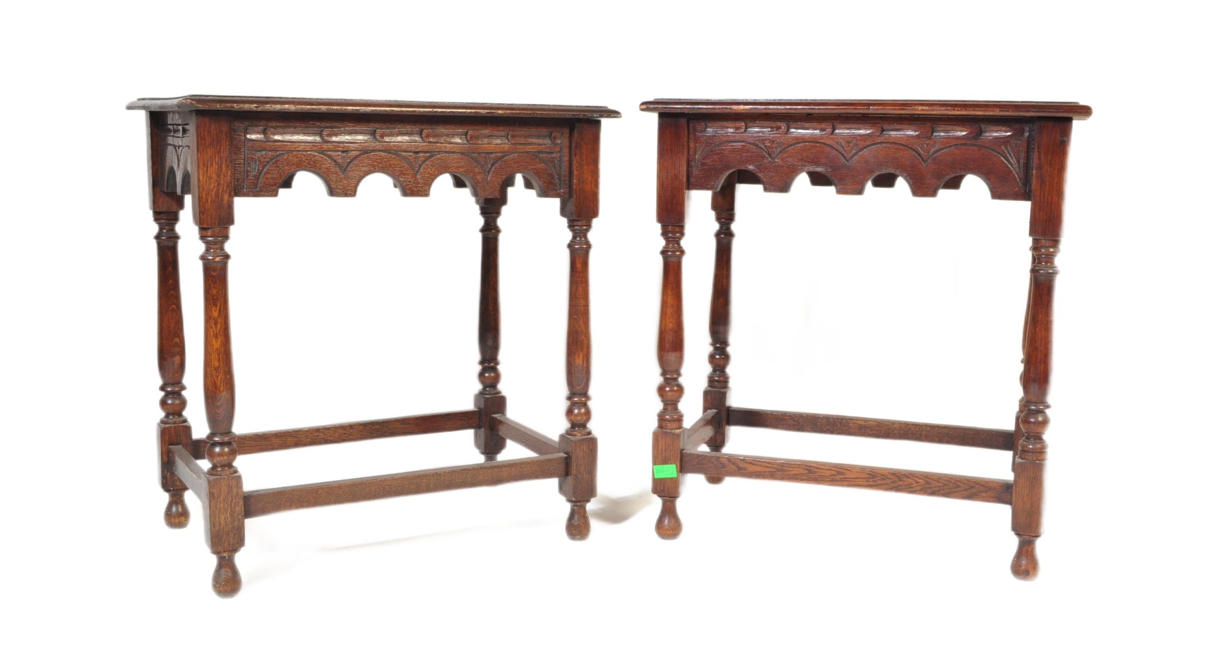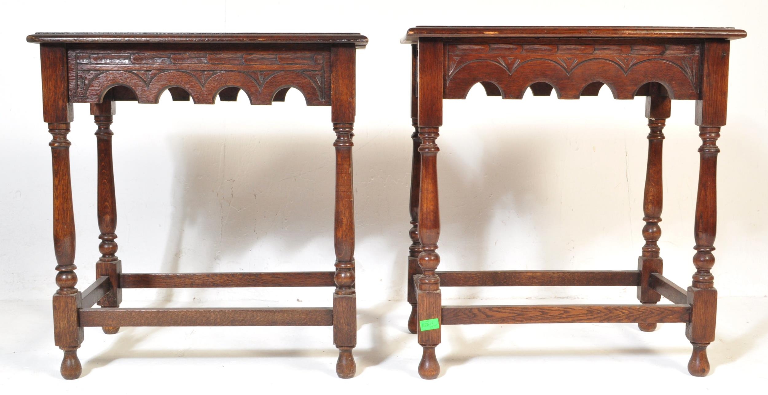 A pair of 20th century Jacobean Revival circa 1920soak side occasional tables, each with carved decoration to top over curved apron, raised over turned wood supports.