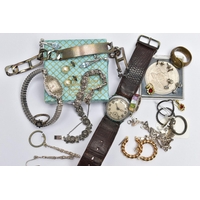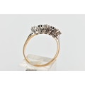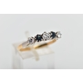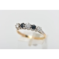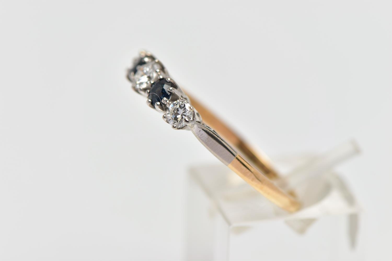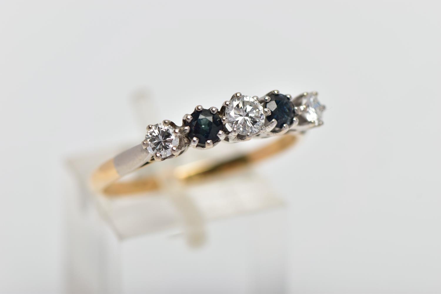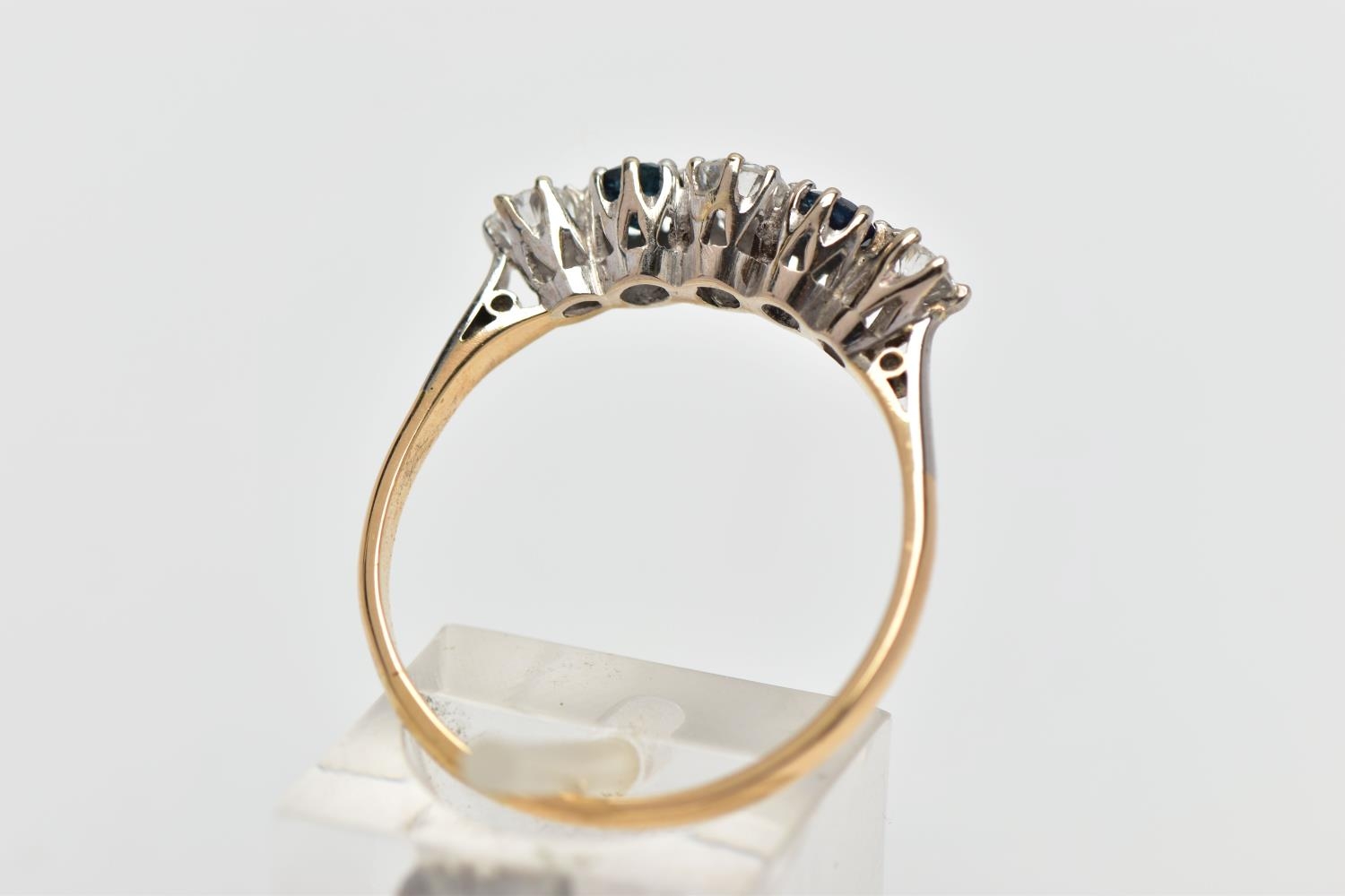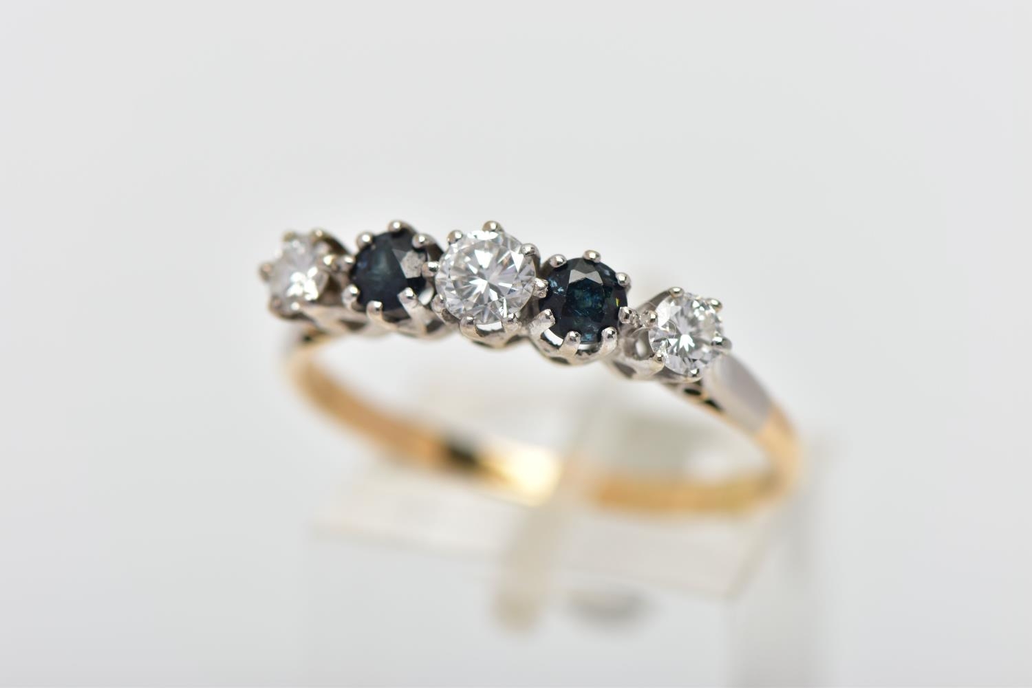 A YELLOW AND WHITE METAL DIAMOND AND SAPPHIRE FIVE STONE RING, set with three graduating round brilliant cut diamonds and two sapphires, estimated total diamond weight 0.50ct, assessed colour H-I colour, assessed clarity VS-SI, stamp rubbed, partially reads plat, ring size U 1/2, approximate gross weight 3.2 grams (condition report: overall condition good, diamonds bright and lively, sapphires included)