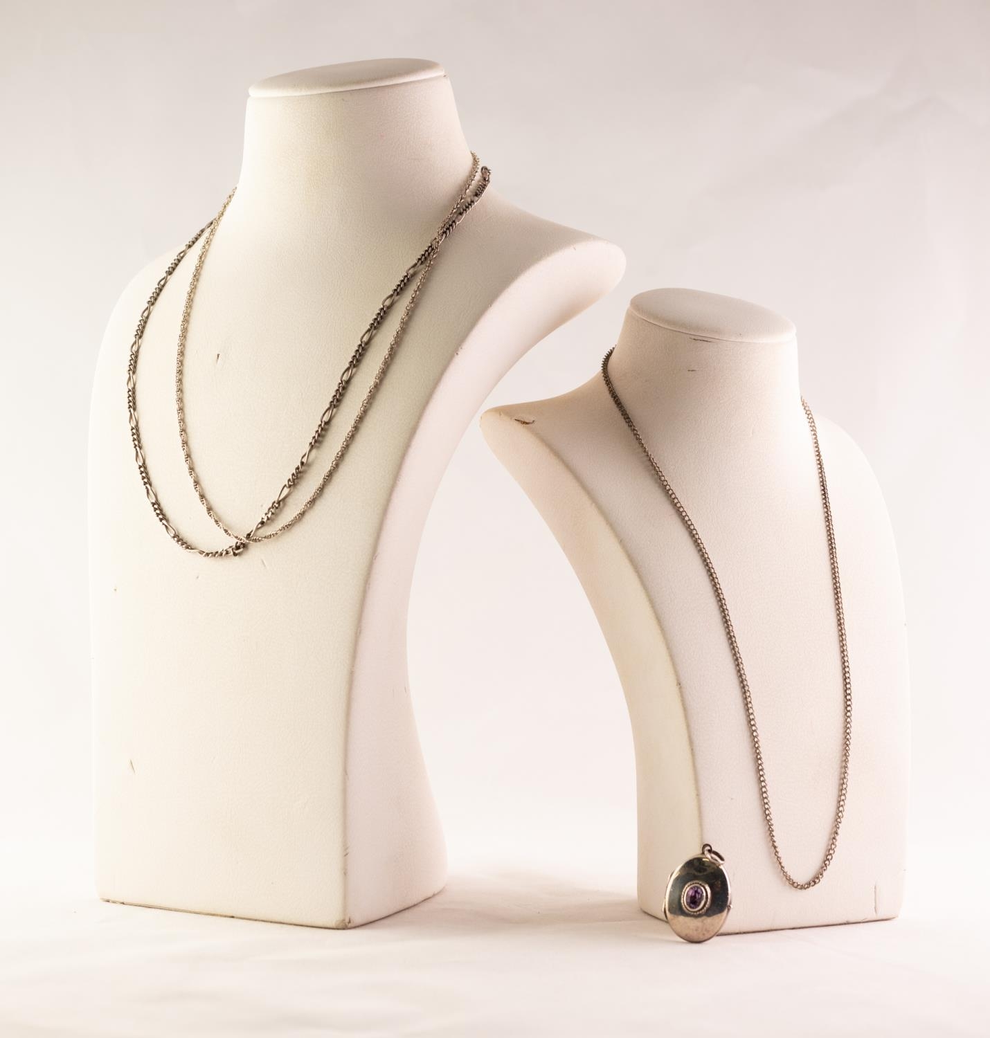 OVAL SILVER AMETHYST SET LOCKET and three silver and metal CHAINS (4)