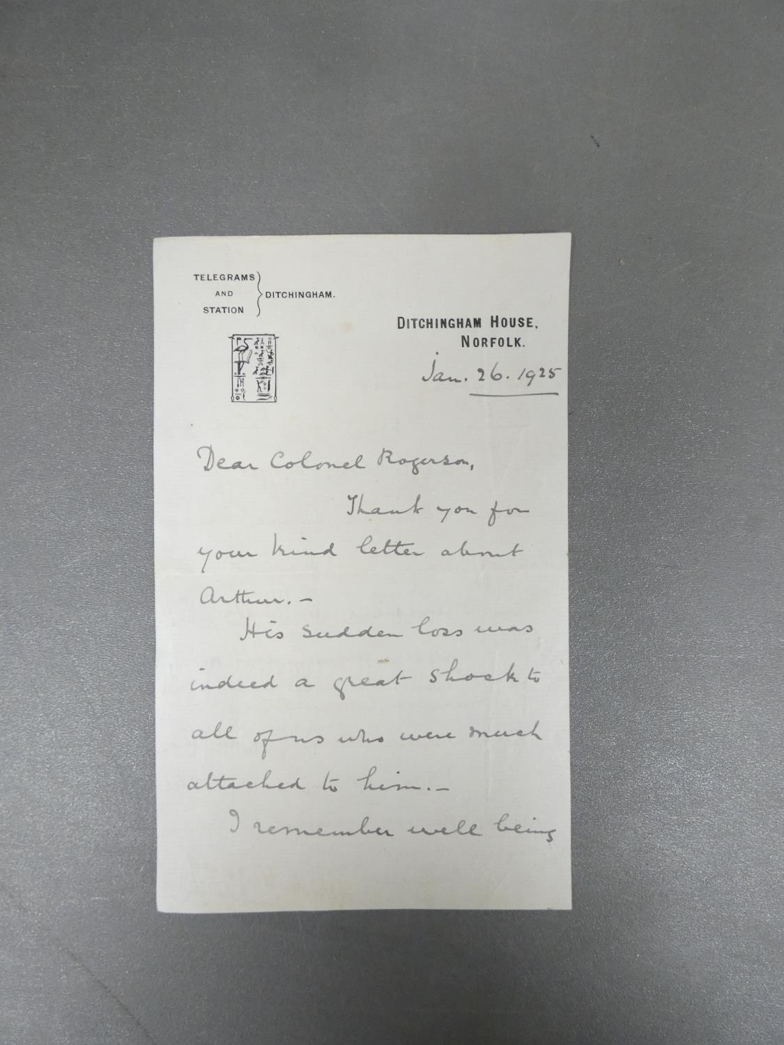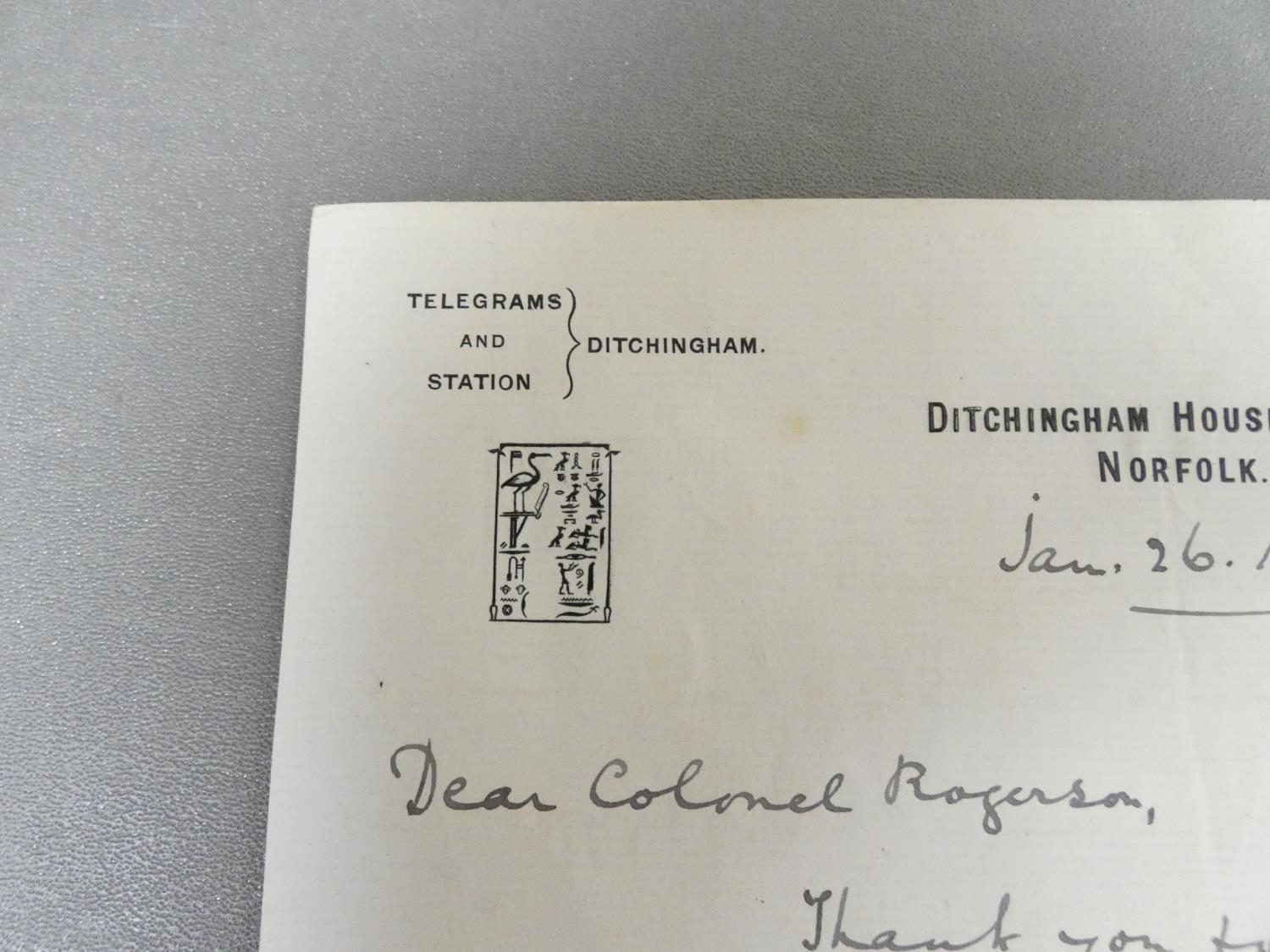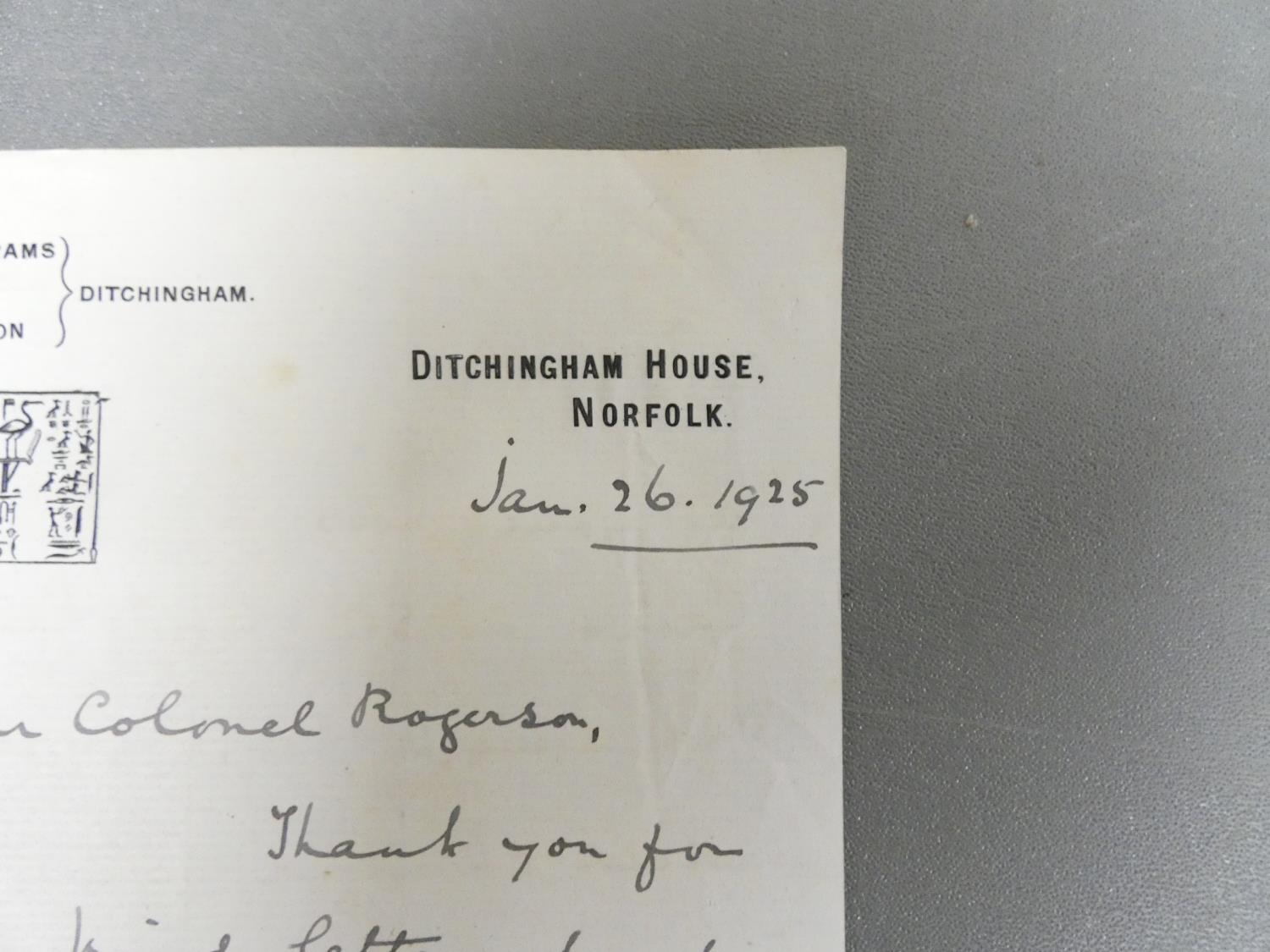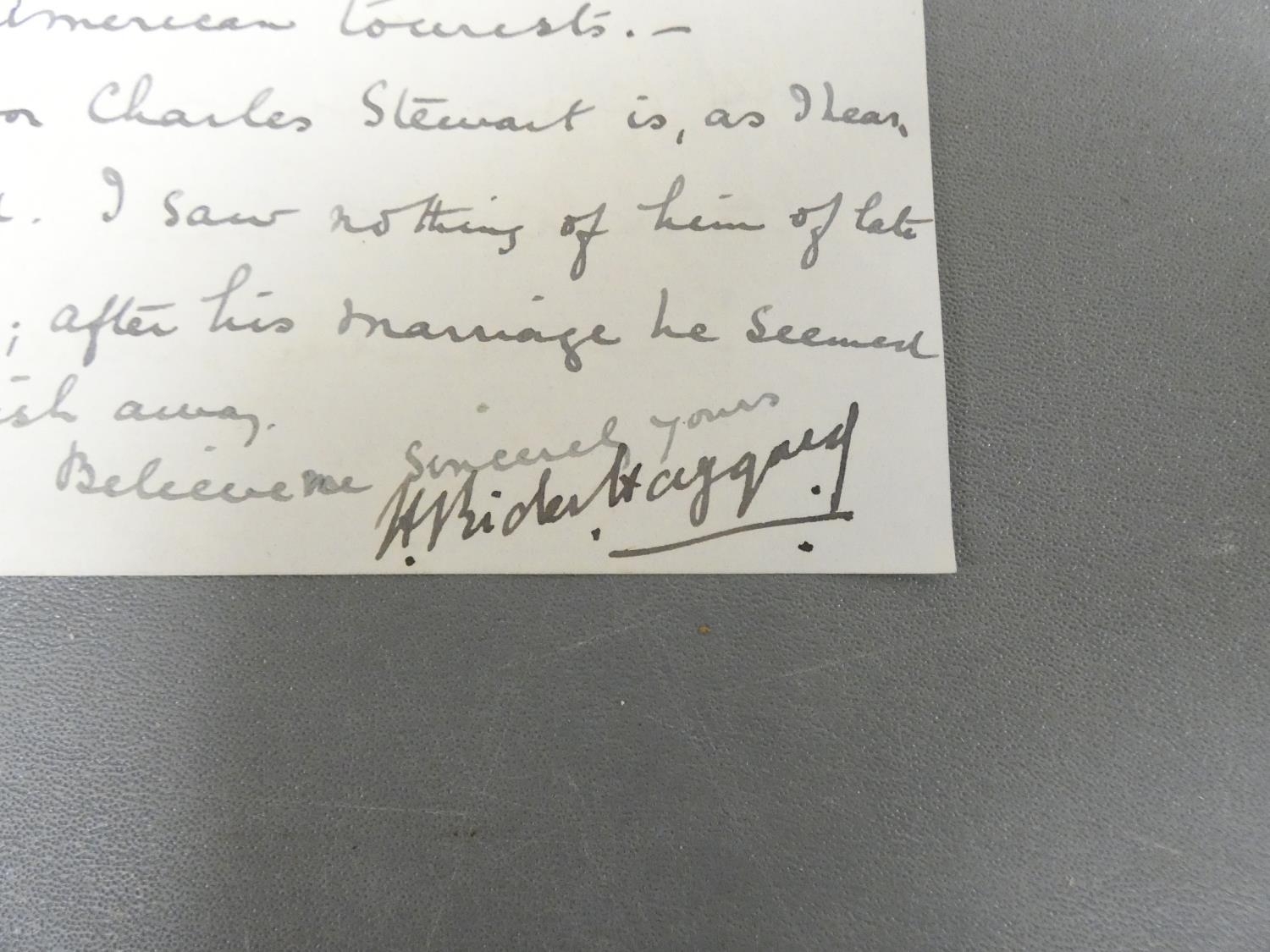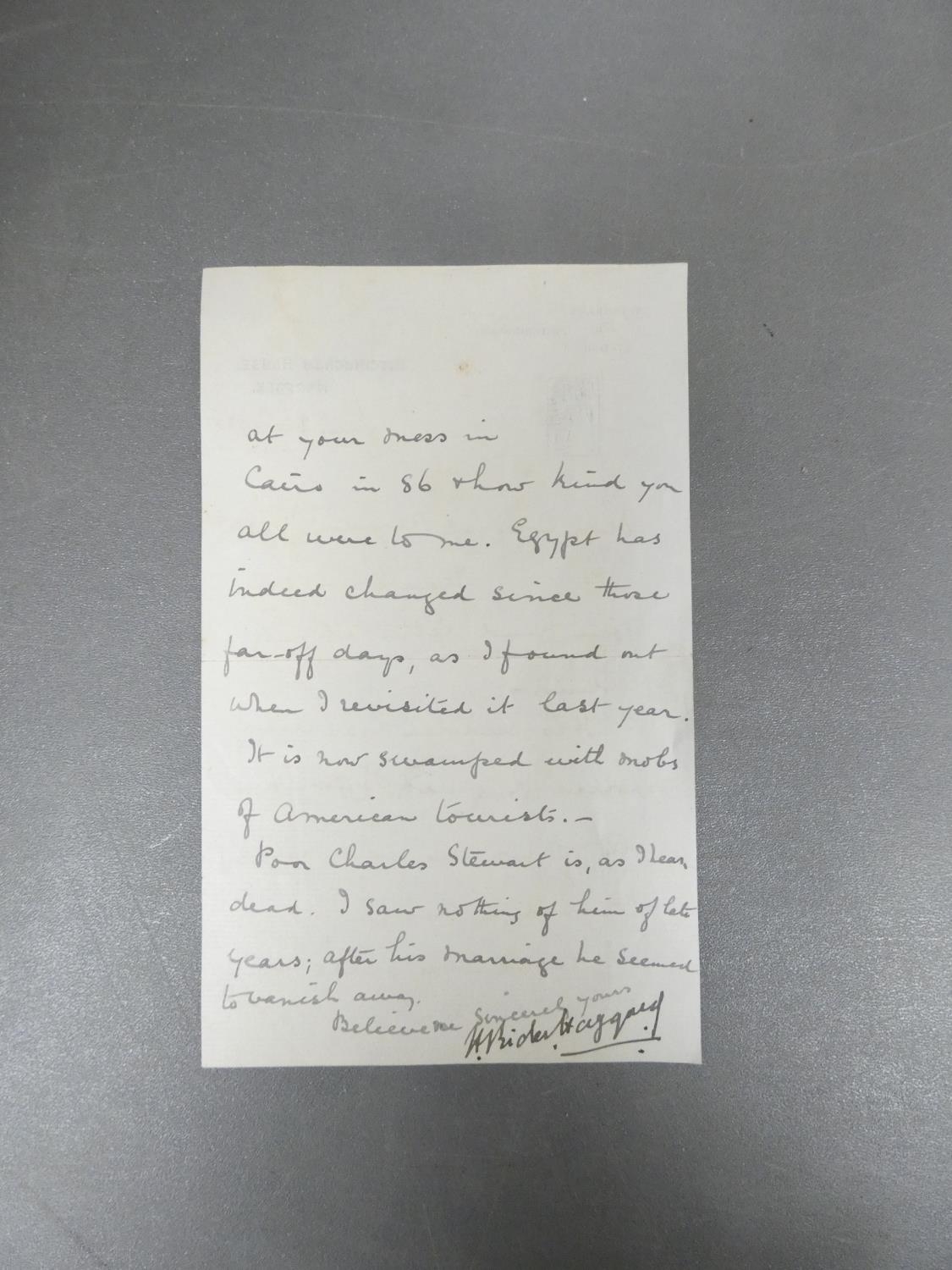 HAGGARD SIR HENRY RIDER. Manuscript letter, Ditchingham House, Jan. 26 1925 to Colonel Rogerson (of Gillesbie, Lockerbie) replying to a letter from Rogerson regarding the sudden death of the author's brother. Haggard recalls being a guest in the regiment mess in Cairo in 1886, comments that Egypt is now "swamped with mobs of American tourists". This was written in the last year of Haggard's life & may be in the hand of an amanuensis but is clearly signed by Haggard himself.
