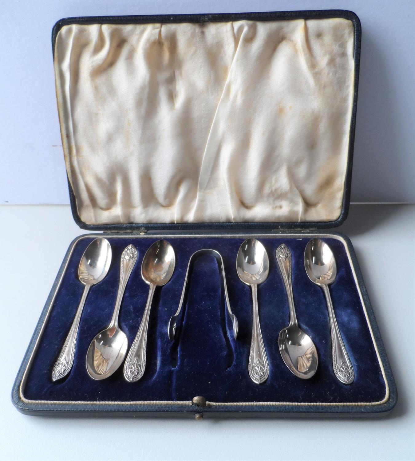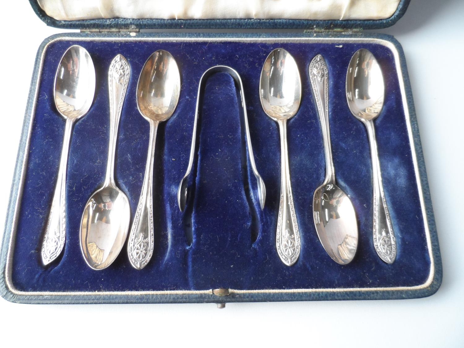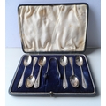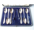 Cased set of 6 London 1927 silver spoons together with a pair of later sugar nips,