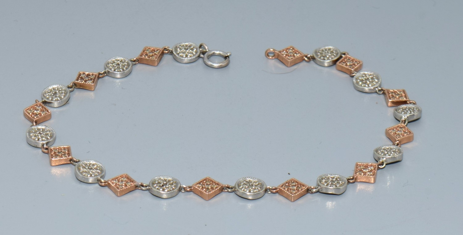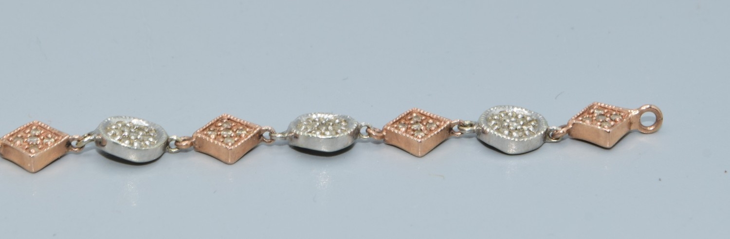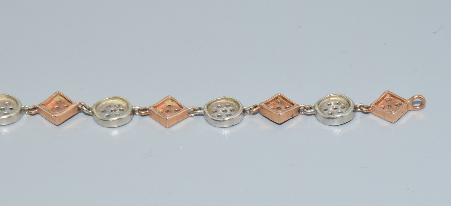 9ct twin colour gold bracelet with both square and round decoration set with accent Diamonds on each part a good secure catch 20cm long 5.7grams