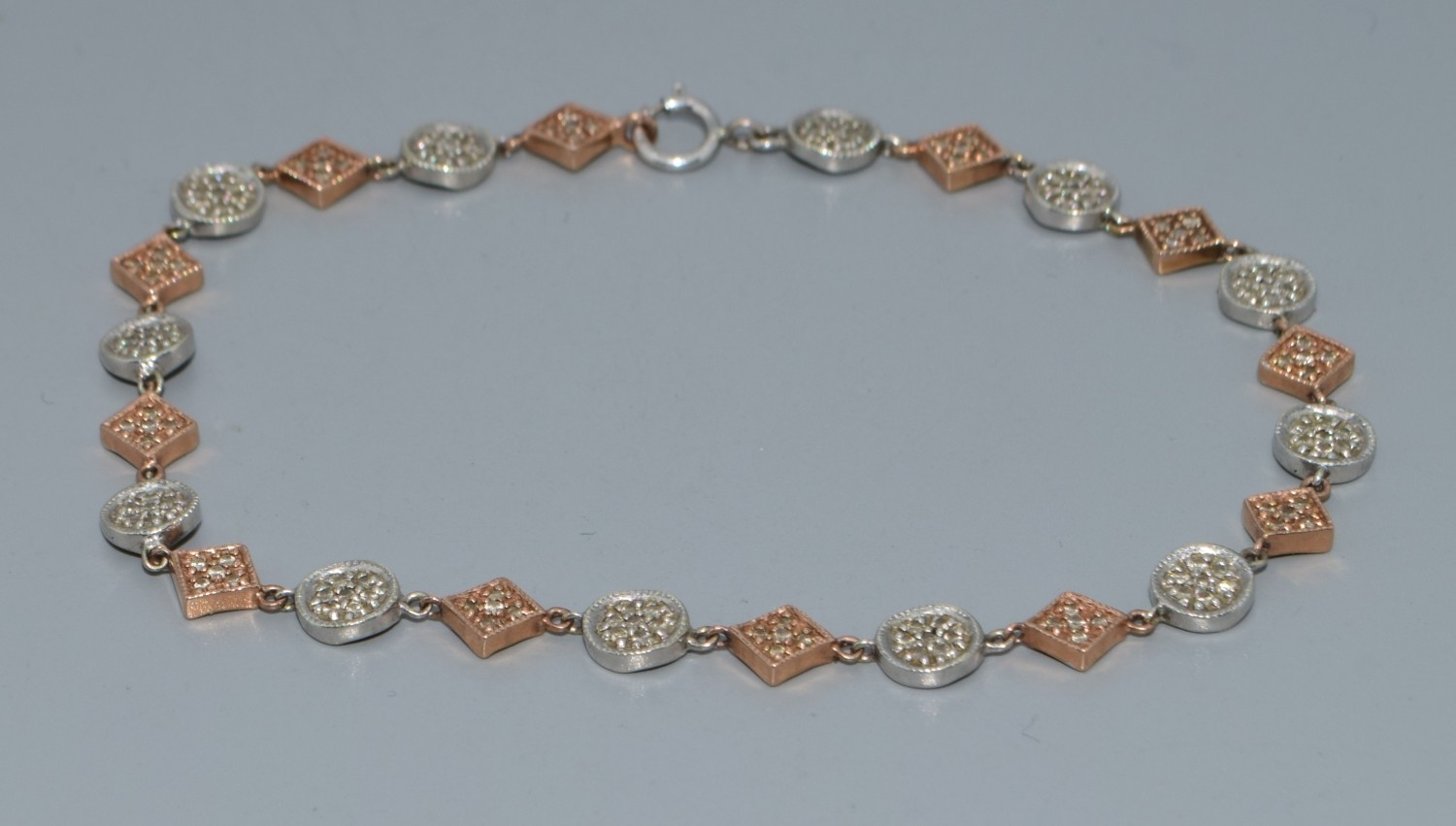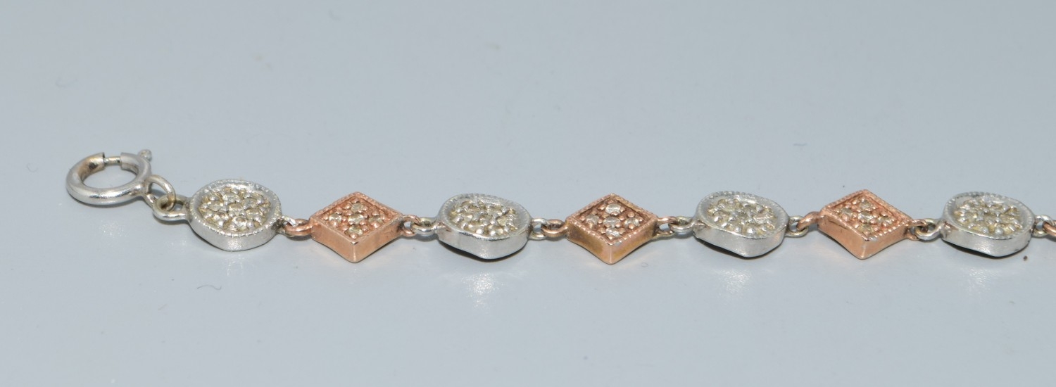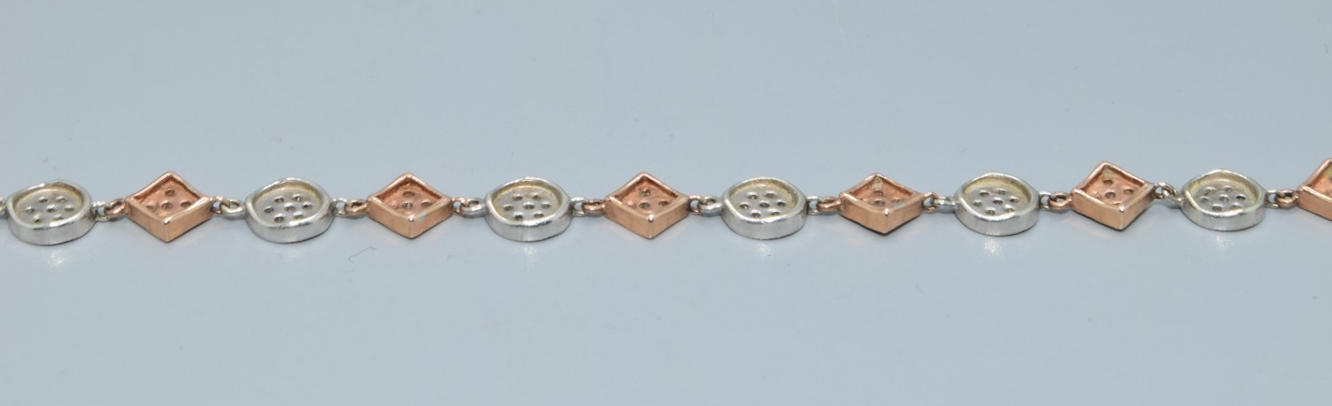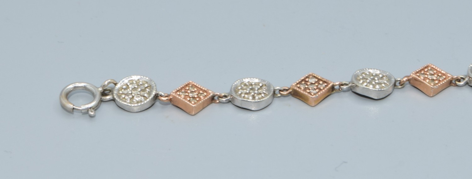 9ct twin colour gold bracelet with both square and round decoration set with accent Diamonds on each part a good secure catch 20cm long 5.7grams