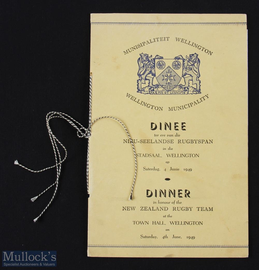 1949 NZ in S Africa Signed Rugby Menu: Magnificent menu from the Boland v NZ dinner at Wellington, 4th June, signed v neatly by the entire All Black squad and management. VG, a treasure