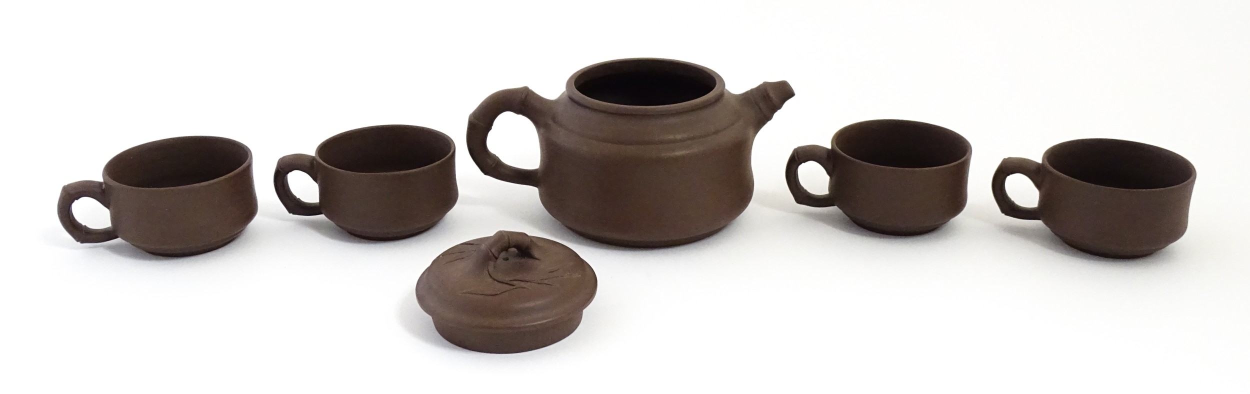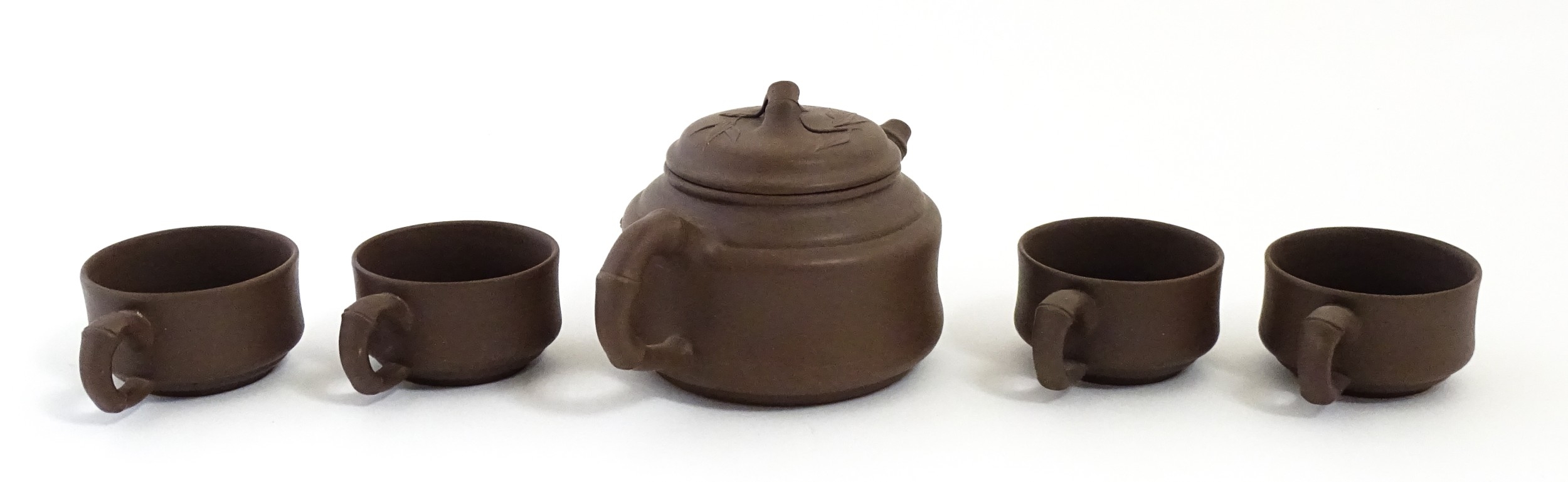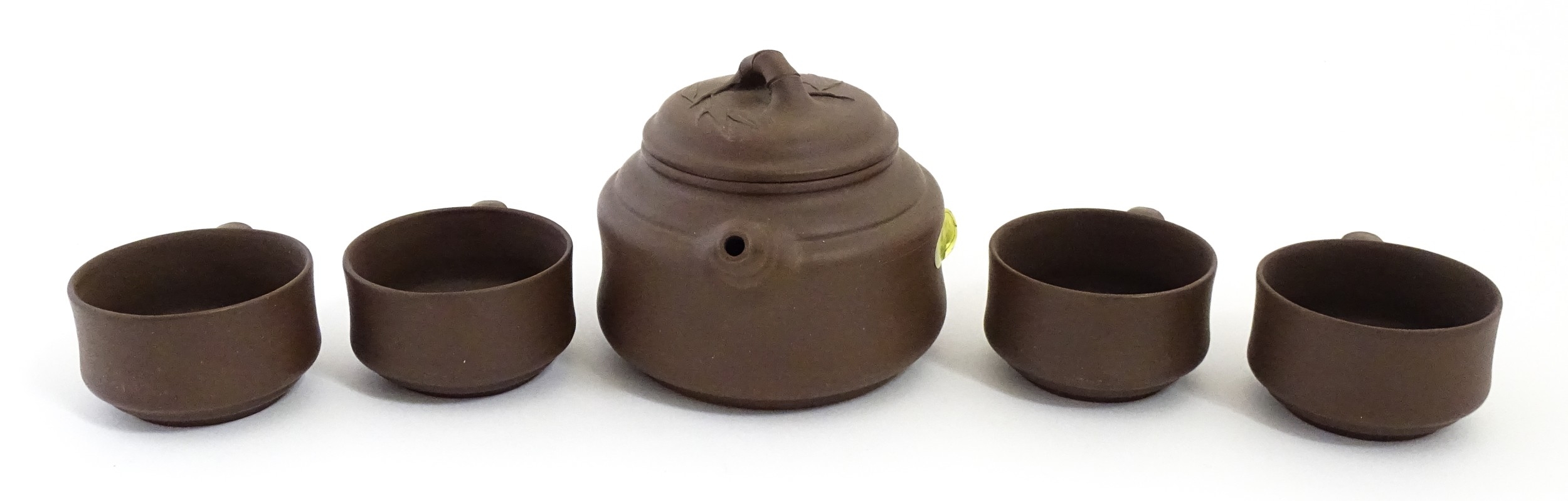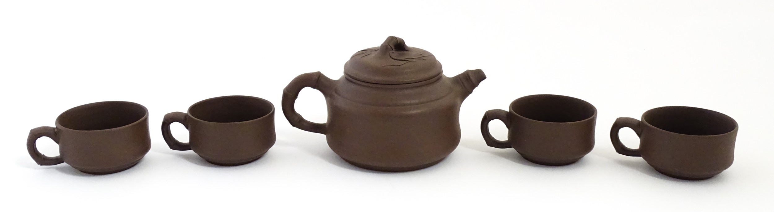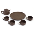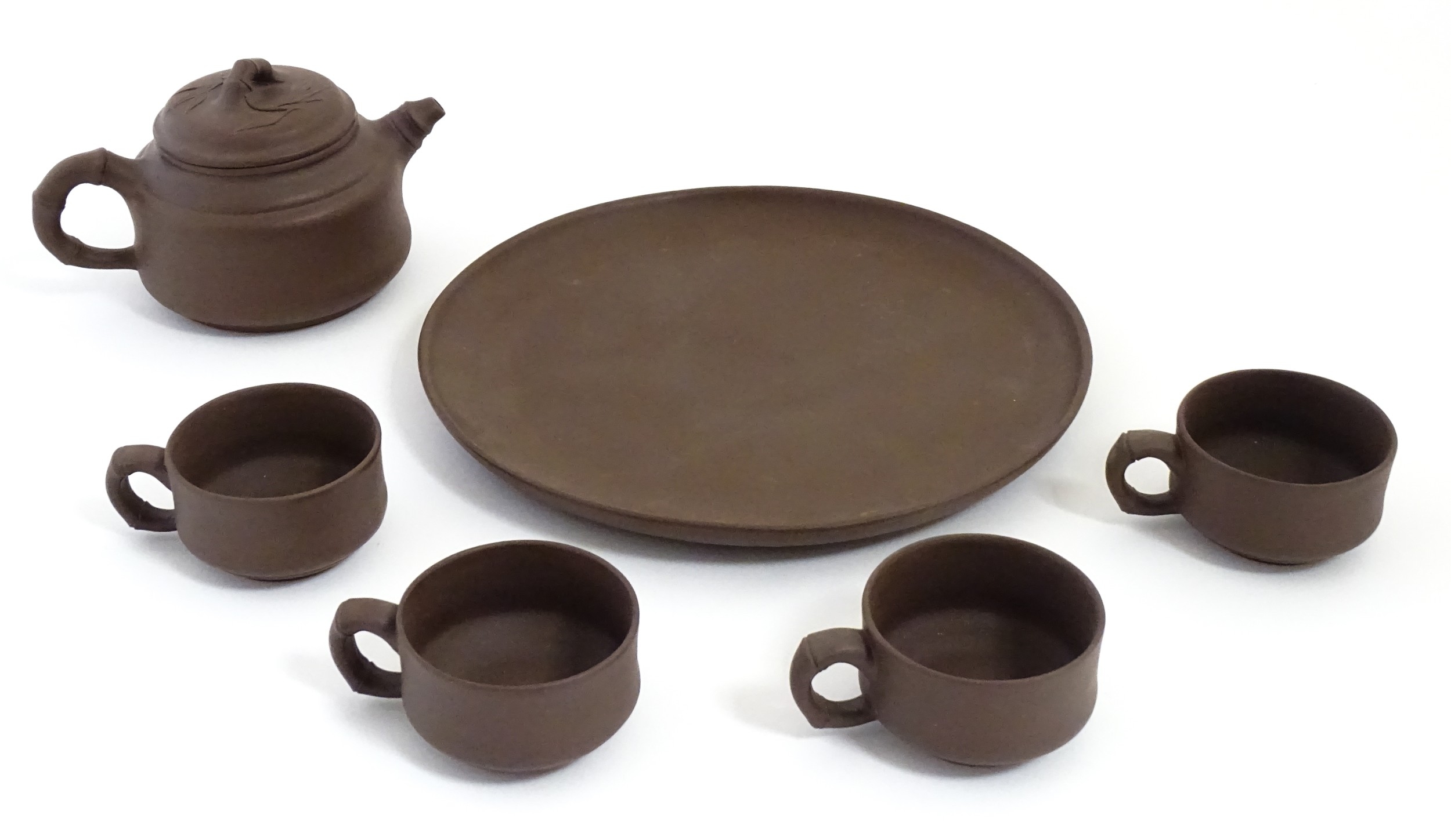 A Chinese Yixing style tea set comprising teapot, four cups and a circular tray / dish. Impressed Character marks under. Teapot approx. 6 1/4" wide overall (6)