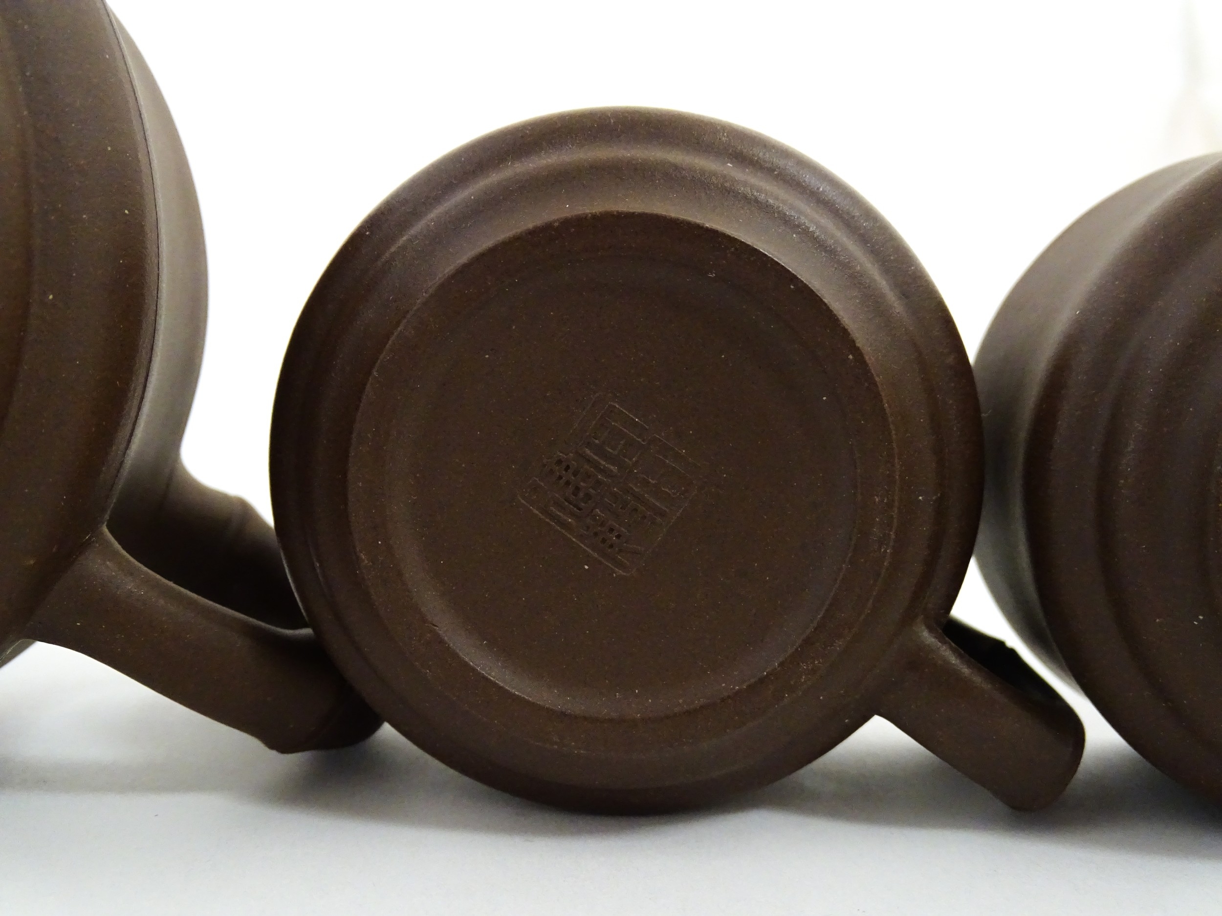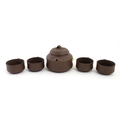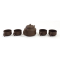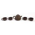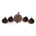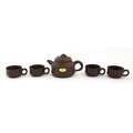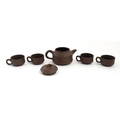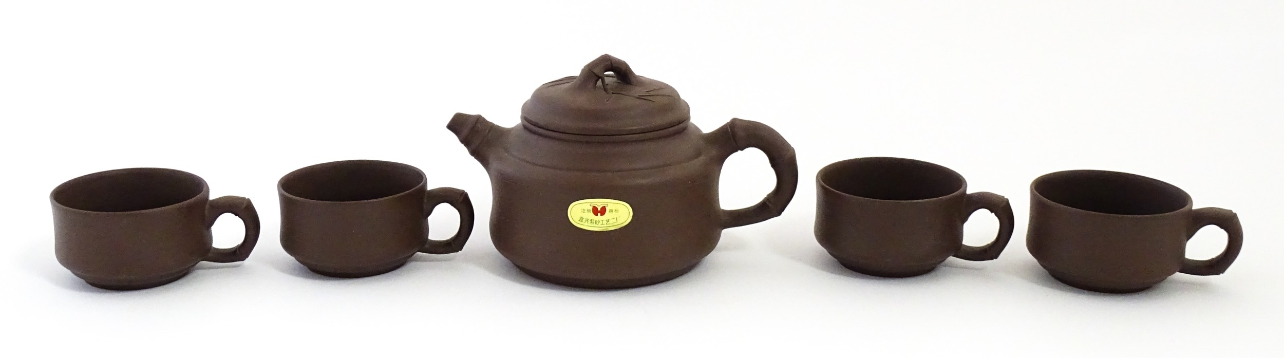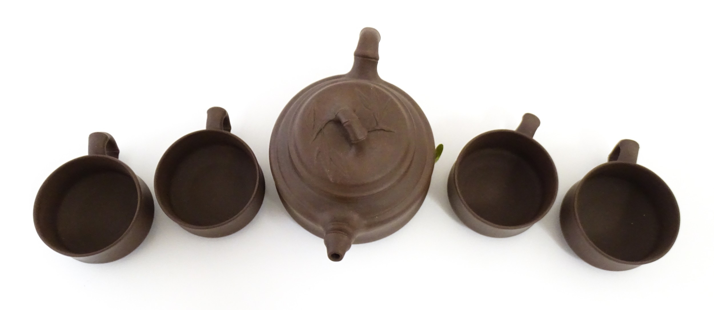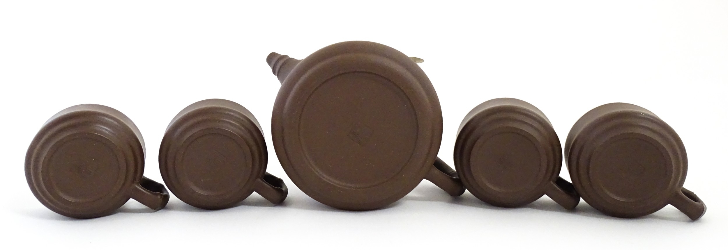 A Chinese Yixing style tea set comprising teapot, four cups and a circular tray / dish. Impressed Character marks under. Teapot approx. 6 1/4" wide overall (6)