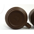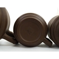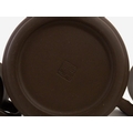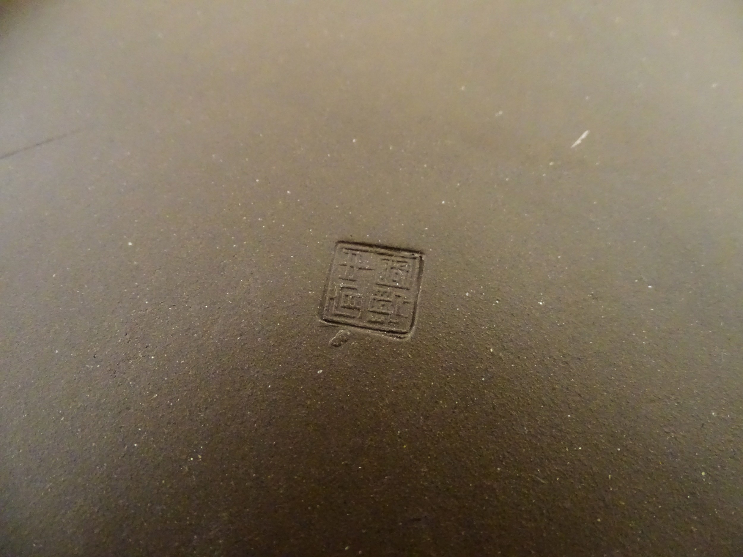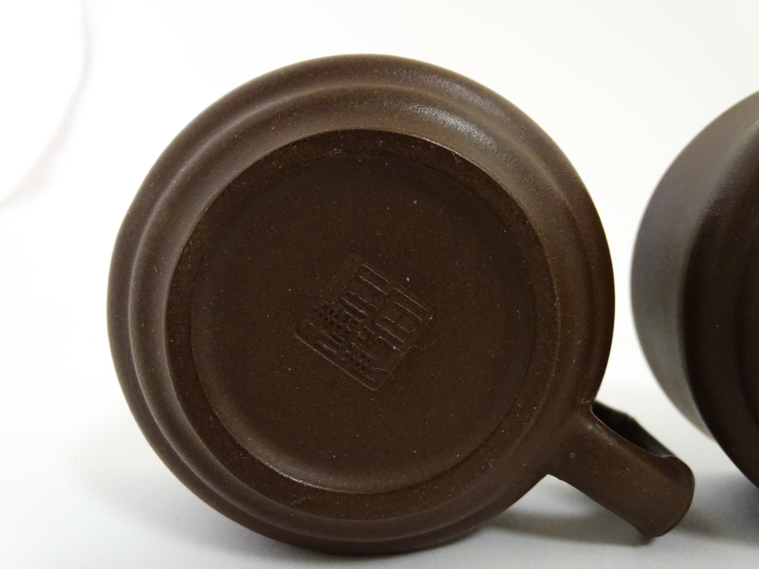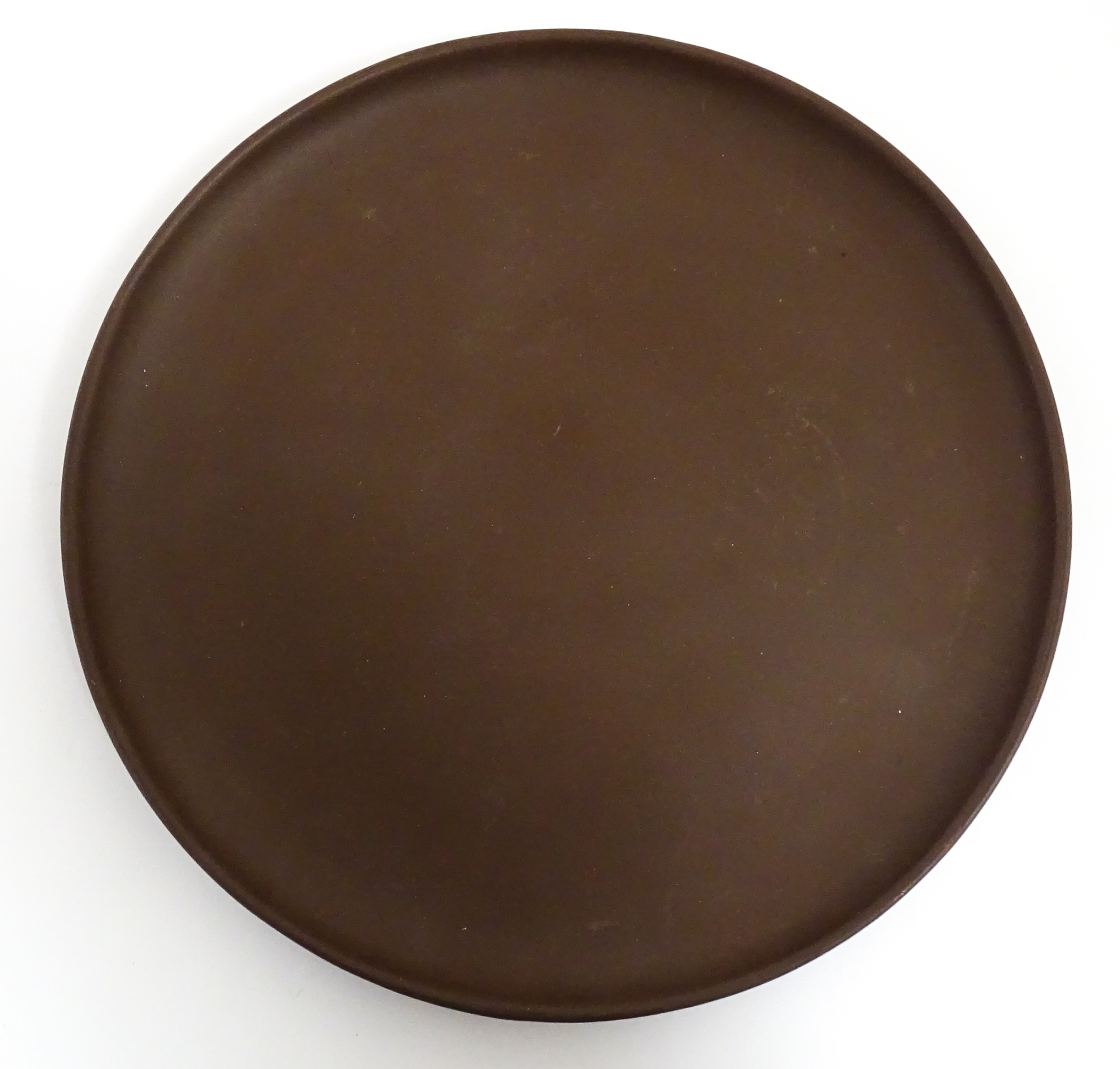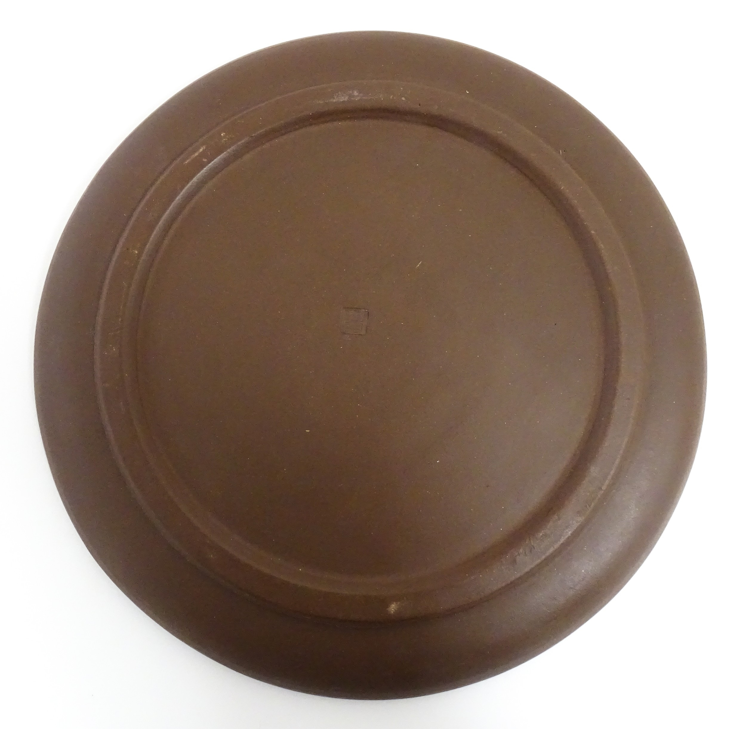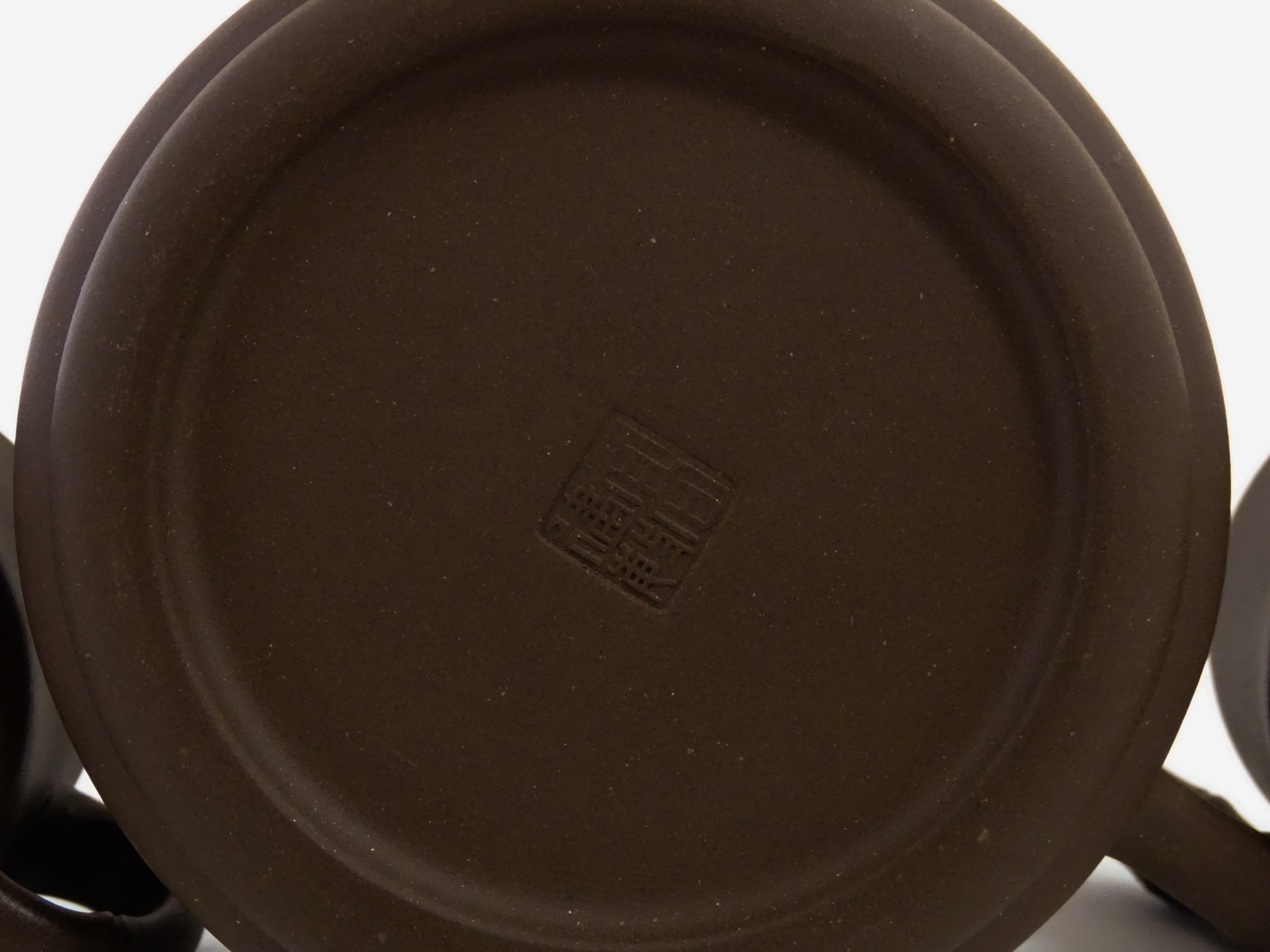 A Chinese Yixing style tea set comprising teapot, four cups and a circular tray / dish. Impressed Character marks under. Teapot approx. 6 1/4" wide overall (6)