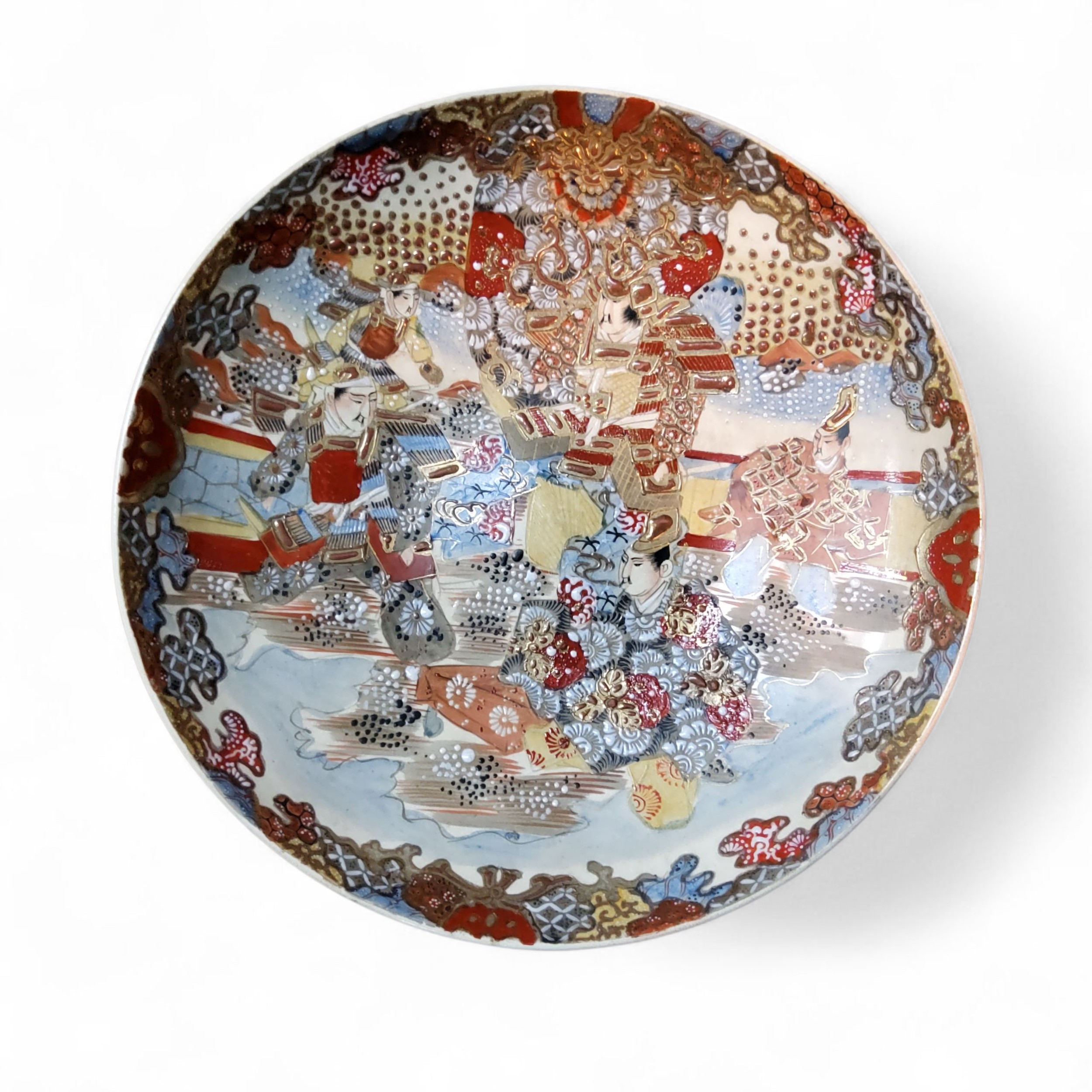 A Japanese satsuma circular charger, decorated with warriors, 37cm diam, Meiji period