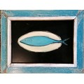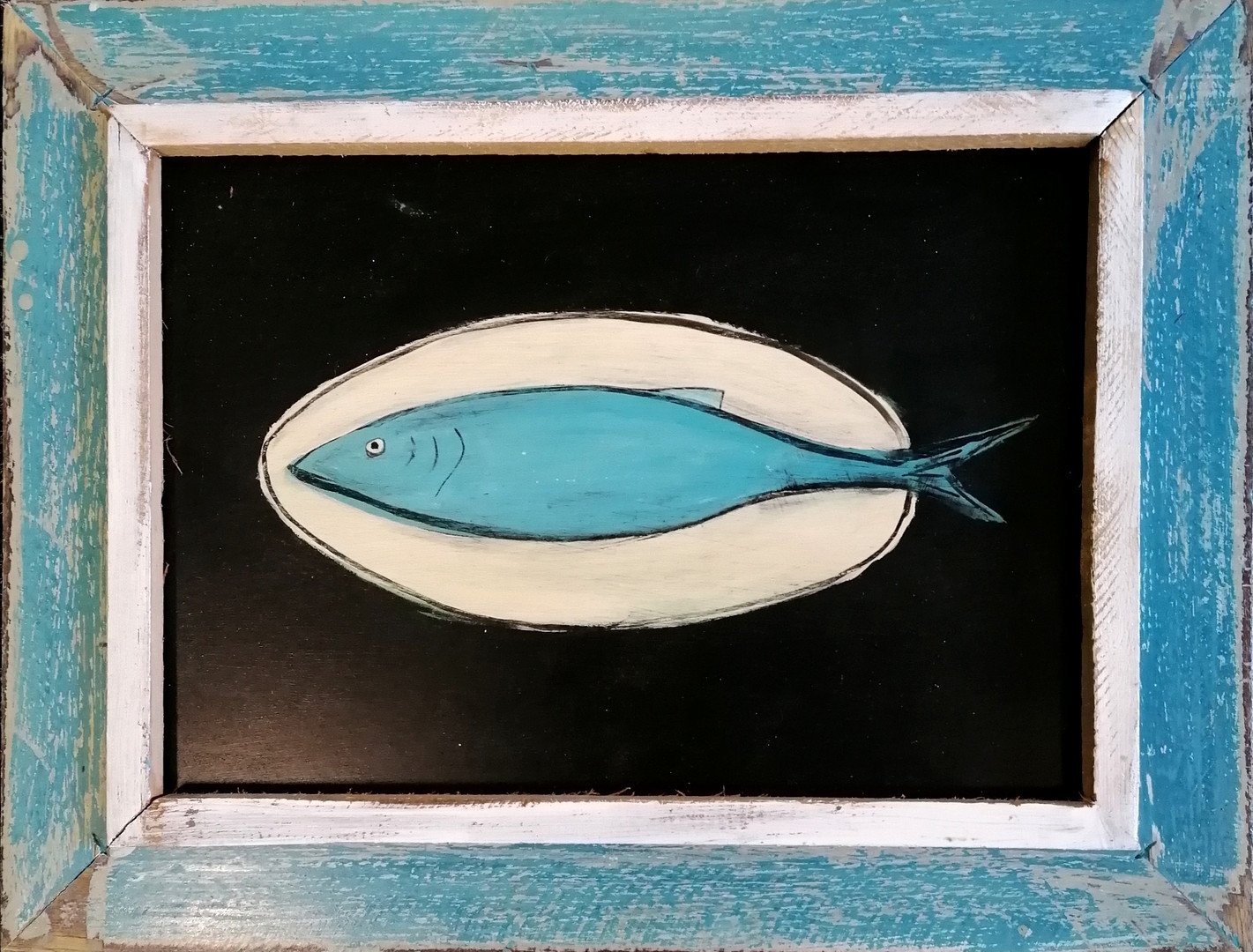 Terence Robert Wood contemporary oil painting blue fish on a plate frame 55cm x 42cm.