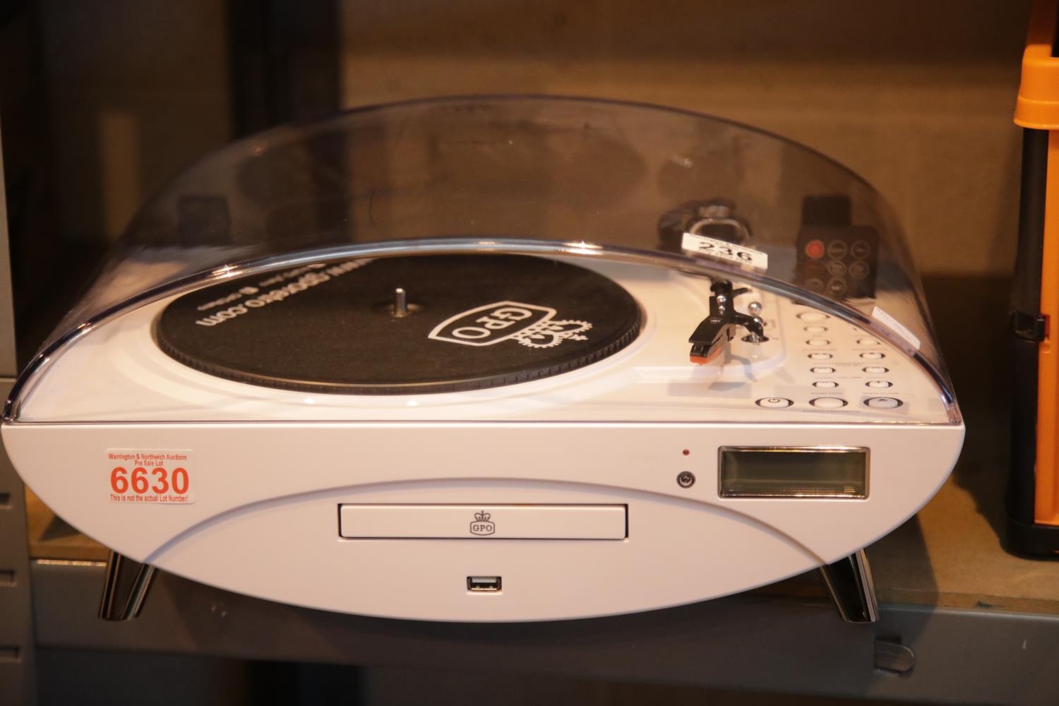 White GPO Jive music centre - 3 speed turntable; CD/MP3/USB player; FM radio and remote control. This lot is not available for in-house P&P.