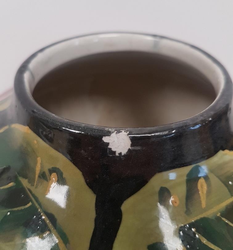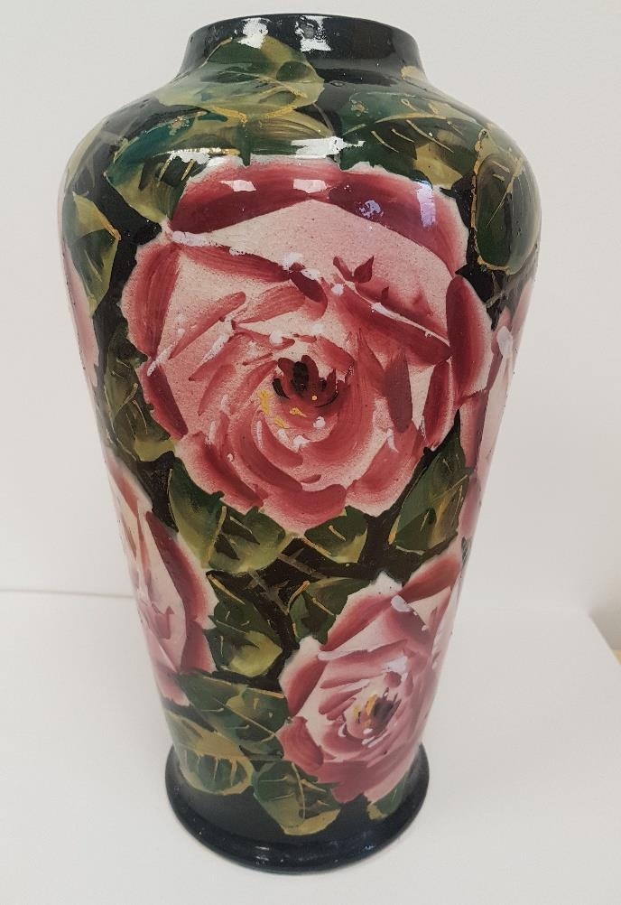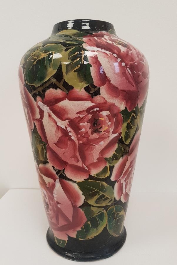 Large Antique 1910 Wemyss Vase with hand painted Rose Design by Karel Nikolai. Wemyss mark and drilled to base. 33cm in height, some chipping to rim.