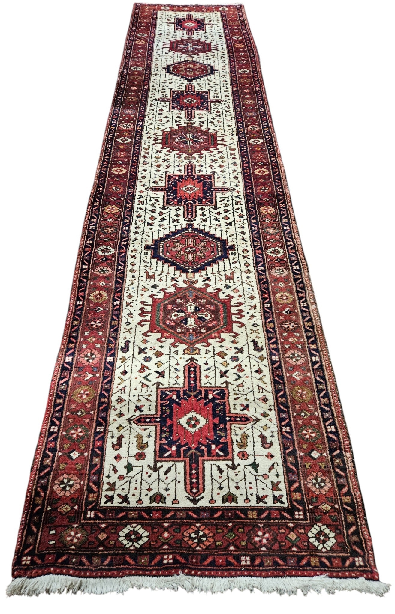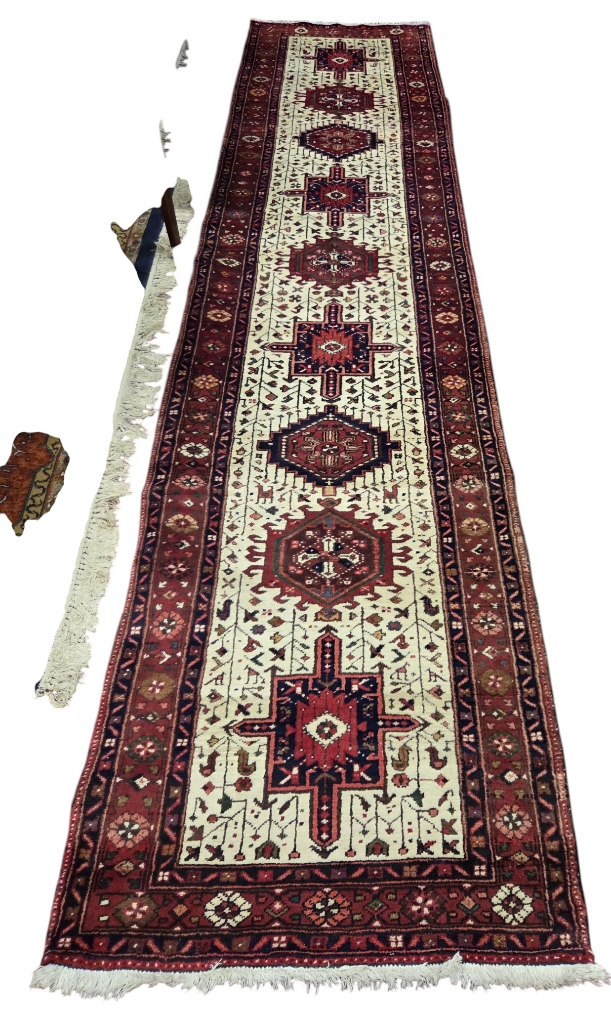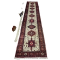 An Ivory ground full wall pile Persian Tabriz Runner with repeating bespoke central medallion design. 398 x 93 cm approx.