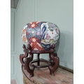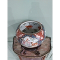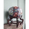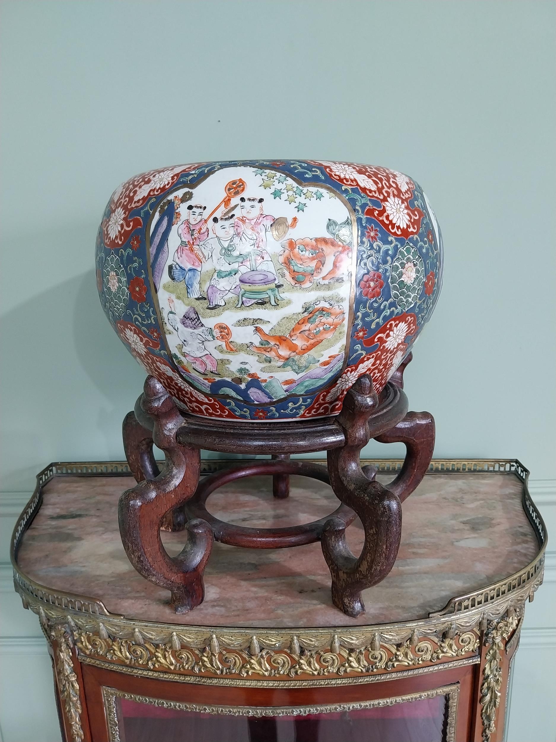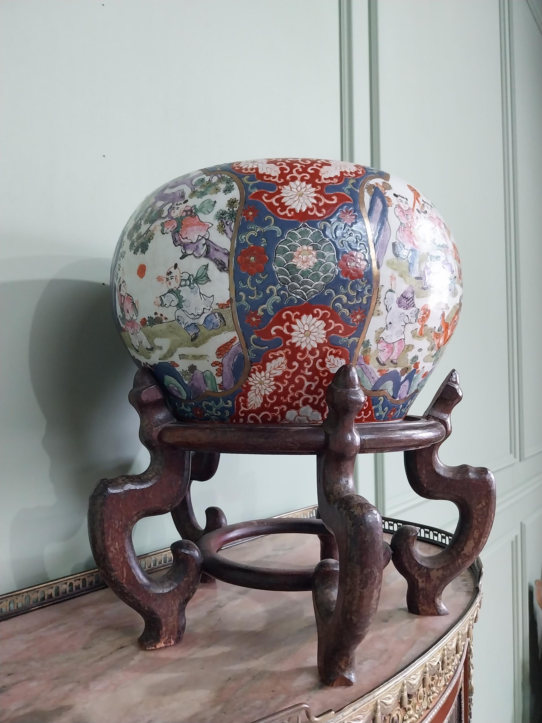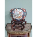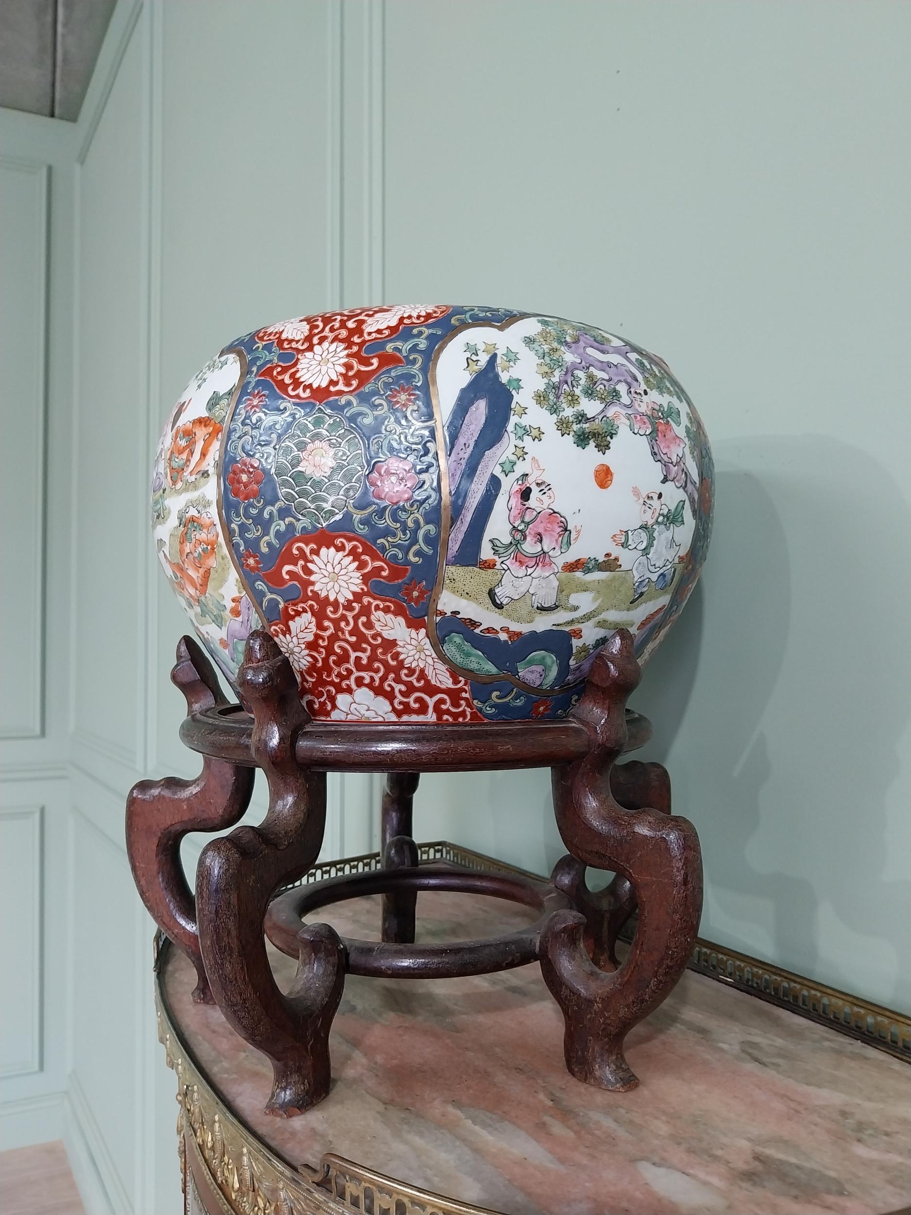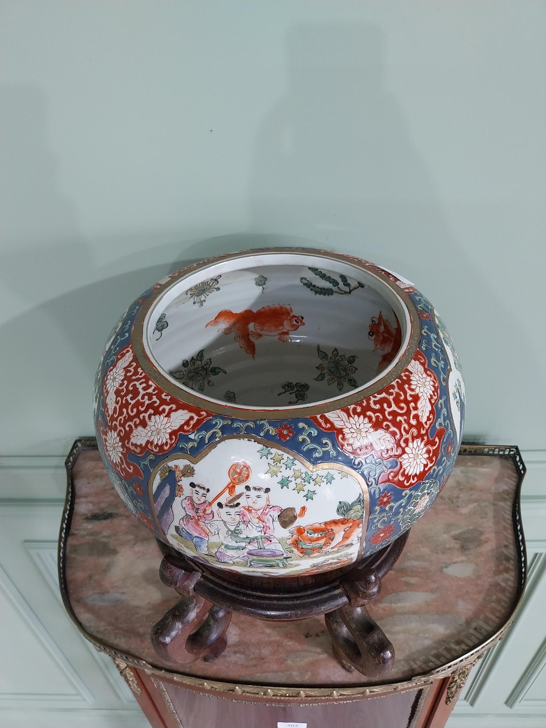 Decorative Oriental hand painted ceramic jardini�re on hard wood stand {41 cm H x 36 cm Dia.}.