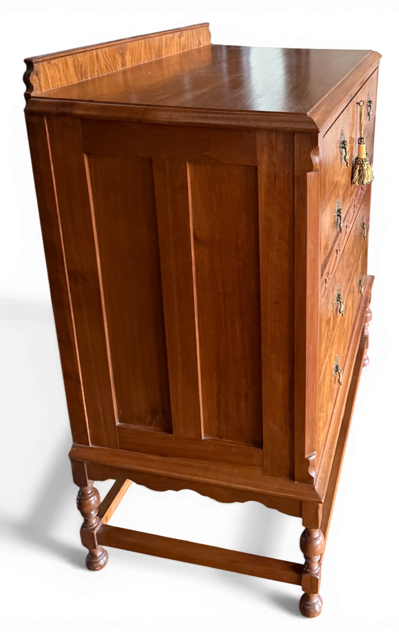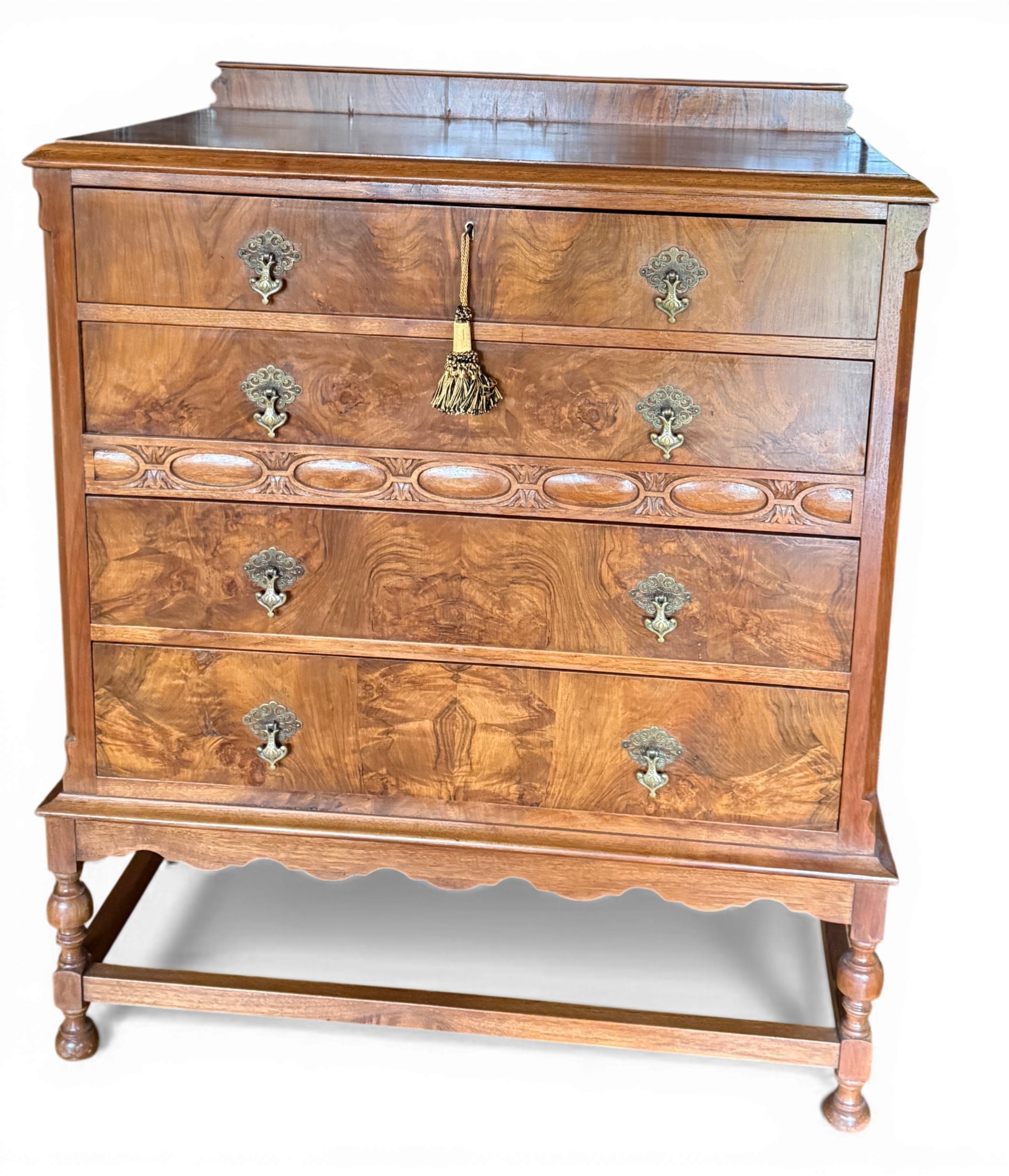 A chest of four drawers with drop brass handles. 85 w x 49 d x 100cm h.