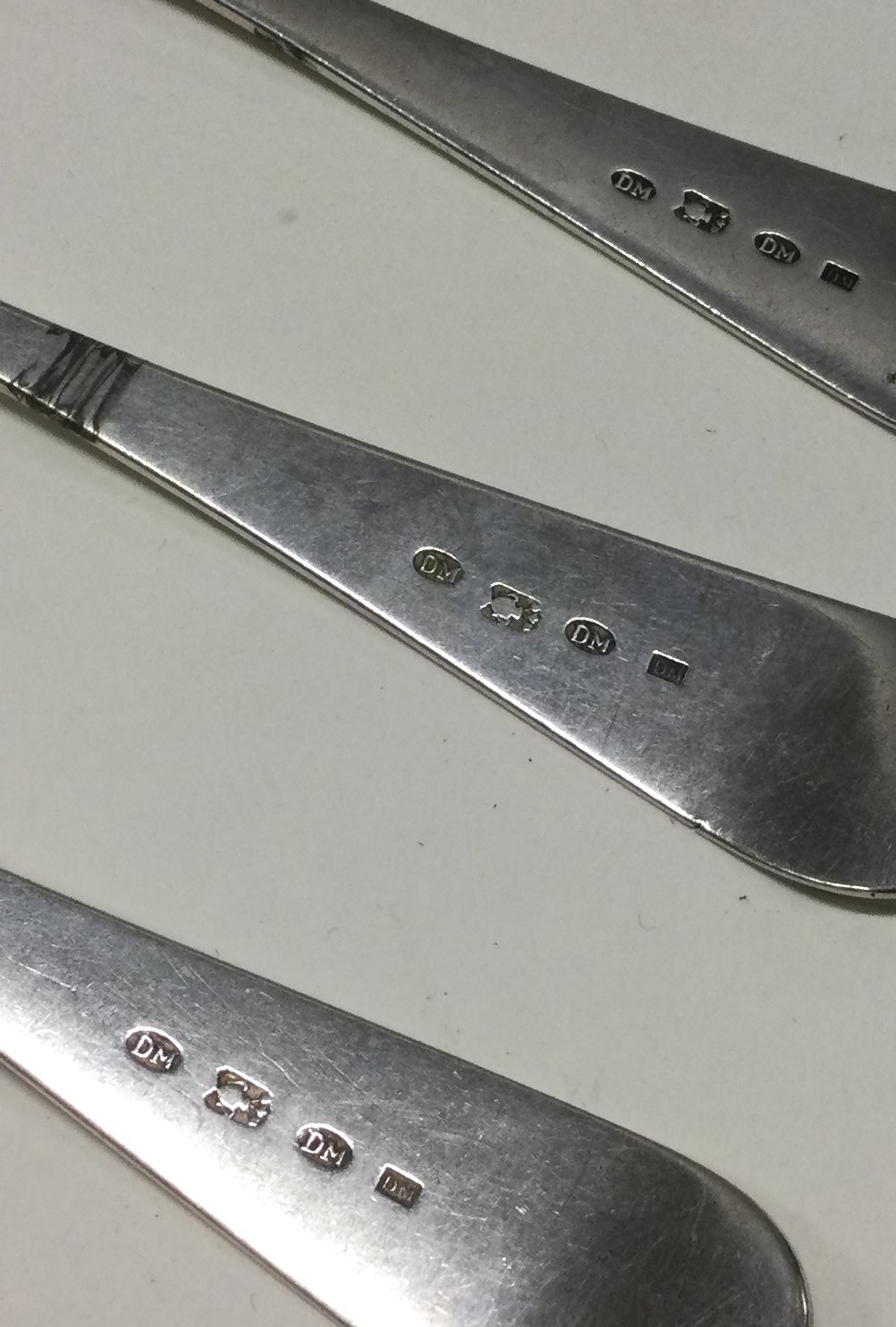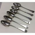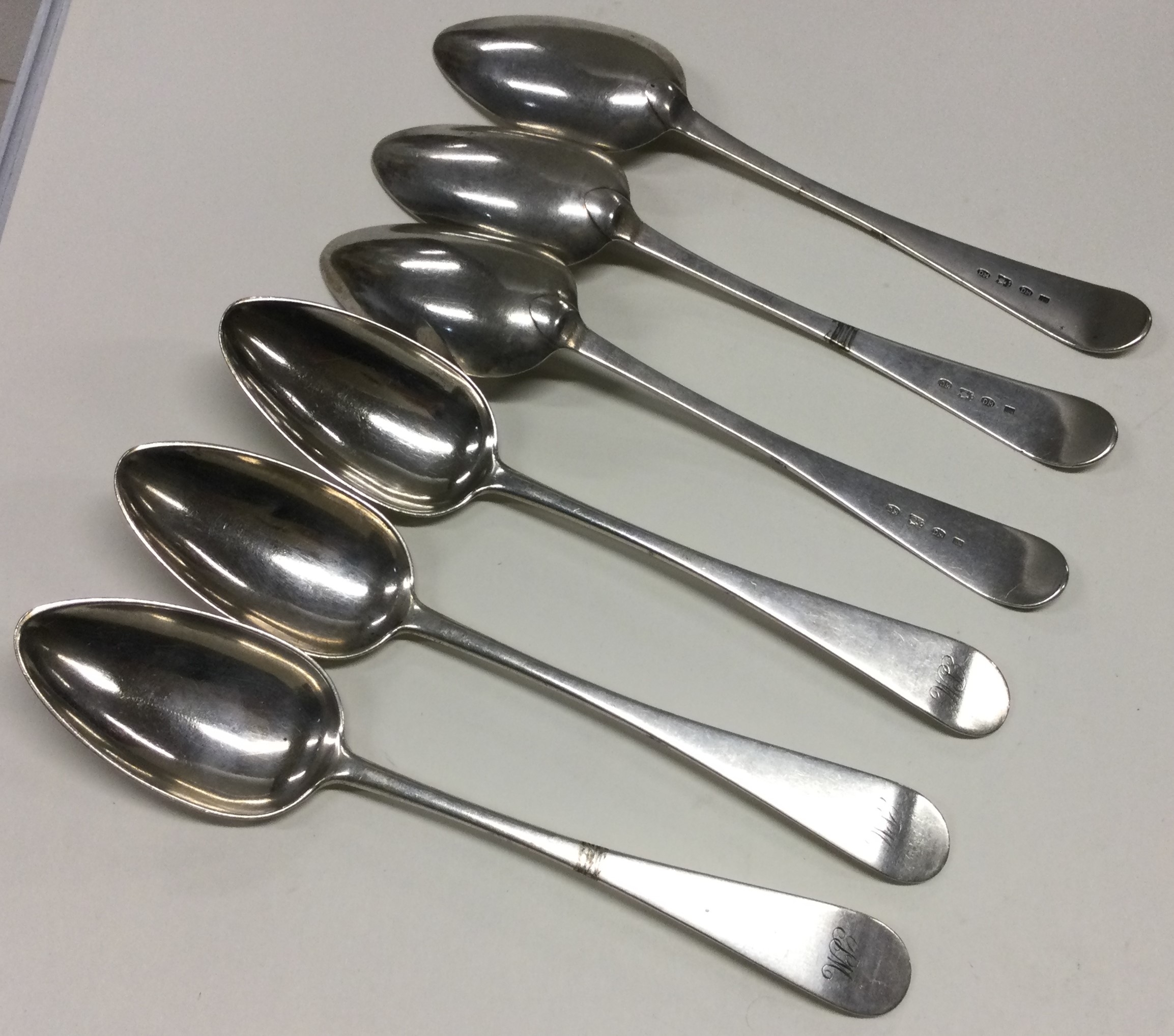 DUNDEE: A set of six 18th Century Scottish silver serving spoons. Approx. 396 grams. Est. £300 - £400.