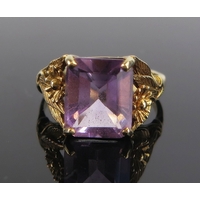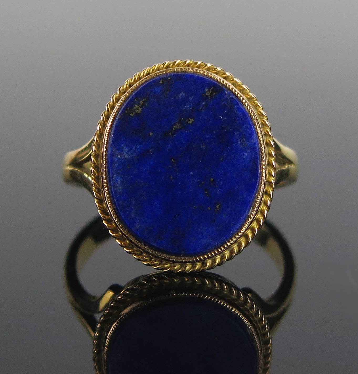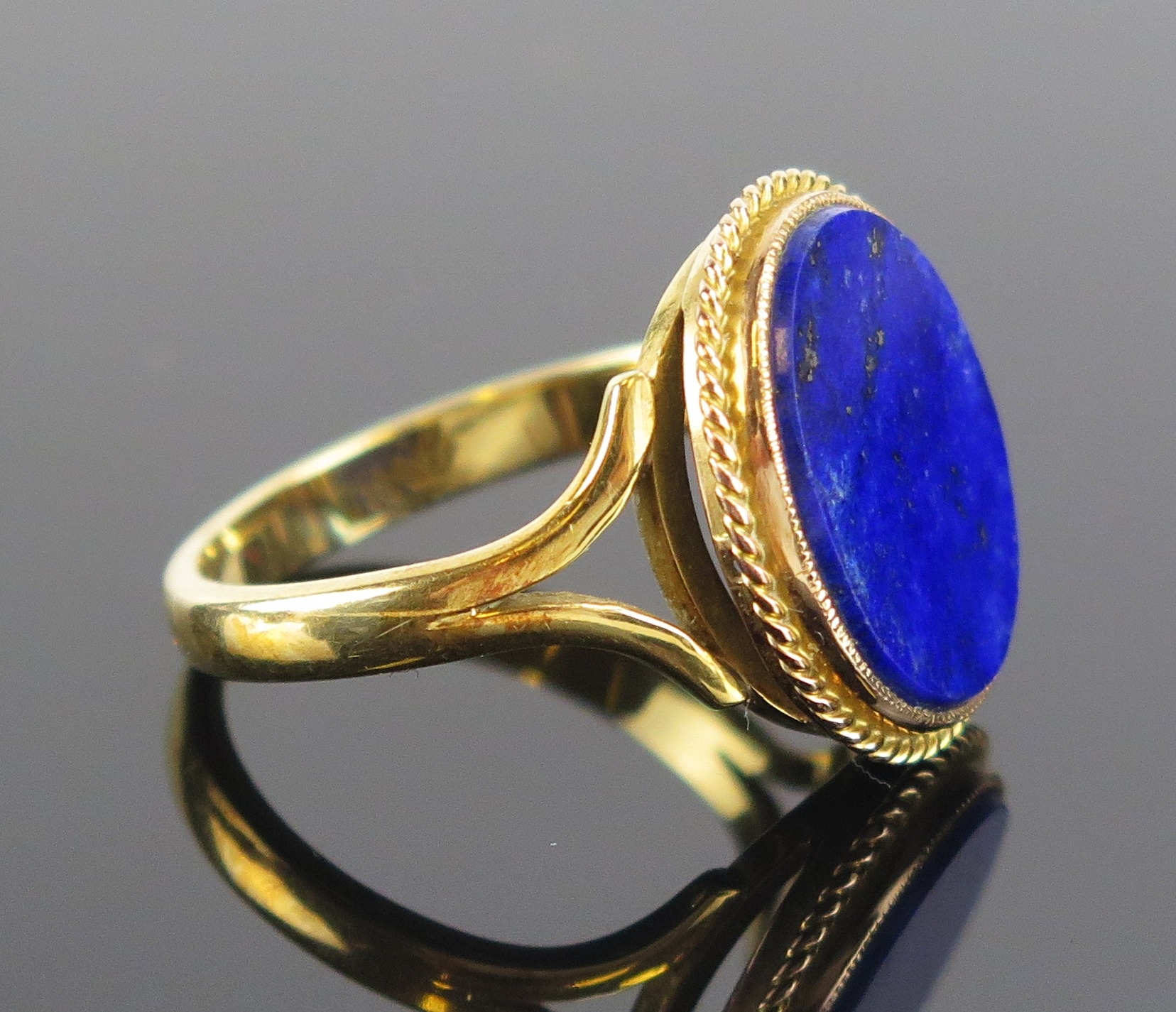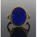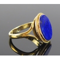 A lapis lazuli ring in an 18ct gold setting, 20x17mm head, size V.5, stamped 18CT, 7.53g. Boxed