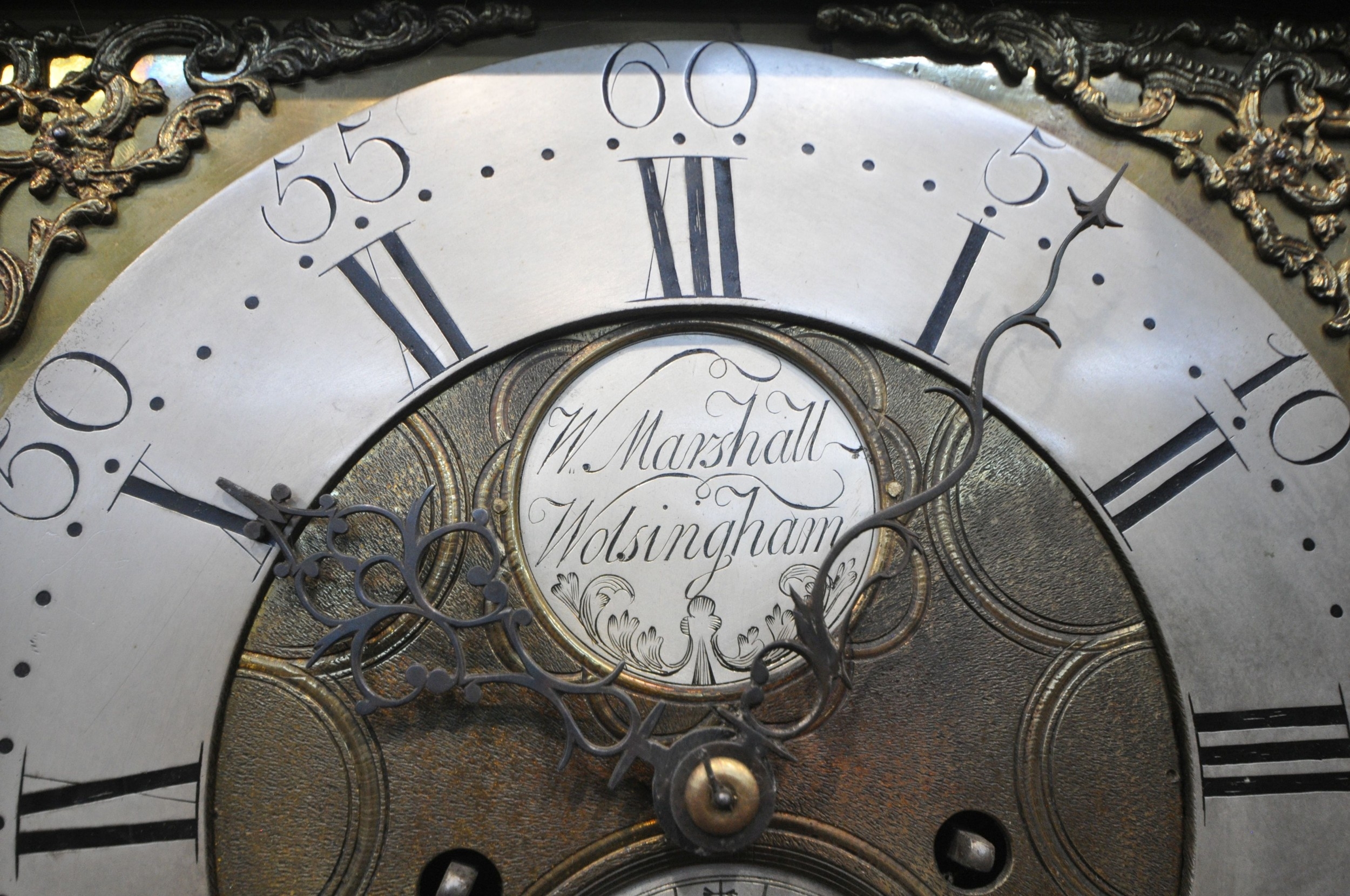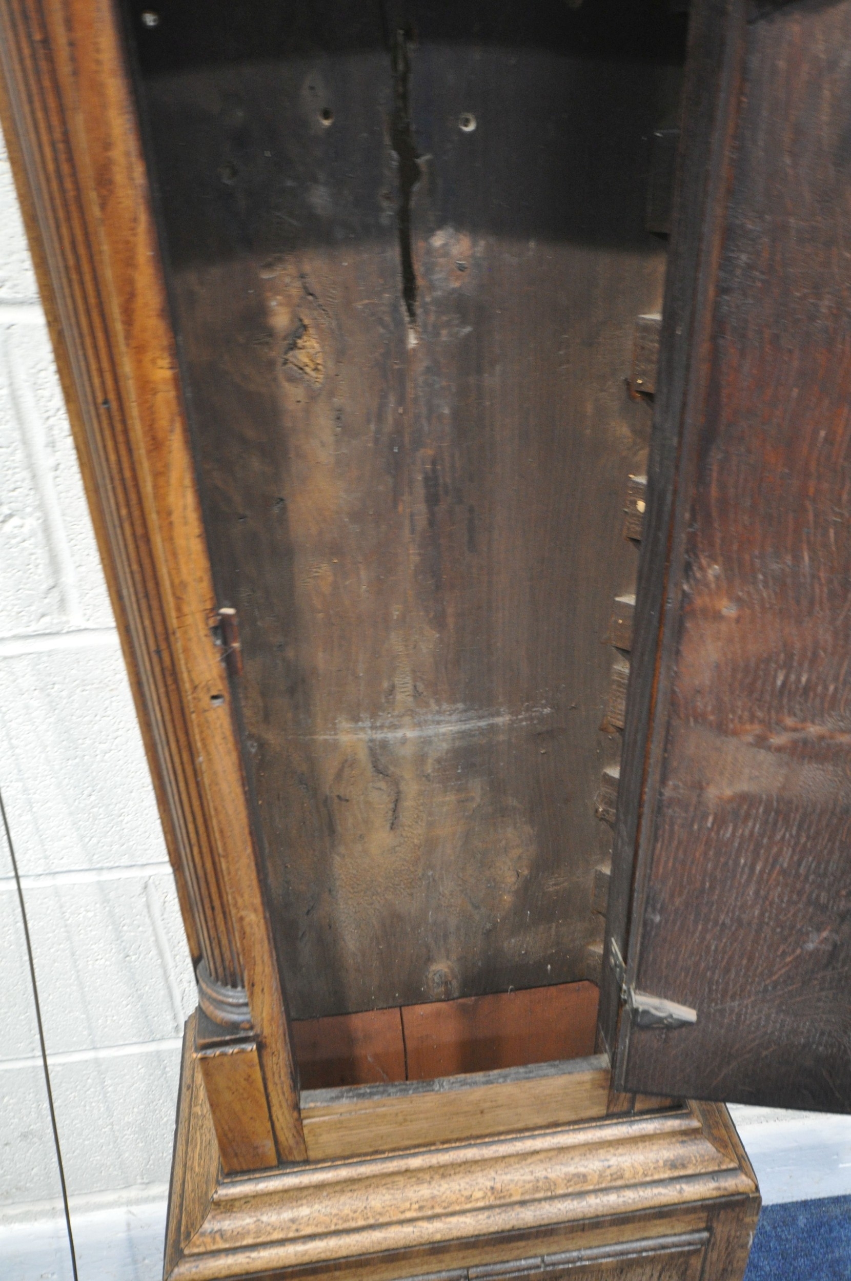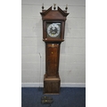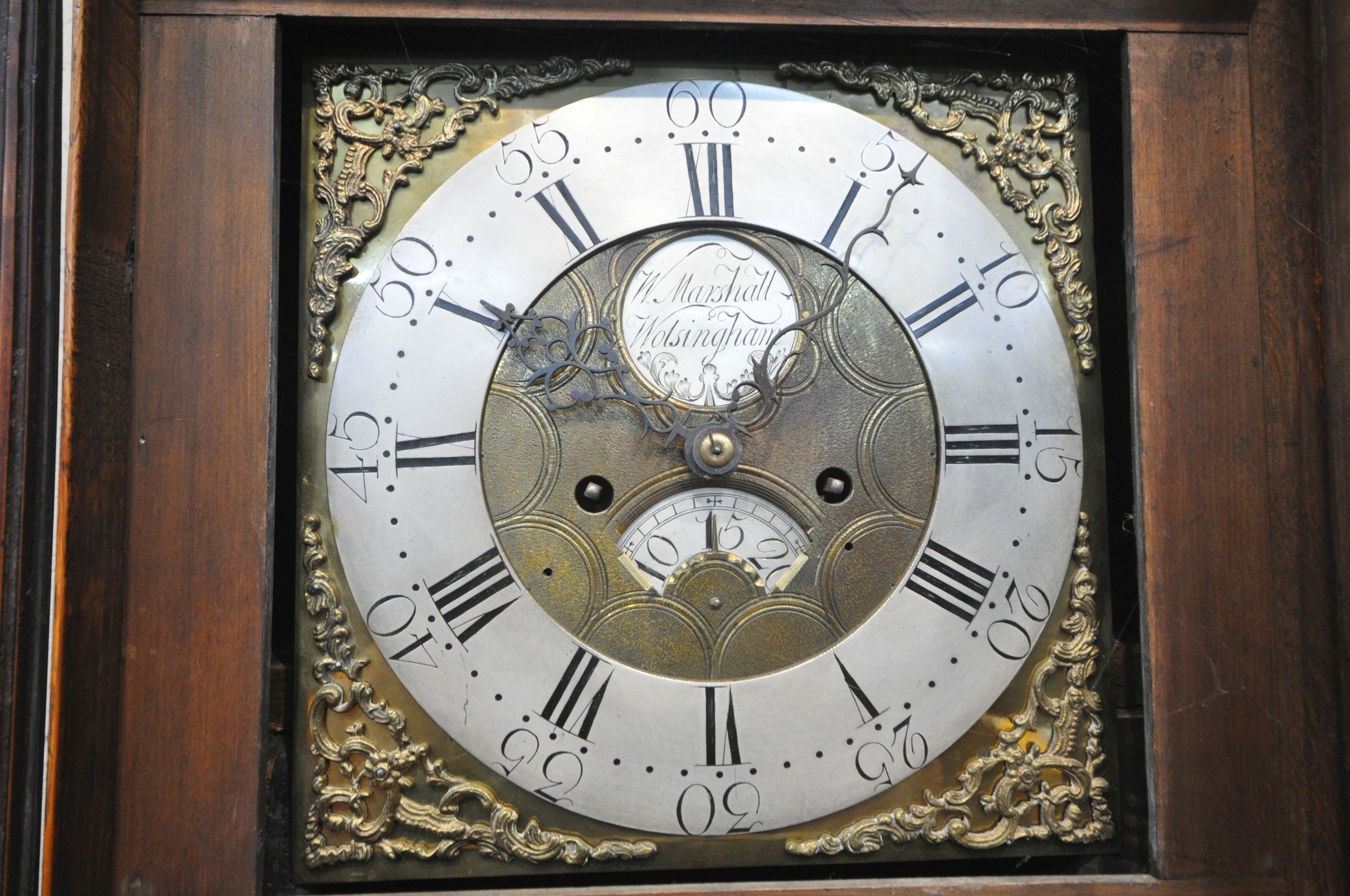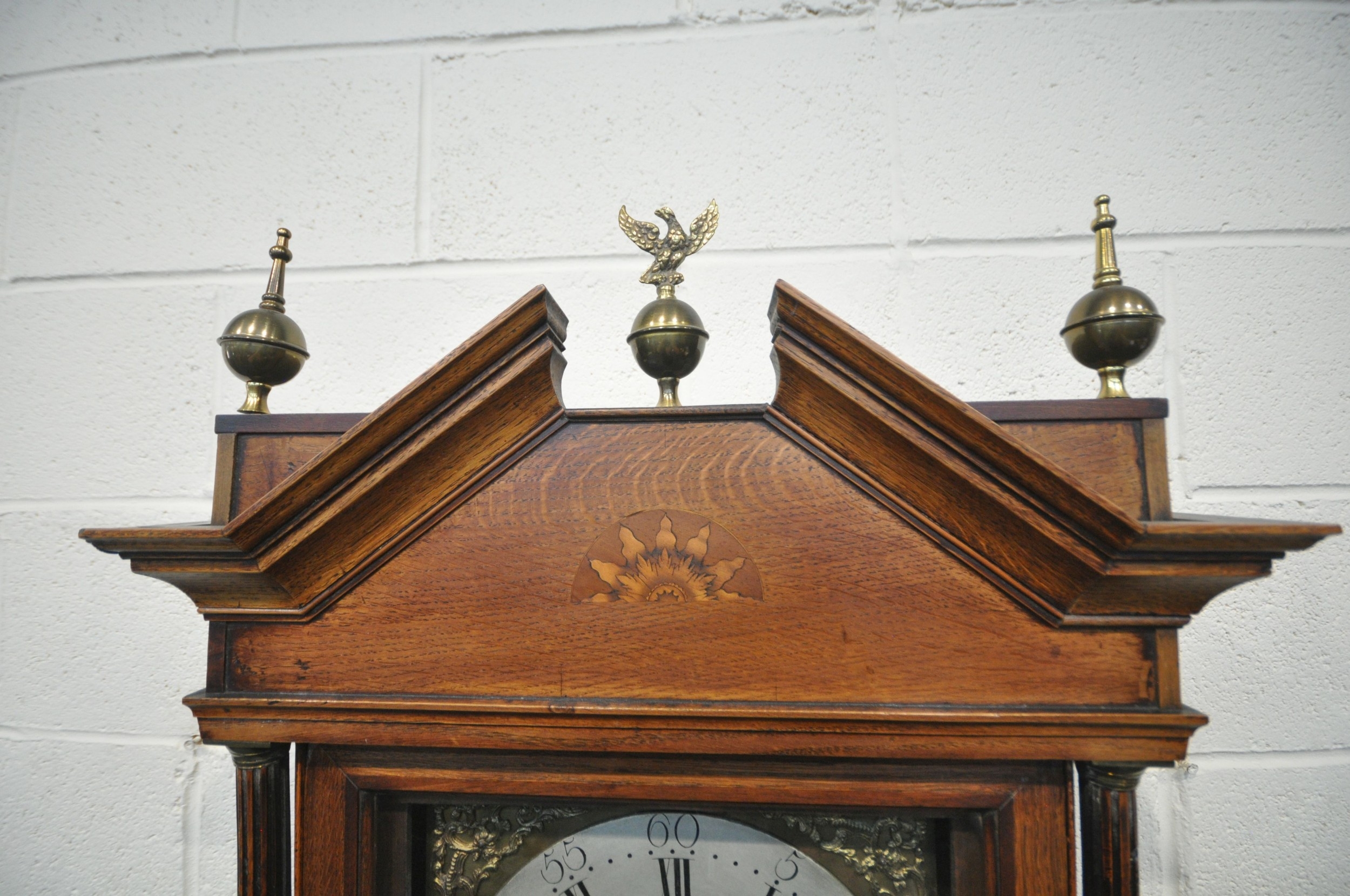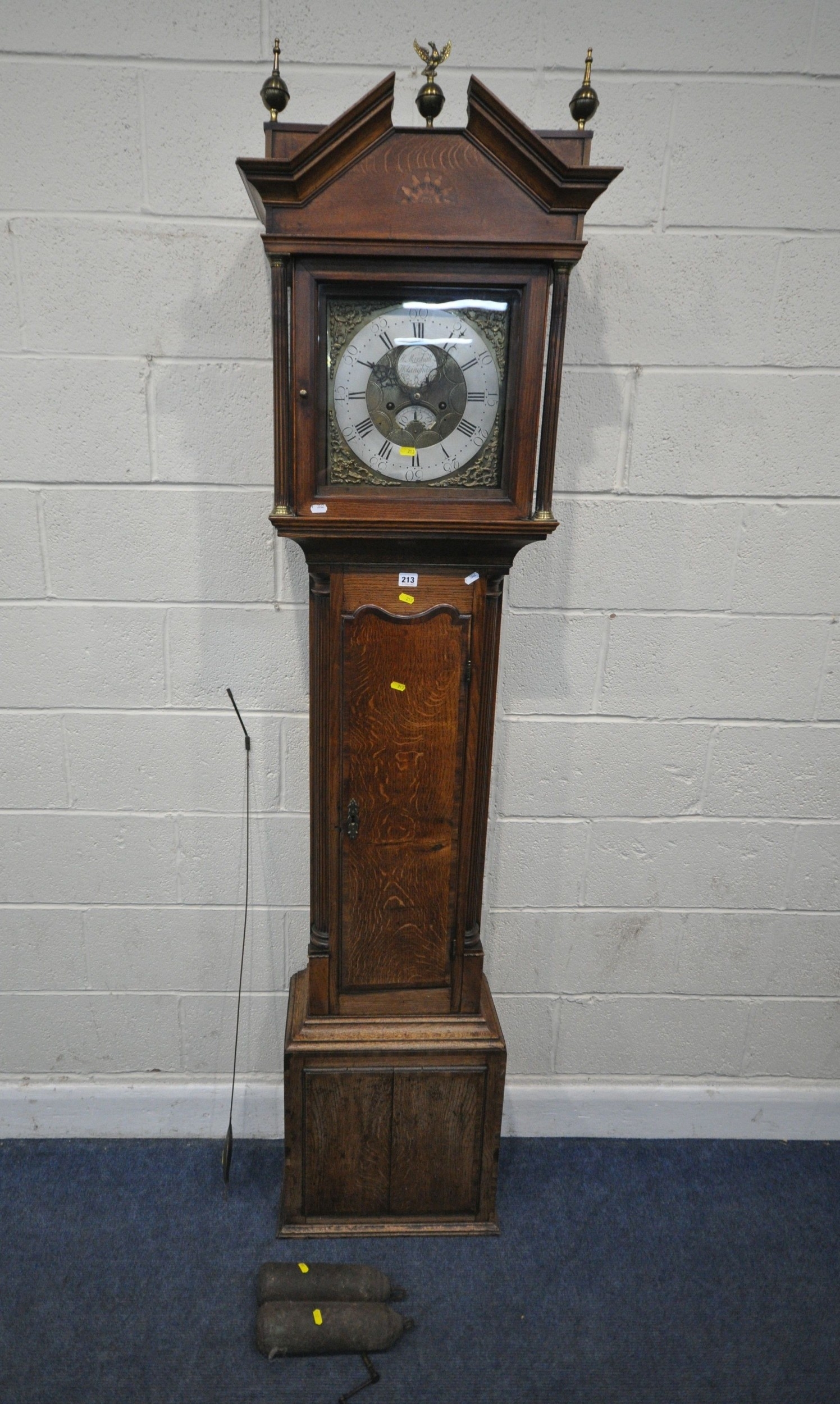 A GEORGIAN OAK EIGHT DAY LONGCASE CLOCK, the hood with a broken arch pediment, three brass finials, the glass door enclosing an 11 inch brass and silvered dial, depicting Roman and Arabic numerals, signed W Marshall Wolsingham, above a single trunk door, on a box plinth, height 214cm, condition report: untested, historical woodworm, marks, scuffs, discolouration, splits, one pendulum, one winding key, two weights, other wear and usage