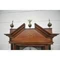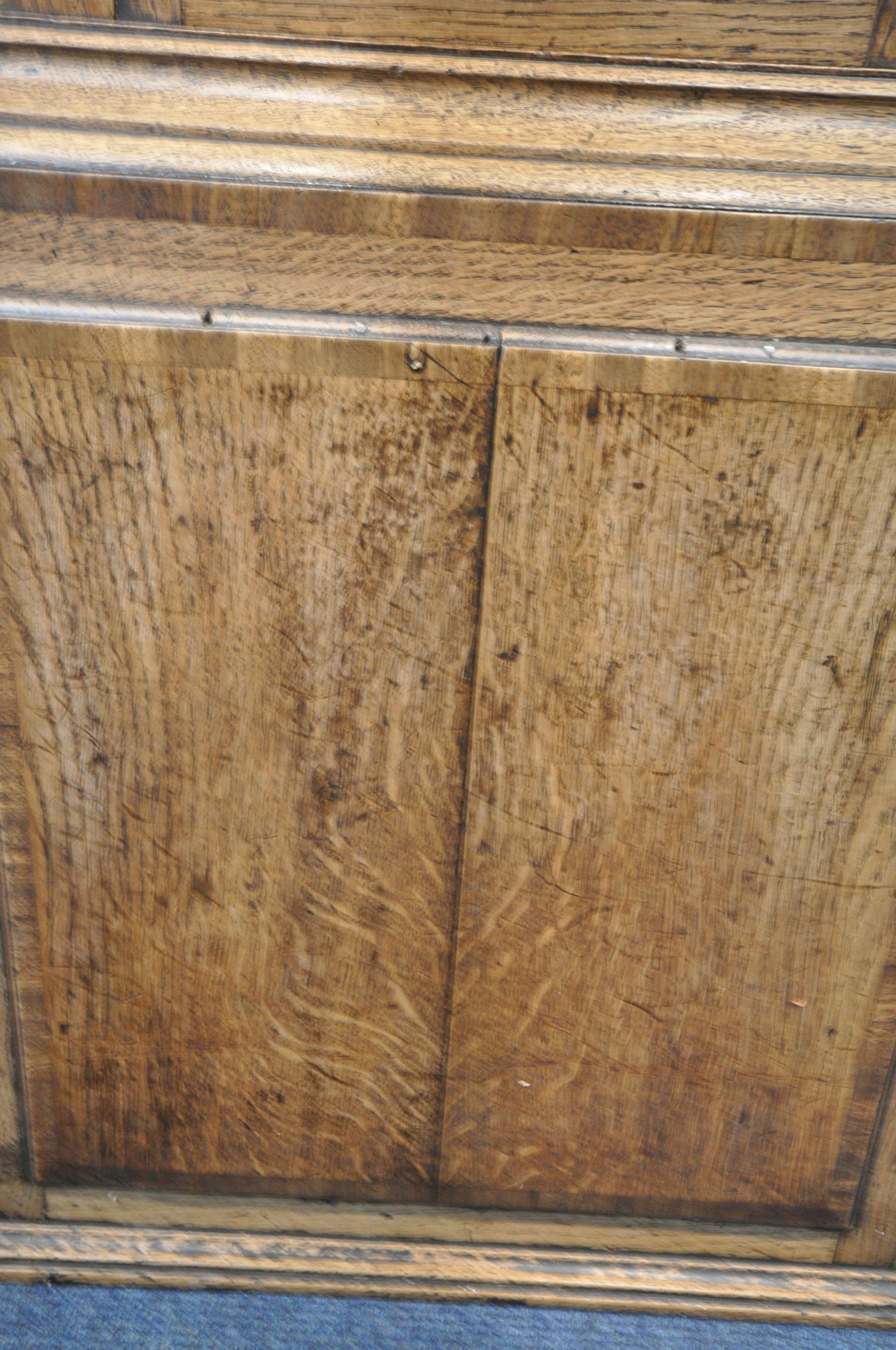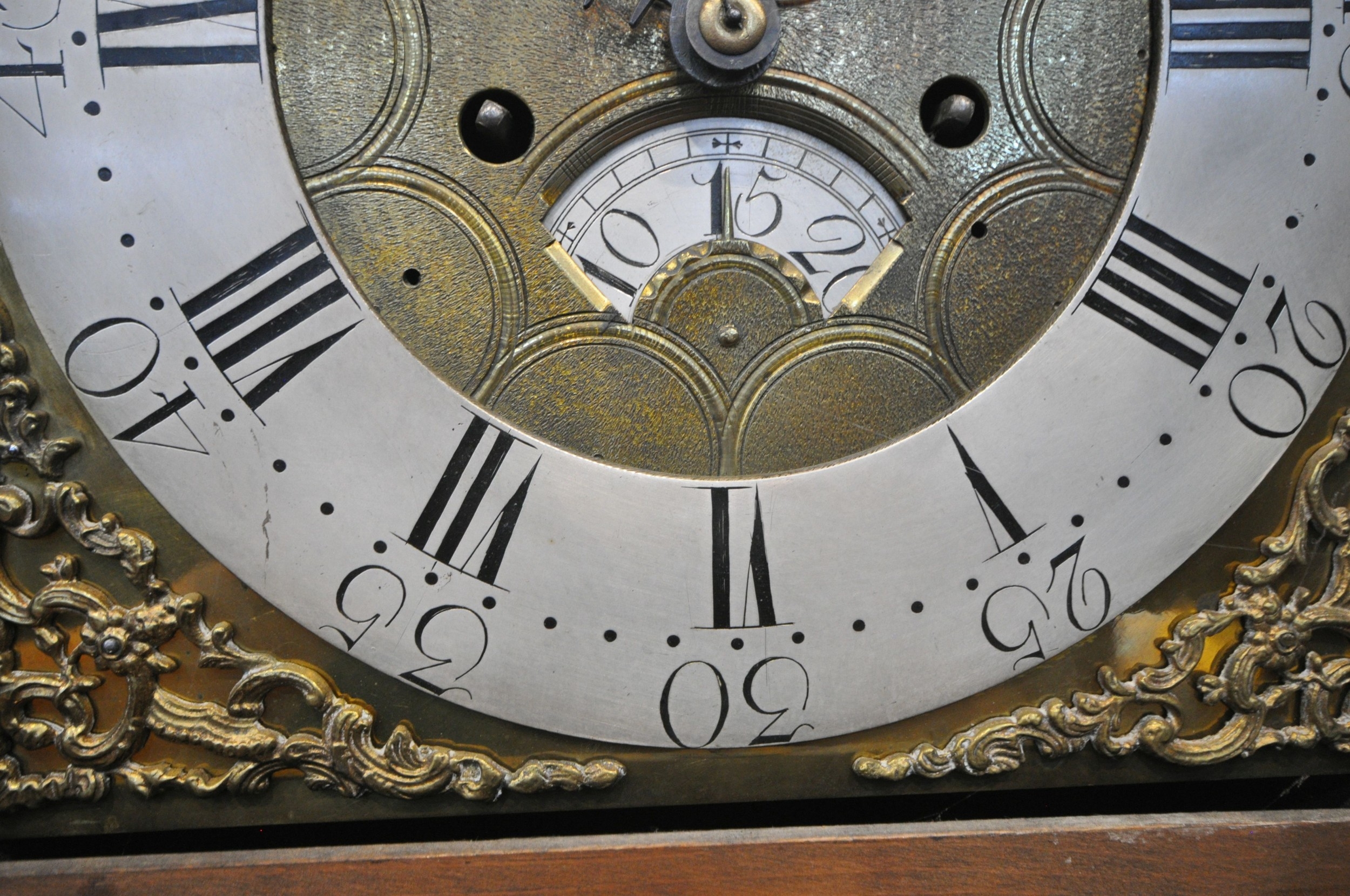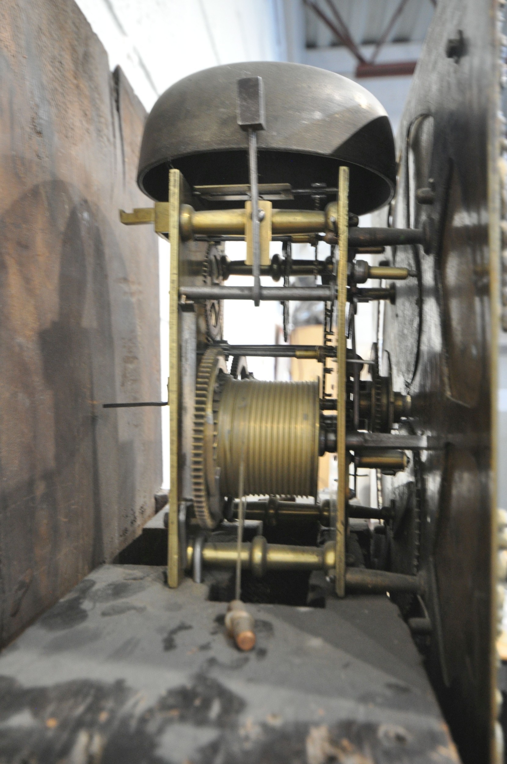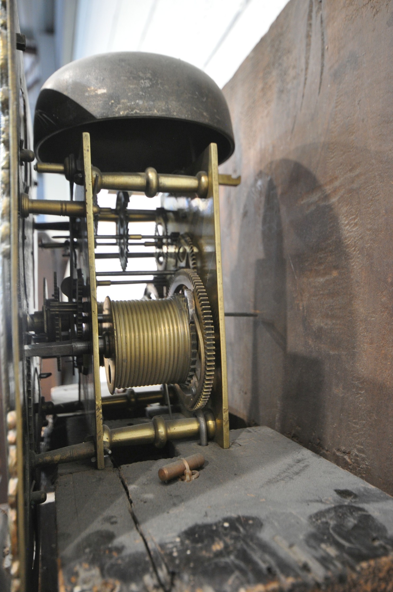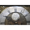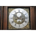 A GEORGIAN OAK EIGHT DAY LONGCASE CLOCK, the hood with a broken arch pediment, three brass finials, the glass door enclosing an 11 inch brass and silvered dial, depicting Roman and Arabic numerals, signed W Marshall Wolsingham, above a single trunk door, on a box plinth, height 214cm, condition report: untested, historical woodworm, marks, scuffs, discolouration, splits, one pendulum, one winding key, two weights, other wear and usage