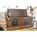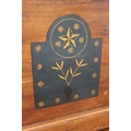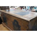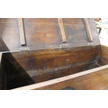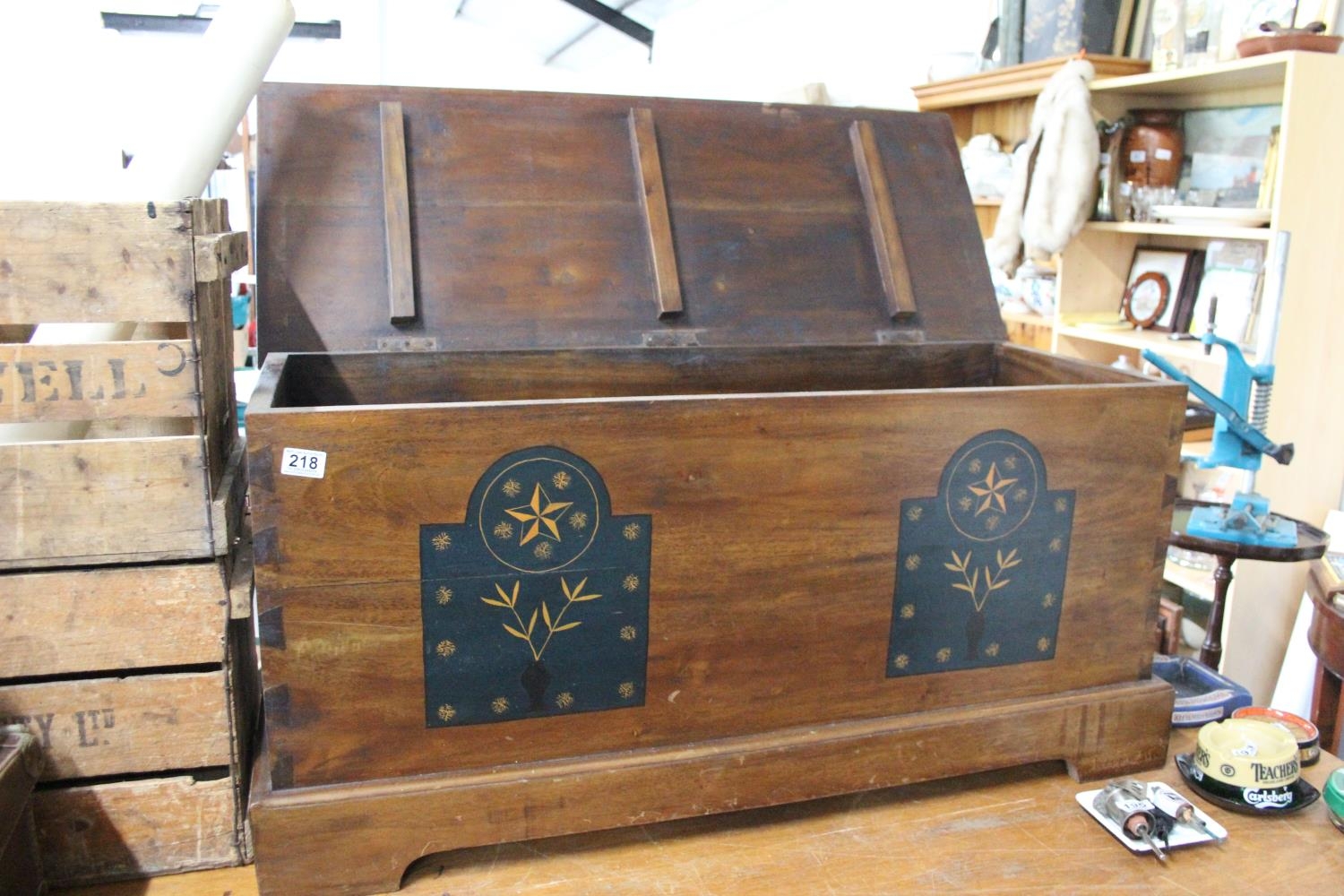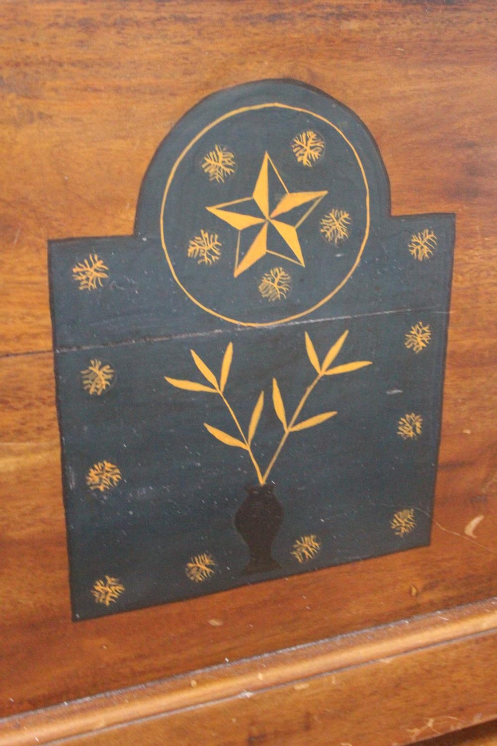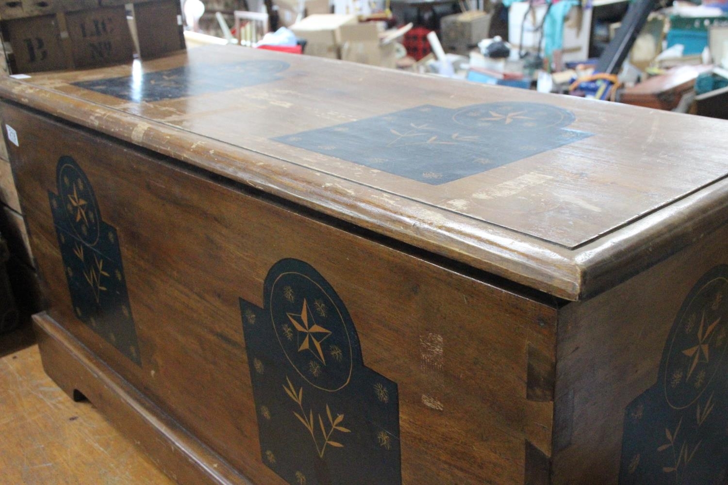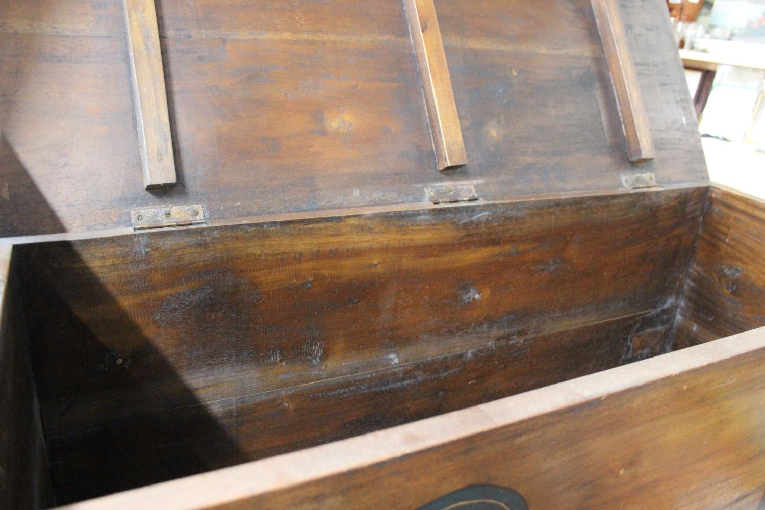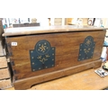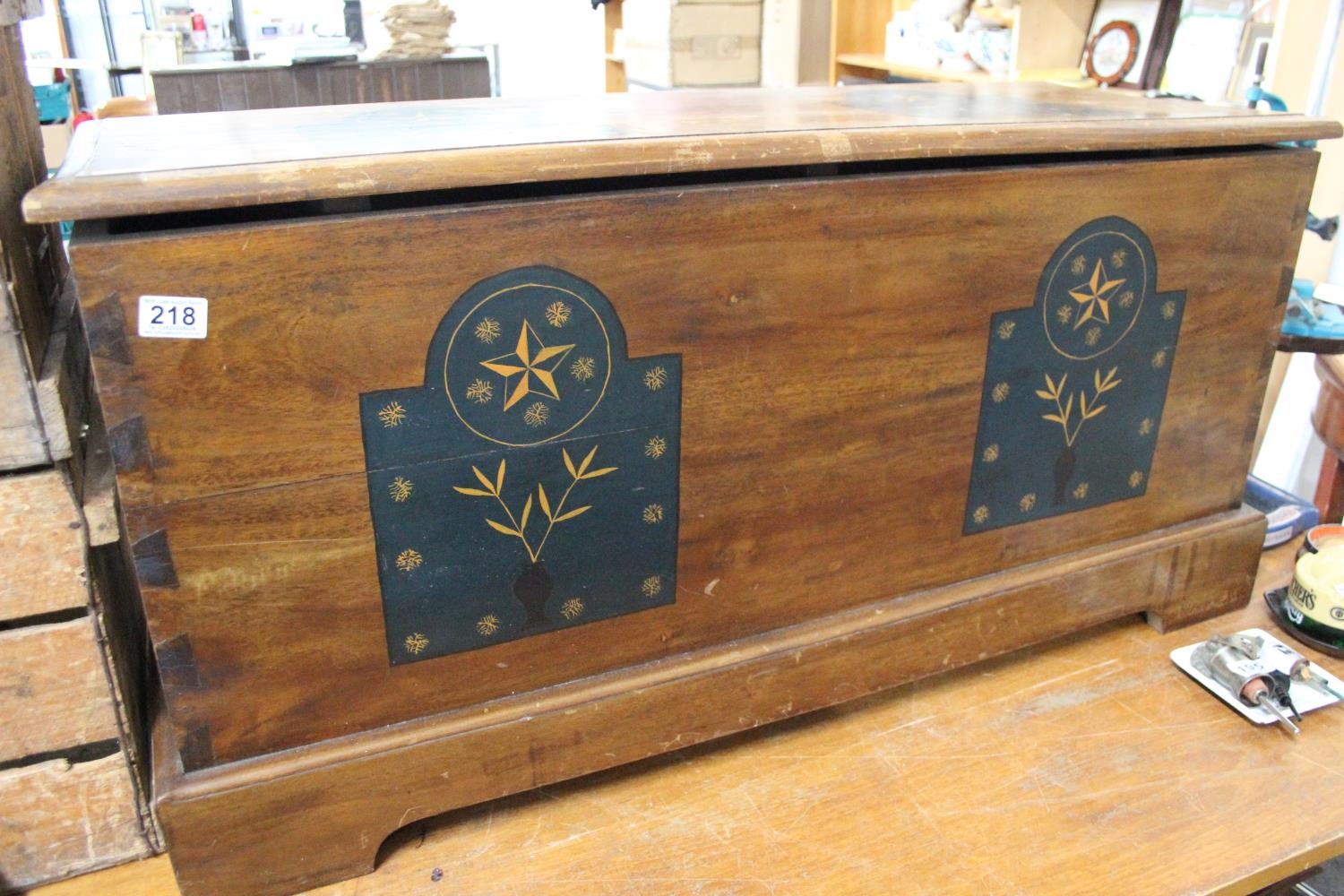 A wooden blanket chest with decorative detail.